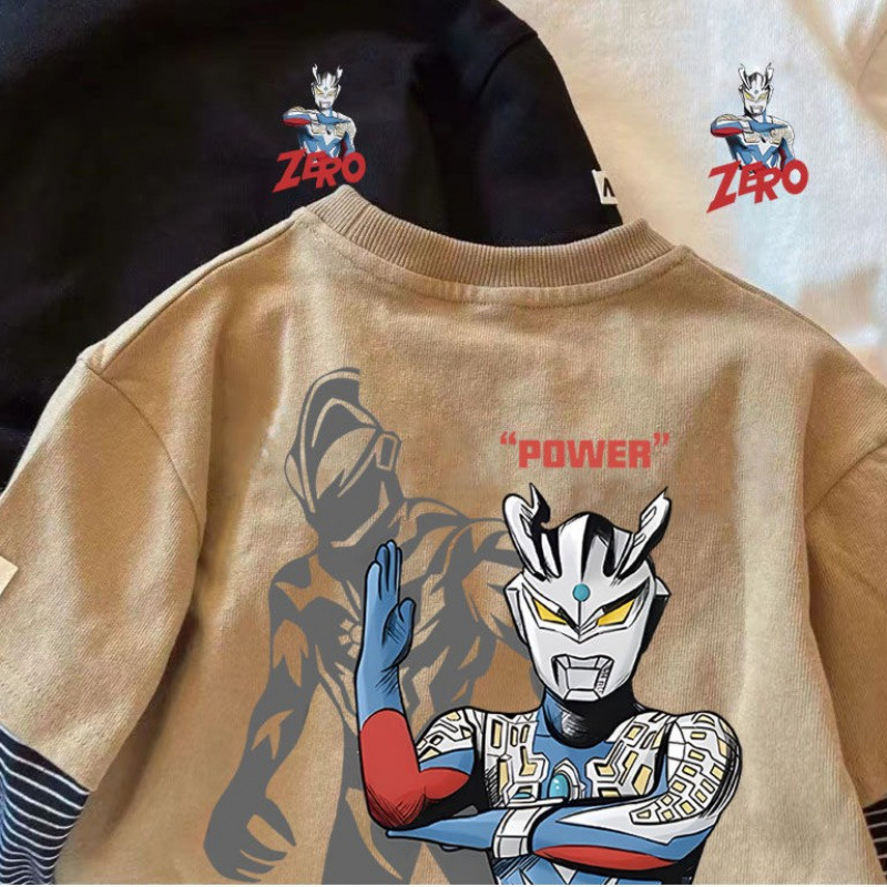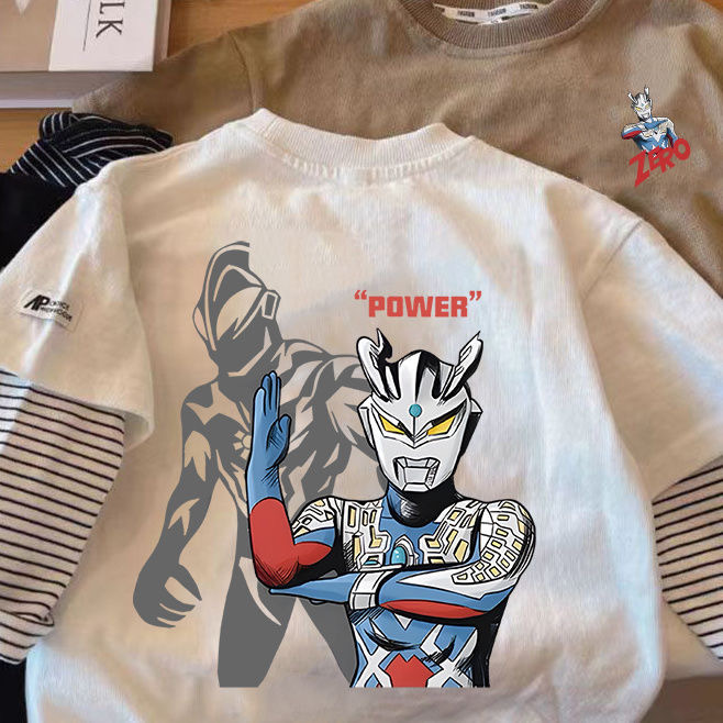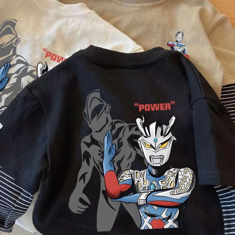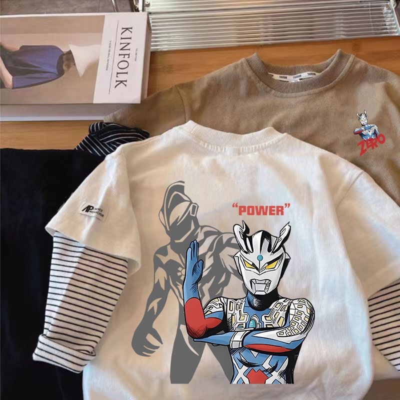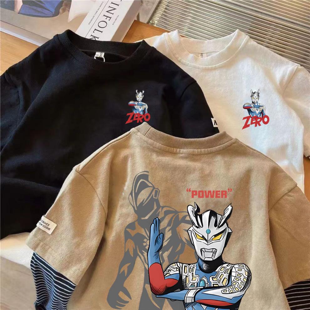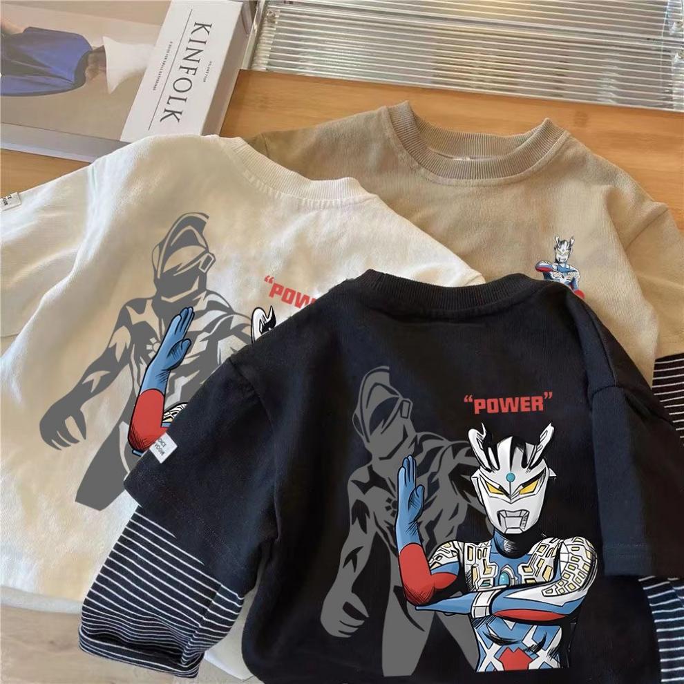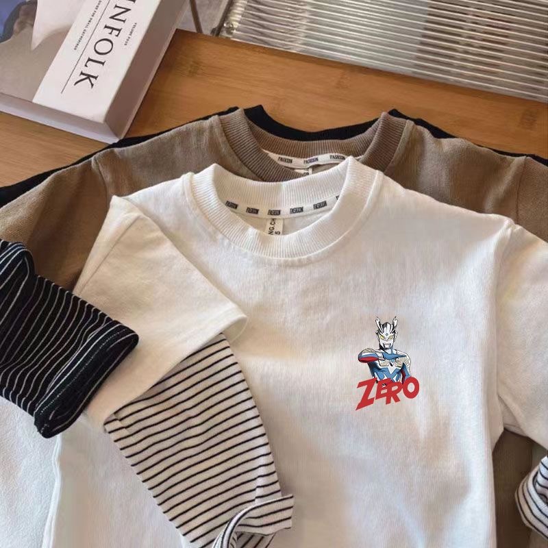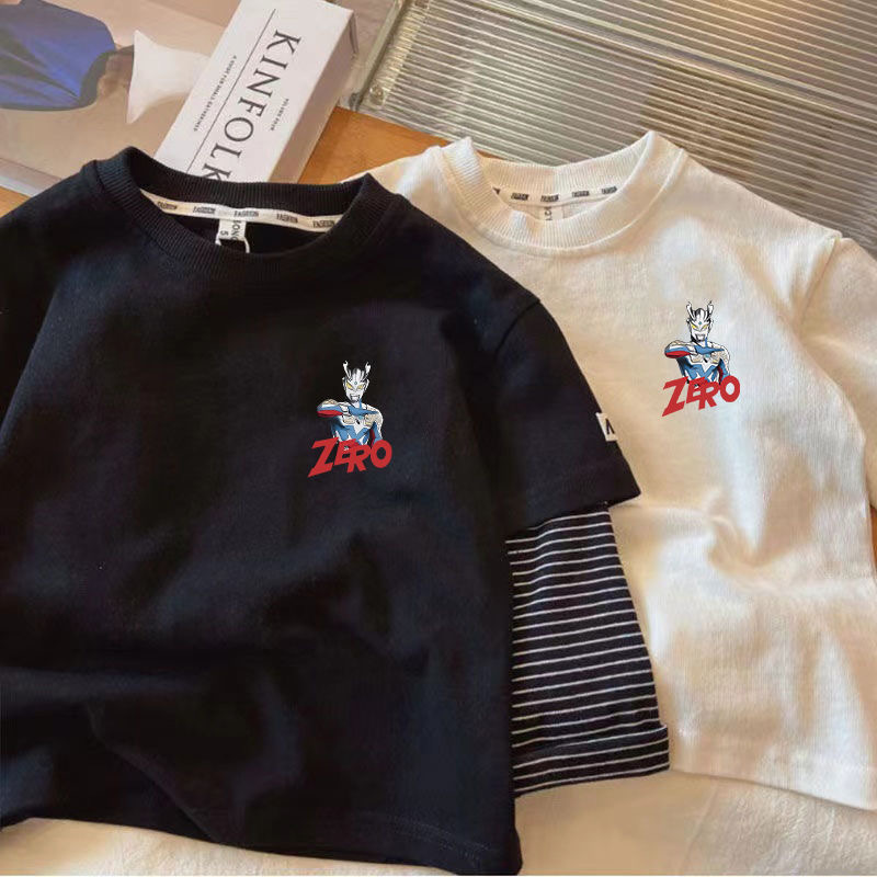 코튼 어린이 긴팔 티셔츠 한국 스타일 가짜 투피스 중소형 어린이 크루 넥 스티칭 만화 봄과 가을 어린이 톱 보이 티셔츠
