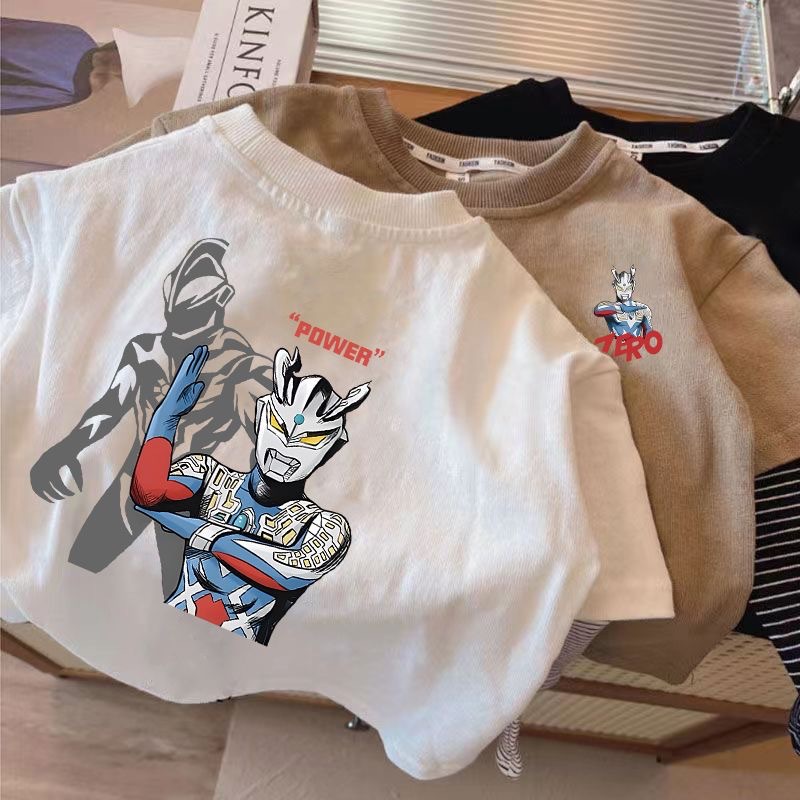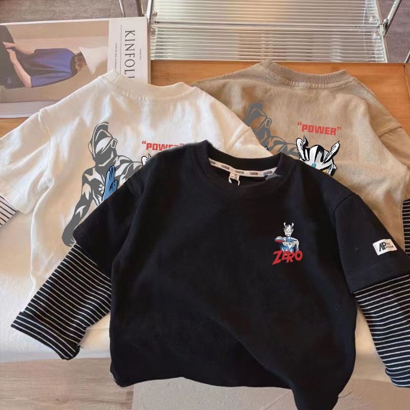 코튼 어린이 긴팔 티셔츠 한국 스타일 가짜 투피스 중소형 어린이 크루 넥 스티칭 만화 봄과 가을 어린이 톱 보이 티셔츠스토어 가기