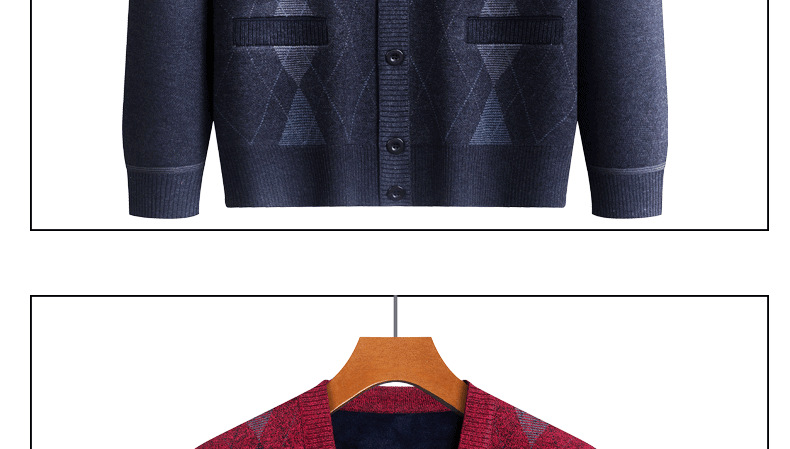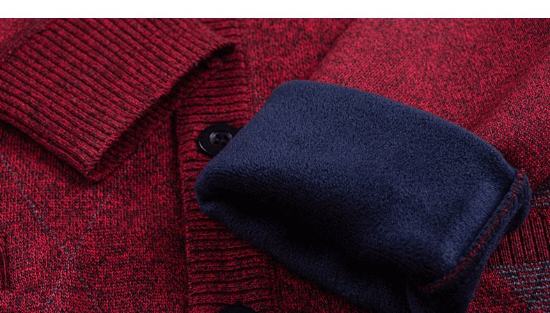가을과 겨울 중년 남성의 따뜻한 기모 두꺼운 코트 북부 레드 긴 소매 단색 자카드 기모 카디건