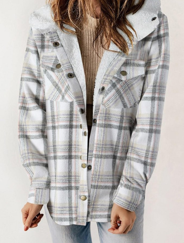 2025 가을, 겨울 새로운 스타일 포켓 캐주얼 격자 무늬 셔츠 후드 모직 자켓 여성 유럽과 미국의 벨벳 따뜻한 자켓 여성스토어 가기