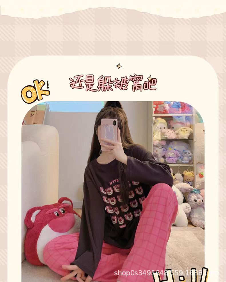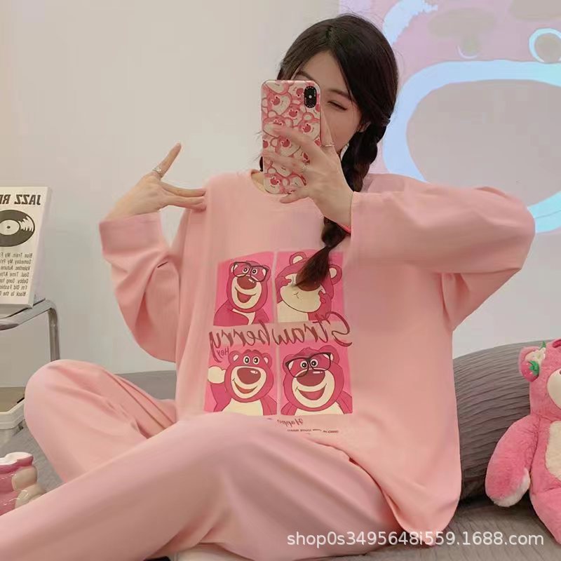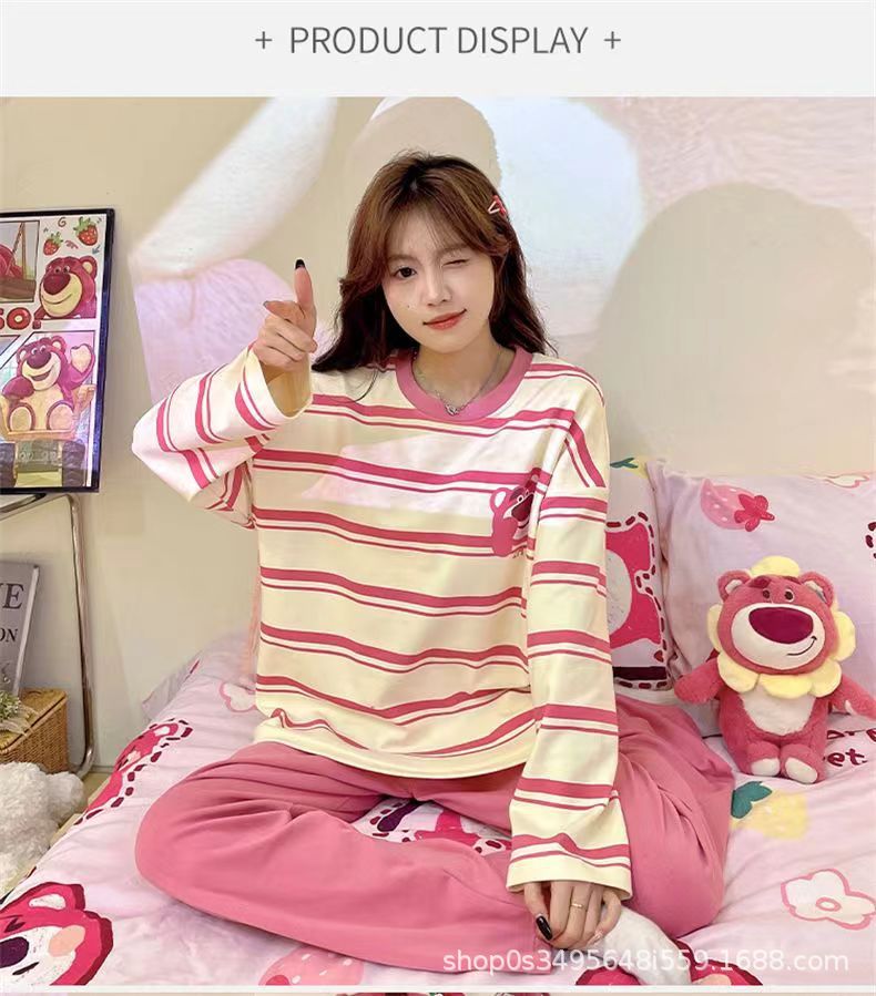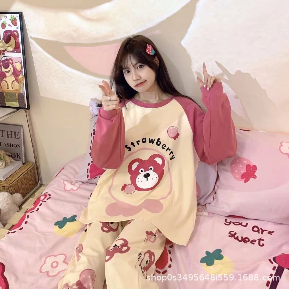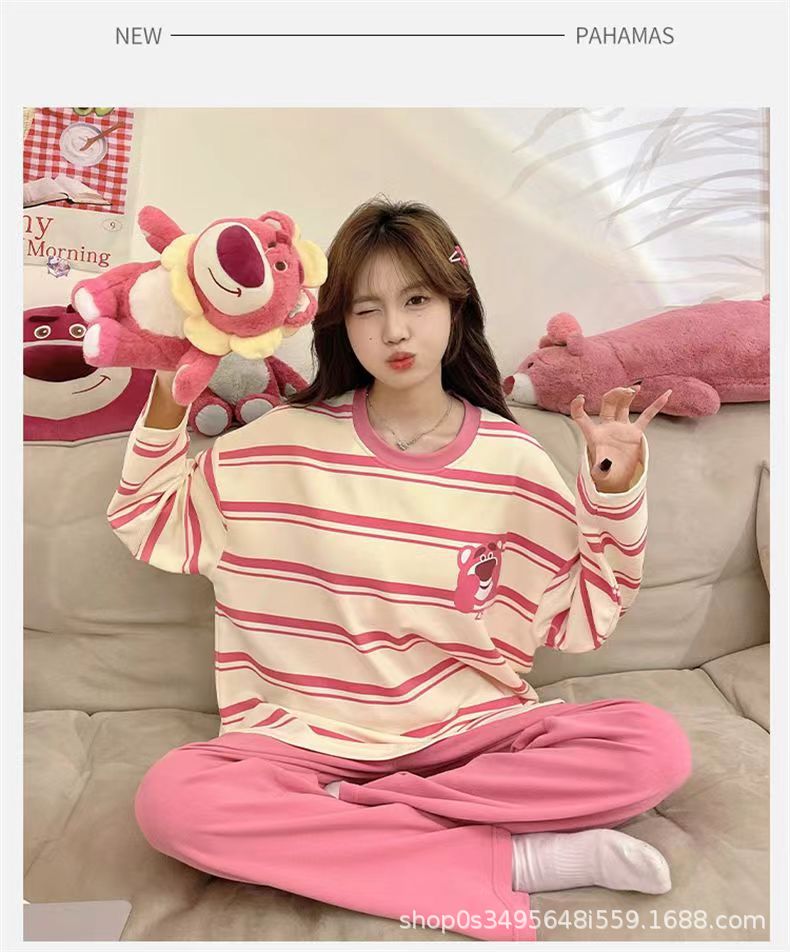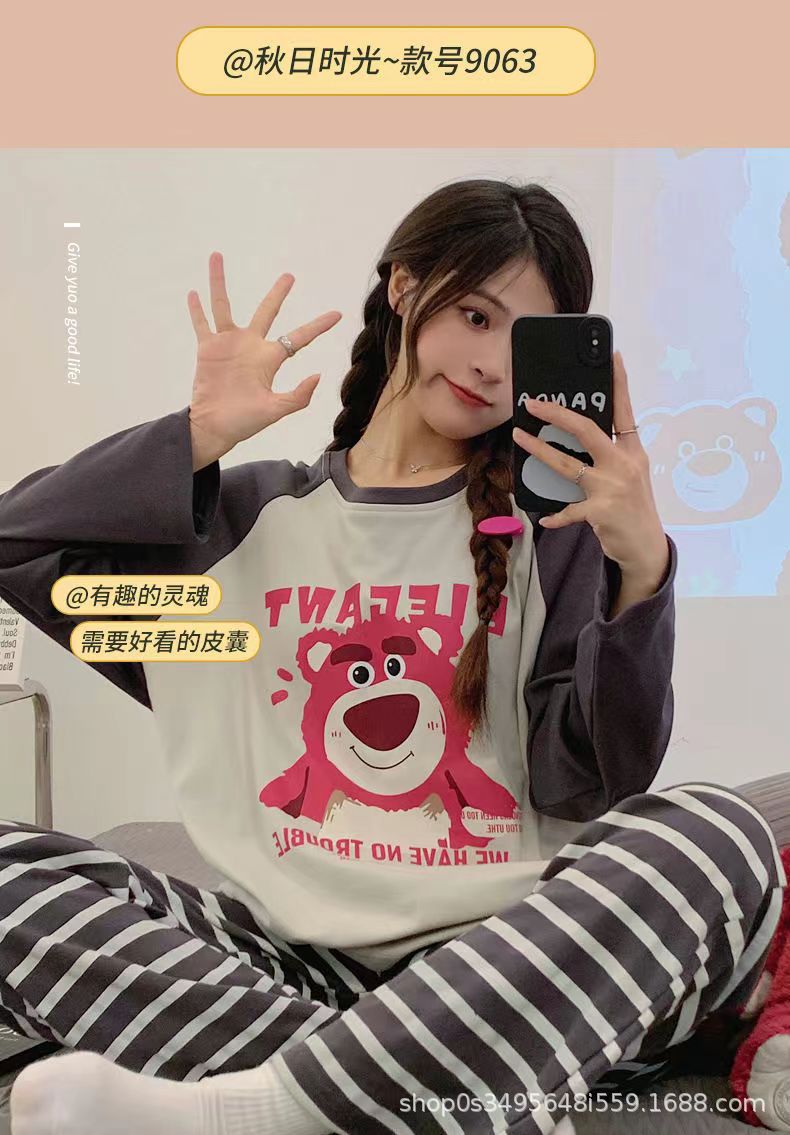 국경을 넘나 드는 유럽과 미국의 가을 새 딸기 곰 긴팔 바지 파자마 여성용 루즈 심플 아웃웨어 투피스 세트스토어 가기