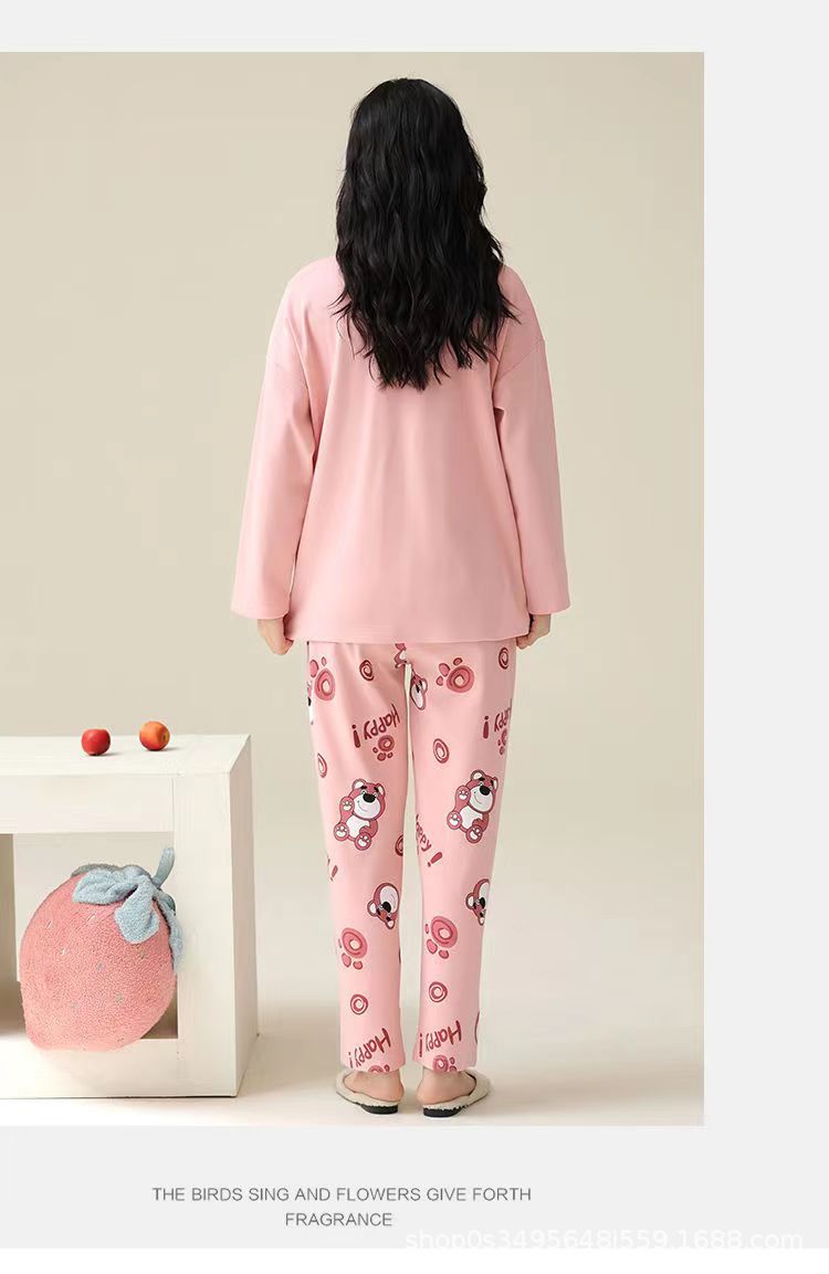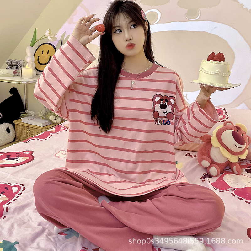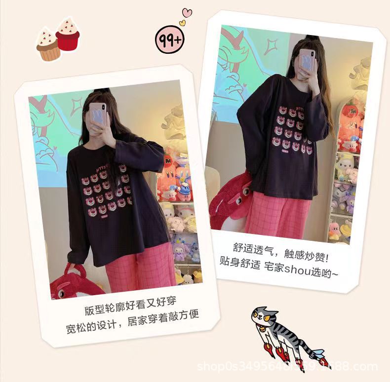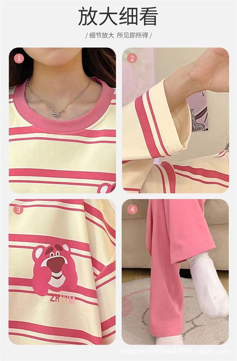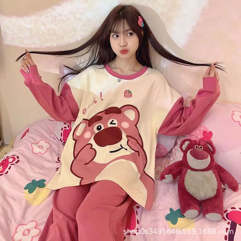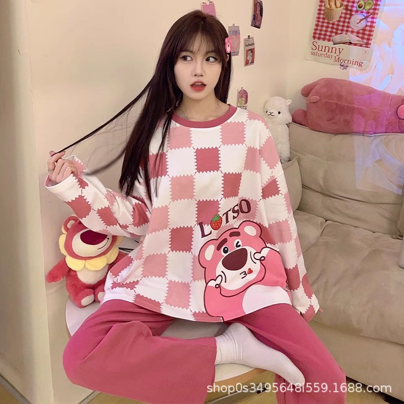 국경을 넘나 드는 유럽과 미국의 가을 새 딸기 곰 긴팔 바지 파자마 여성용 루즈 심플 아웃웨어 투피스 세트스토어 가기