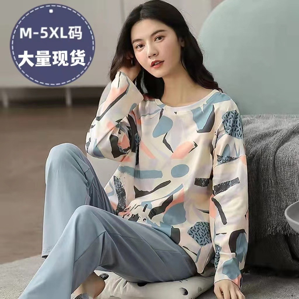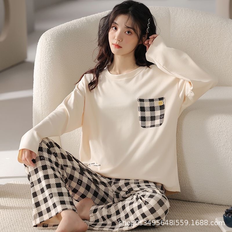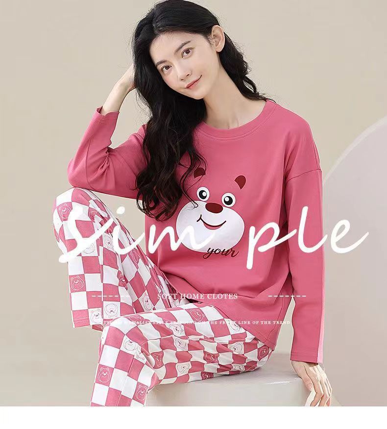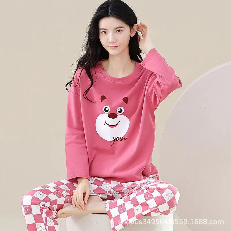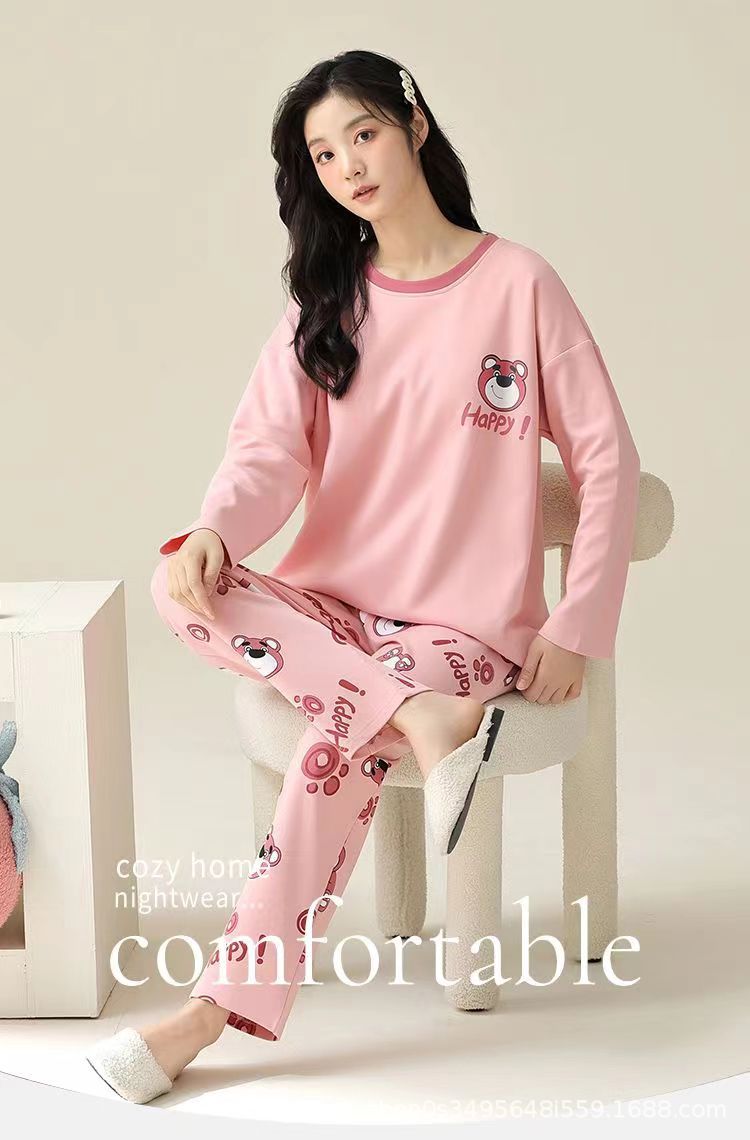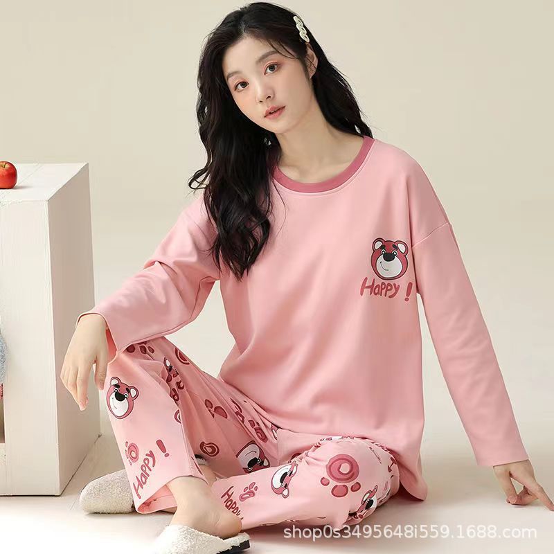 국경을 넘나 드는 유럽과 미국의 가을 새 딸기 곰 긴팔 바지 파자마 여성용 루즈 심플 아웃웨어 투피스 세트스토어 가기