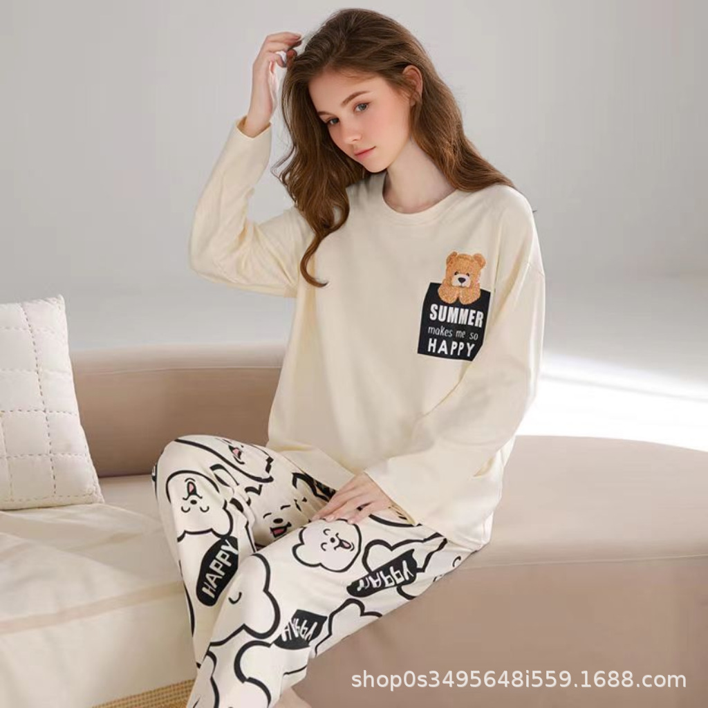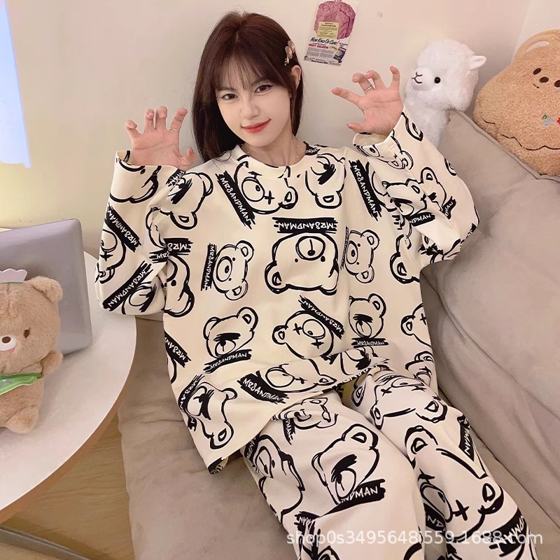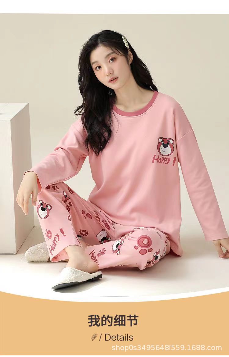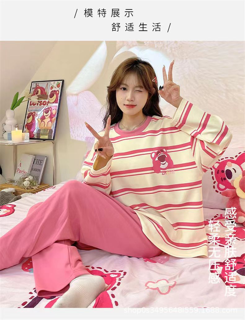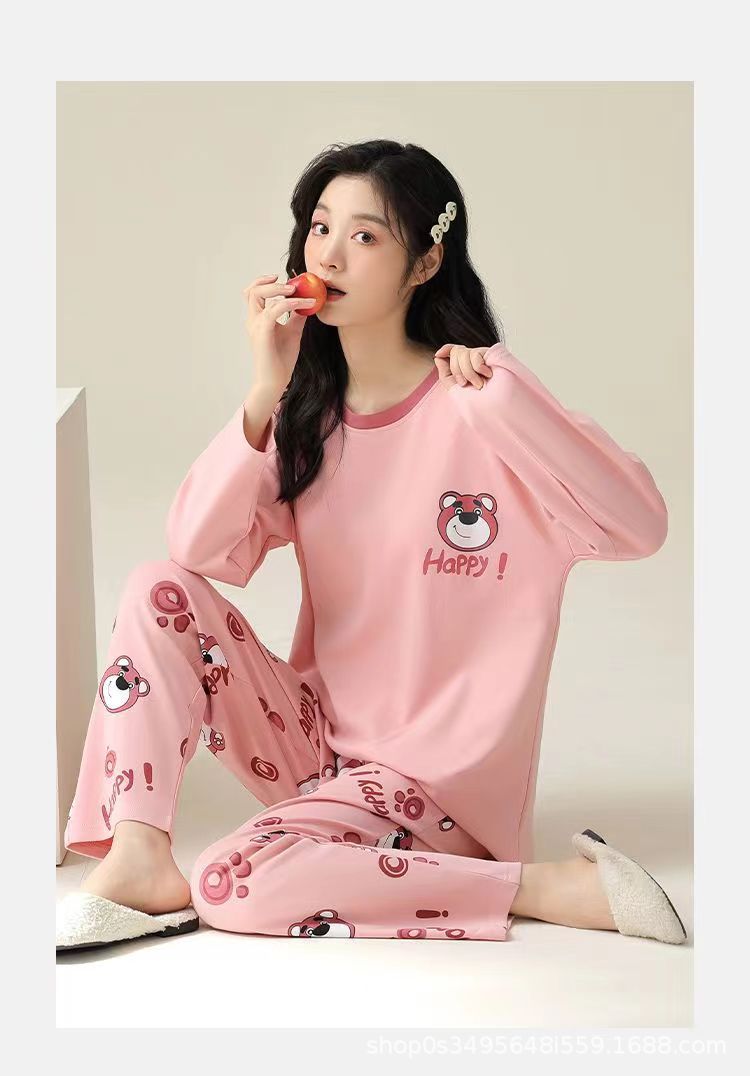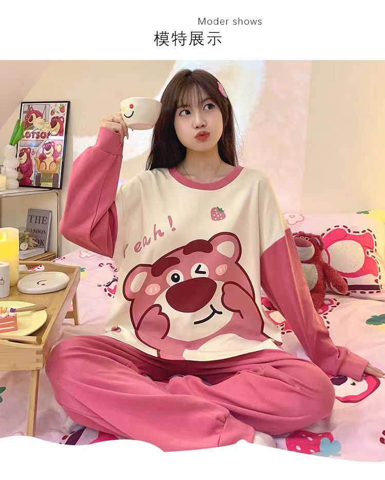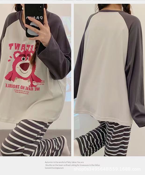 국경을 넘나 드는 유럽과 미국의 가을 새 딸기 곰 긴팔 바지 파자마 여성용 루즈 심플 아웃웨어 투피스 세트
