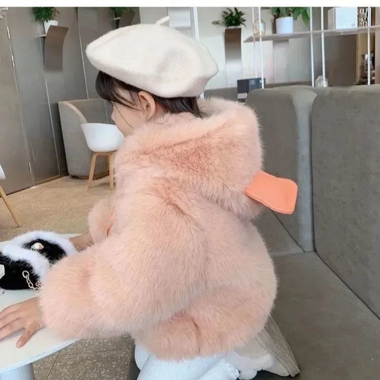여자 겨울 모조 모피 2024 새로운 한국어 스타일 두꺼운 어린 소녀 모피 스웨터 서양식 후드 아동 코트