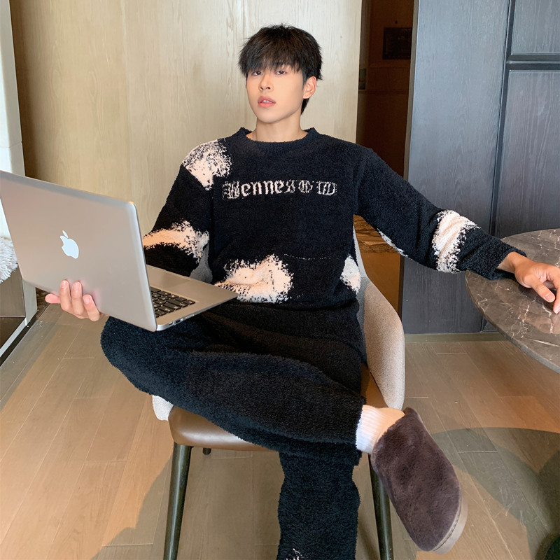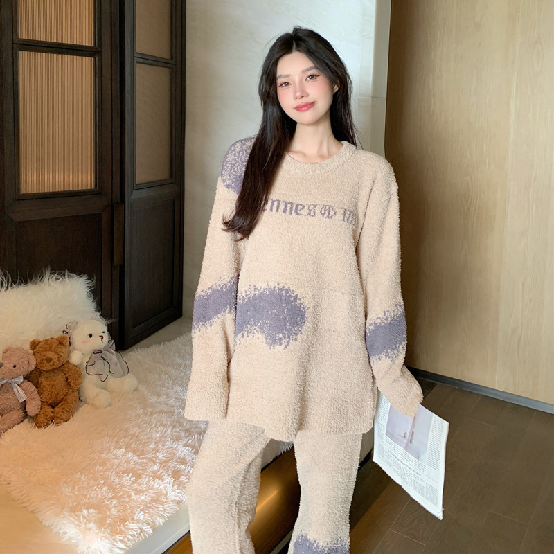 새로운 반쪽 벨벳 커플 홈 의류 여성용 부드러운 풀오버 세트 두꺼운 느슨한 긴팔 잠옷 홈 의류