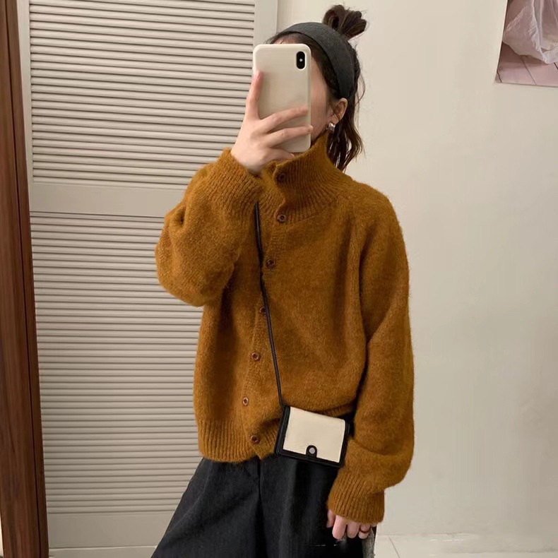 대외 무역 새로운 높은 칼라 나무 버클 긴 소매 봉제 카디건 여성 한국 스타일 새로운 느슨한 우아한 스웨터 코트 여성