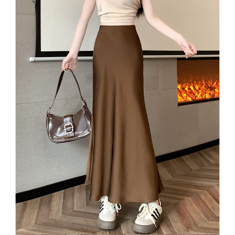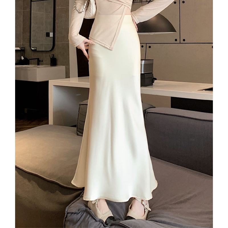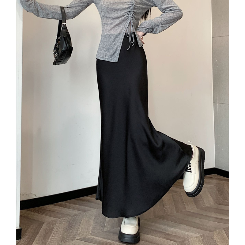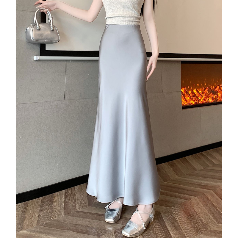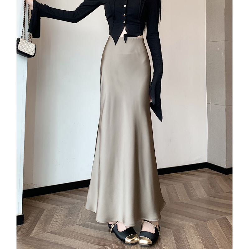 Acetic Acid Satin 스커트 여성의 가을 새로운 높은 허리 더미 피쉬 테일 스커트 롱 스커트스토어 가기
