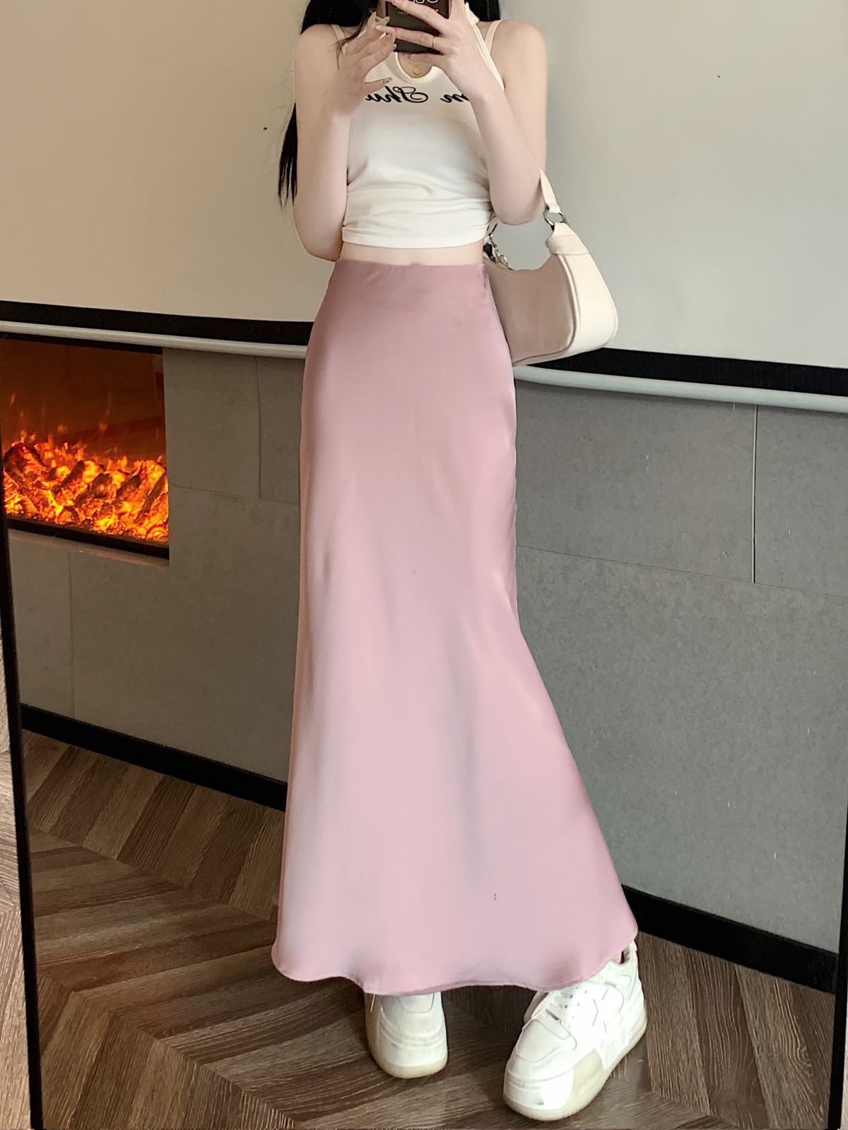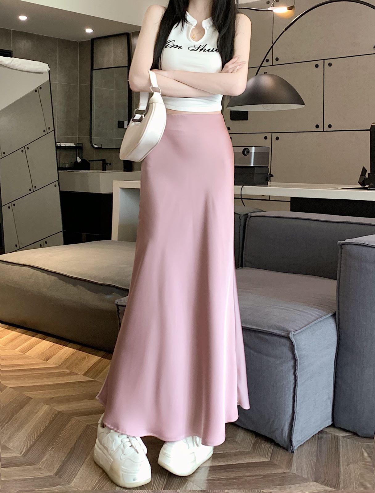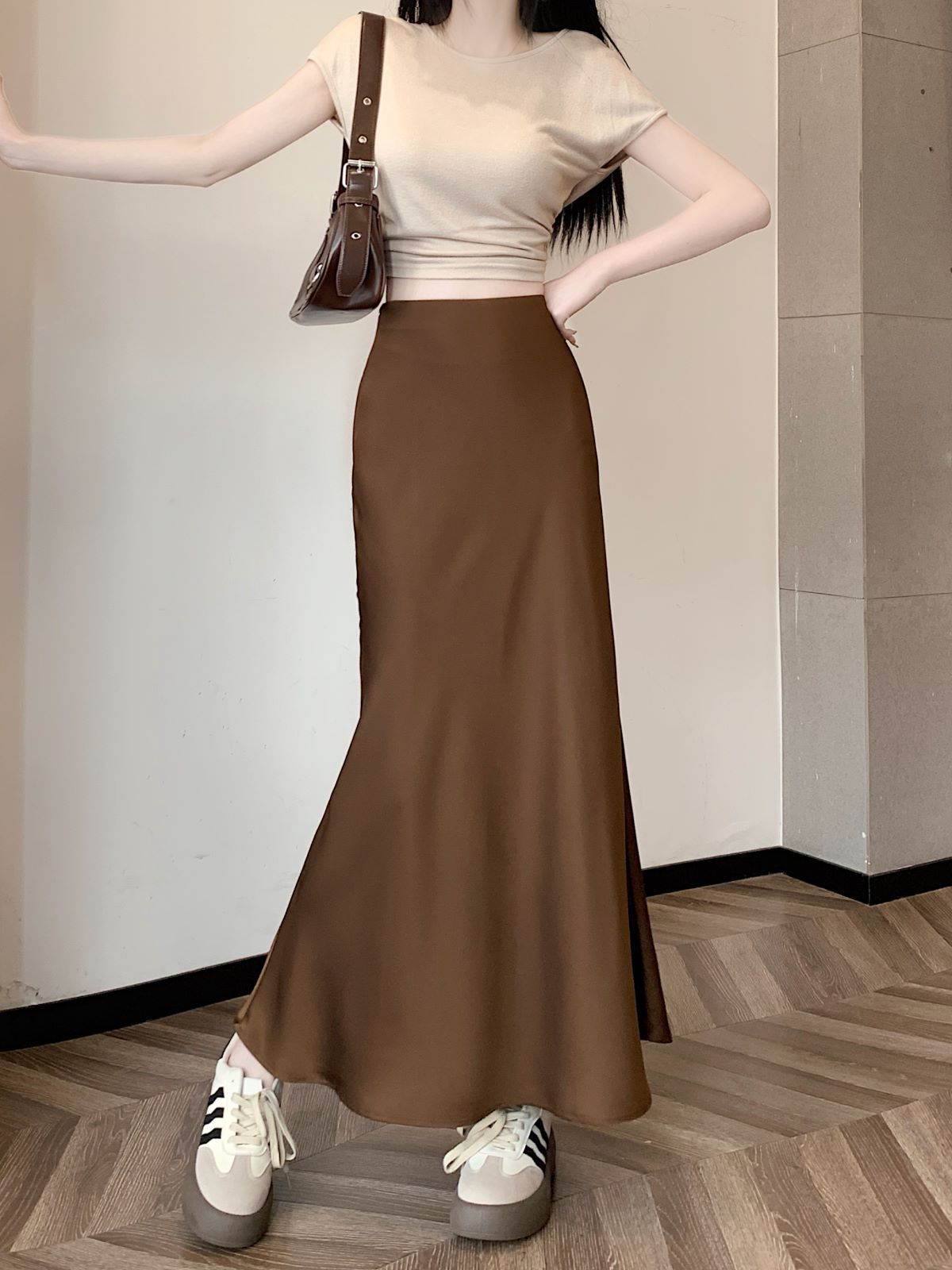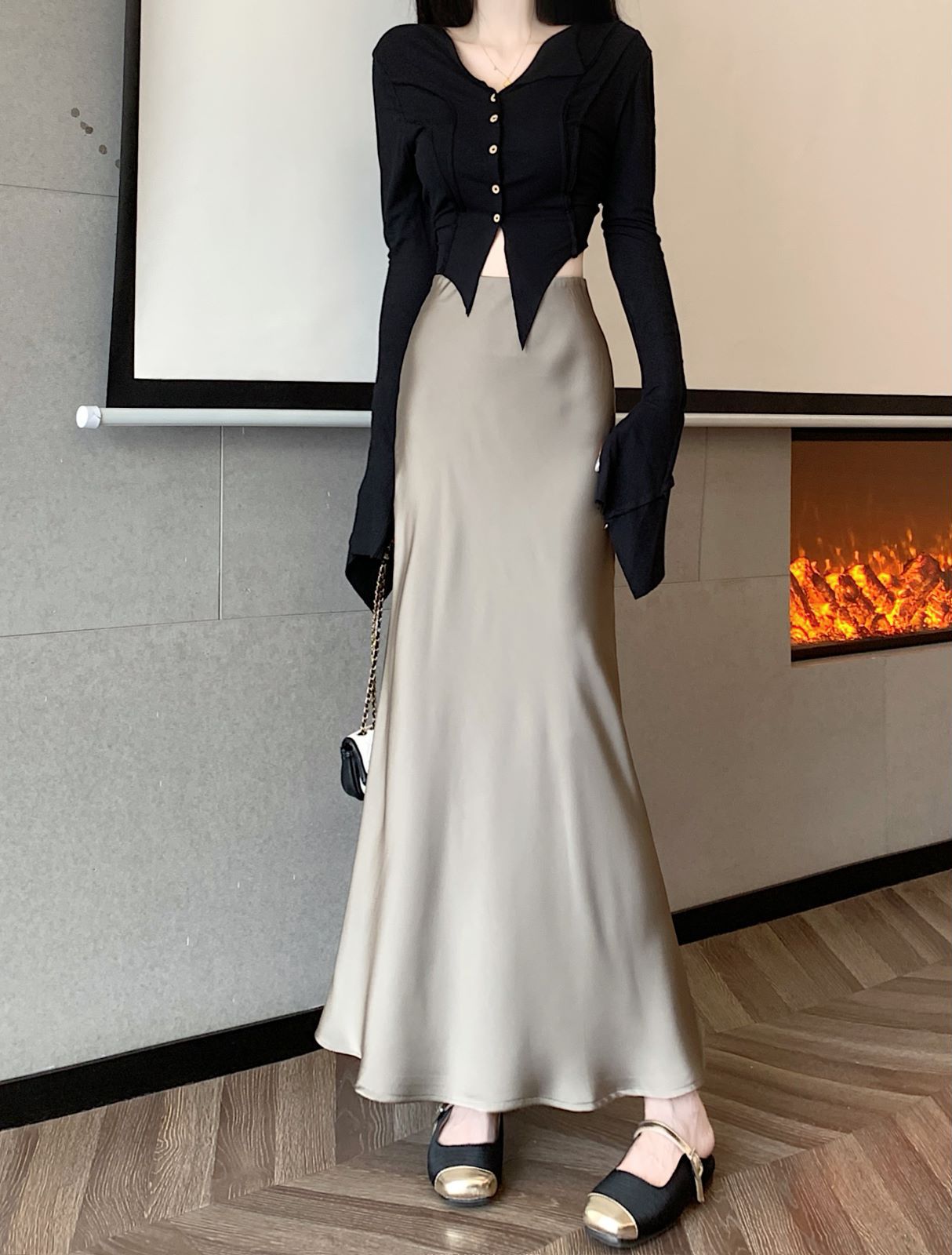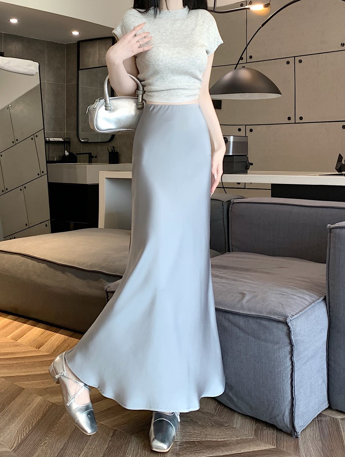 Acetic Acid Satin 스커트 여성의 가을 새로운 높은 허리 더미 피쉬 테일 스커트 롱 스커트
