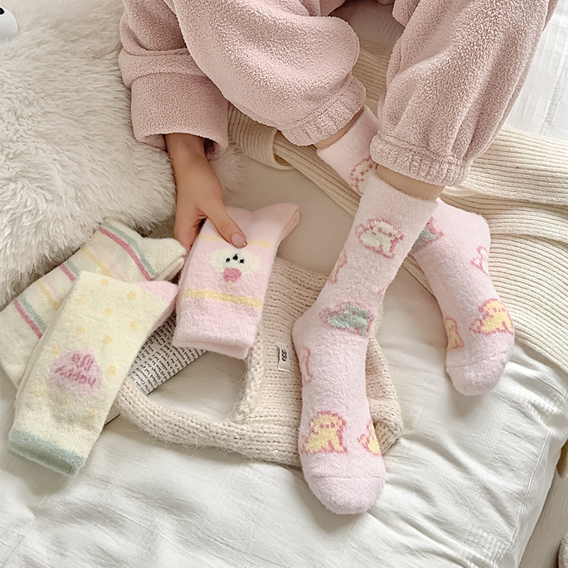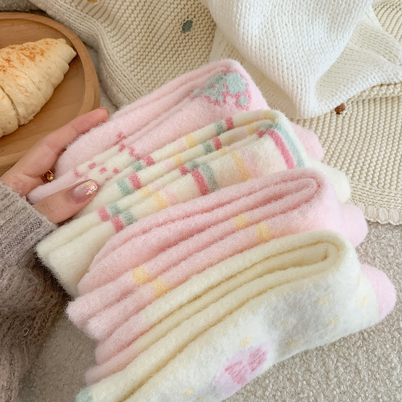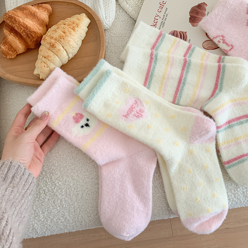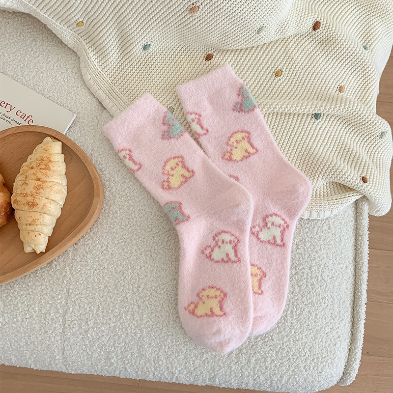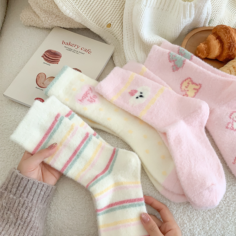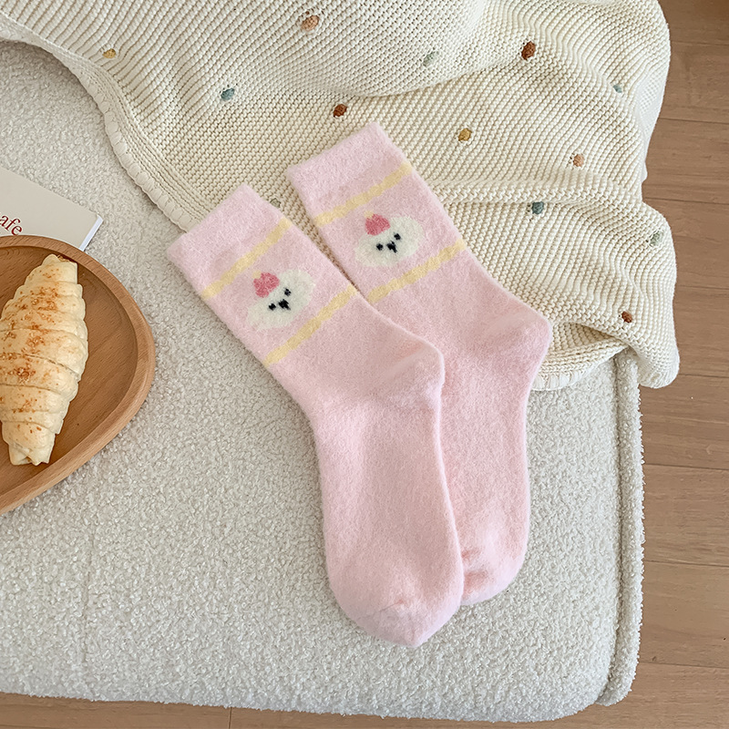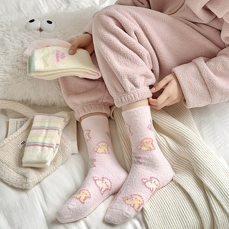 핑크 줄무늬 양말 어린이 중간 양말 가을과 겨울 두꺼운 봉제 수면 양말 일본 달콤한 만화 강아지 더미 양말