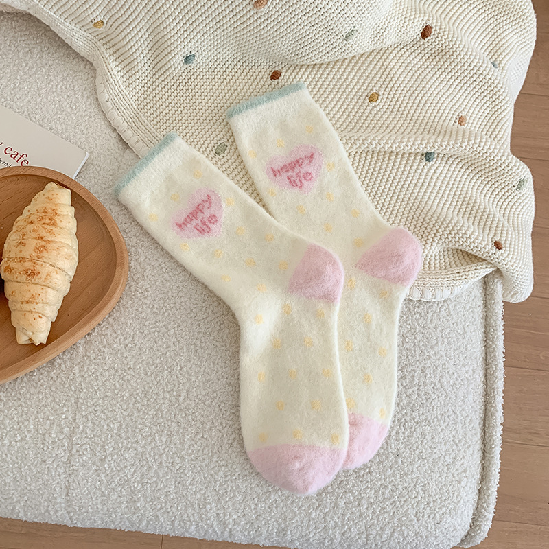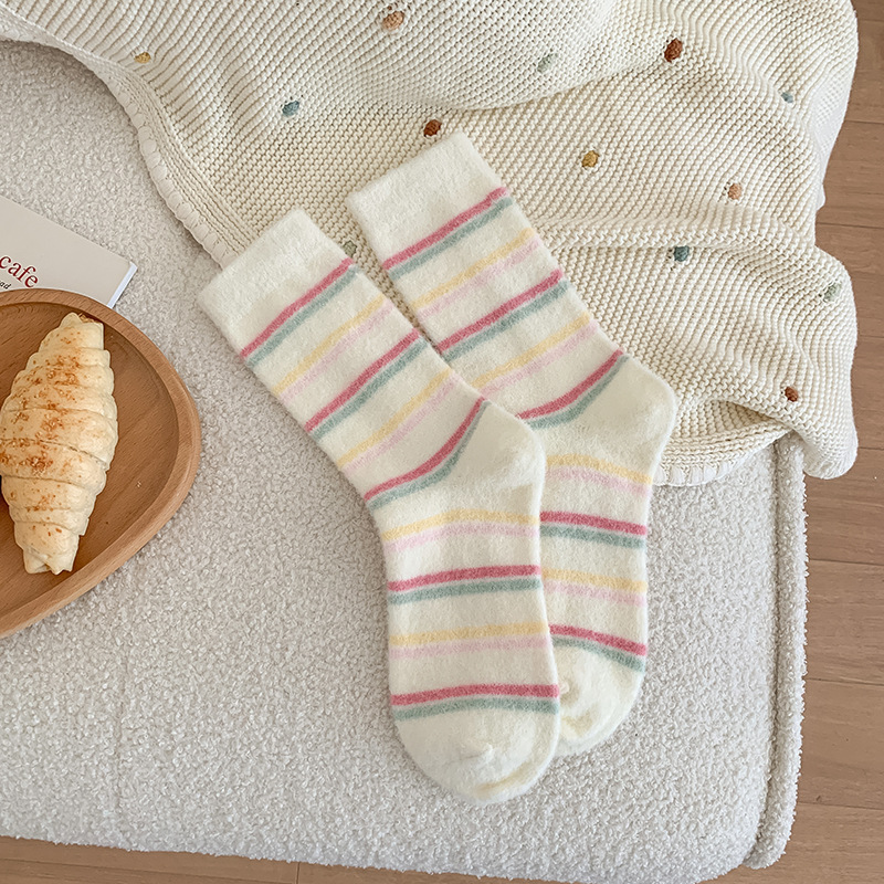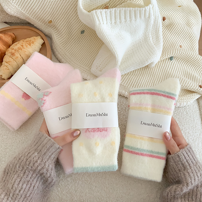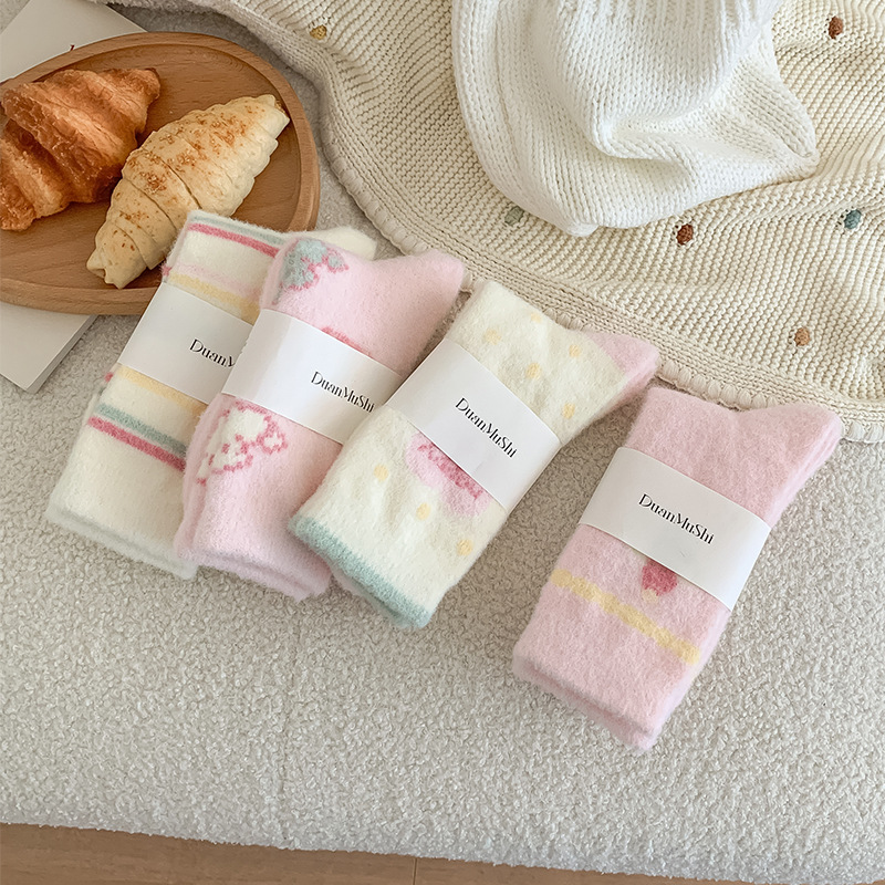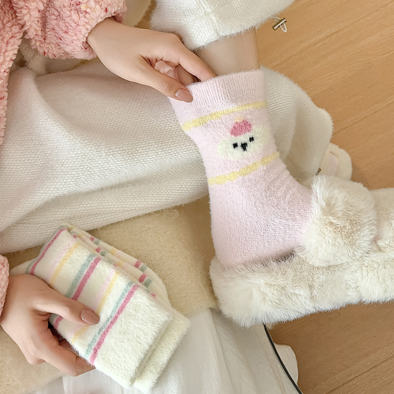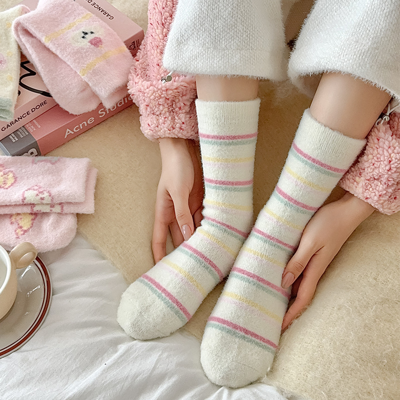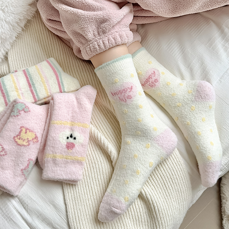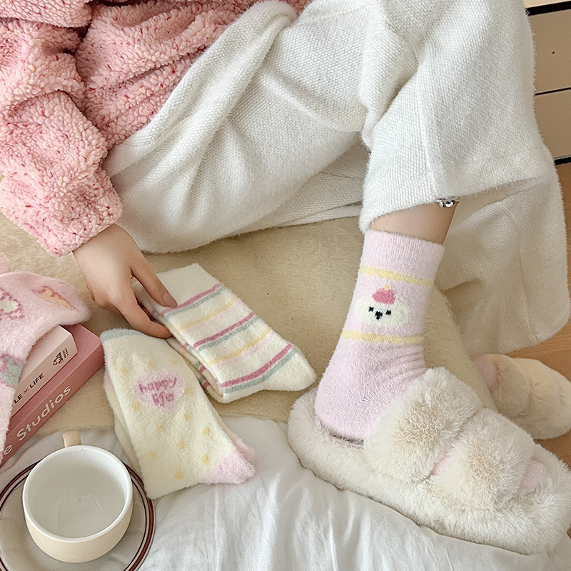핑크 줄무늬 양말 어린이 중간 양말 가을과 겨울 두꺼운 봉제 수면 양말 일본 달콤한 만화 강아지 더미 양말