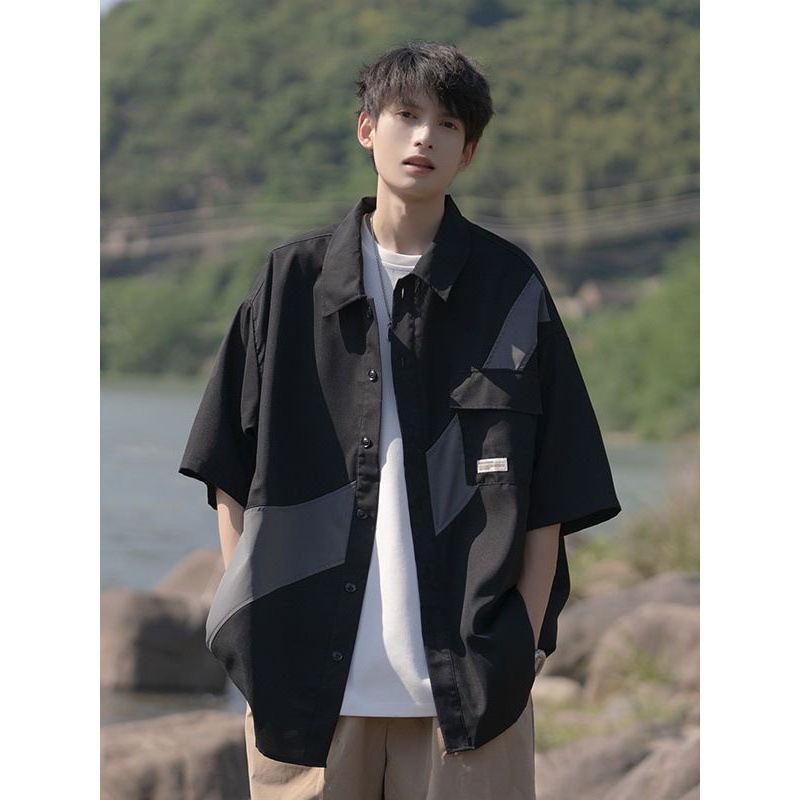 크로스-국경 새로운 레트로 컬러 매칭 반소매 셔츠 미국 스타일 트렌디 브랜드 뽑기 핸들 자켓 작업복 반팔 셔츠 여름 새로운스토어 가기