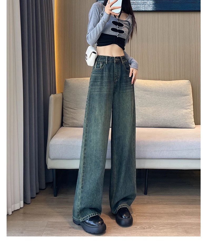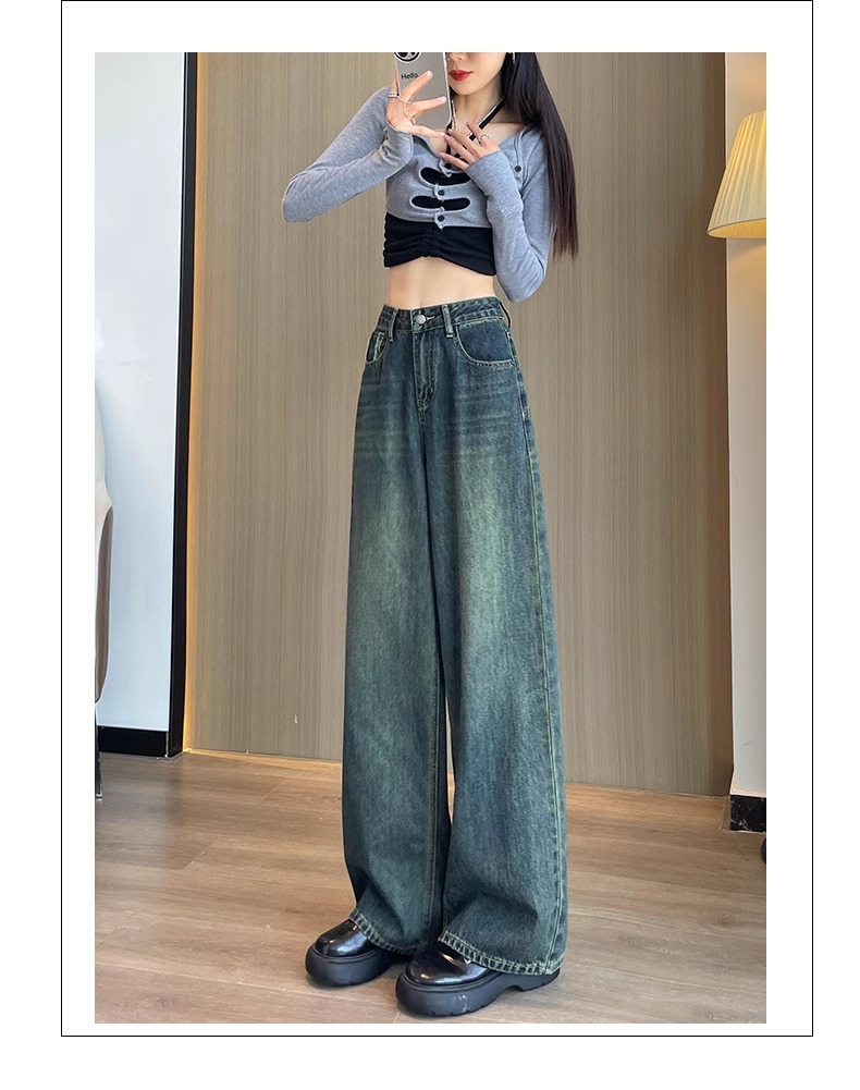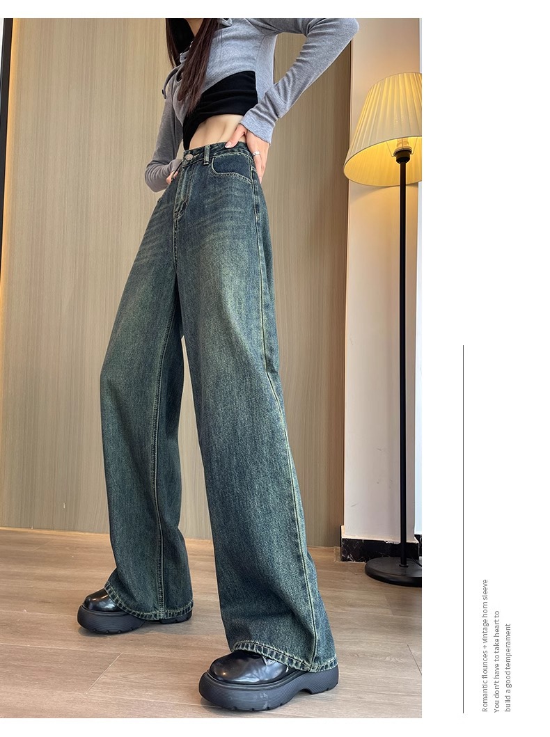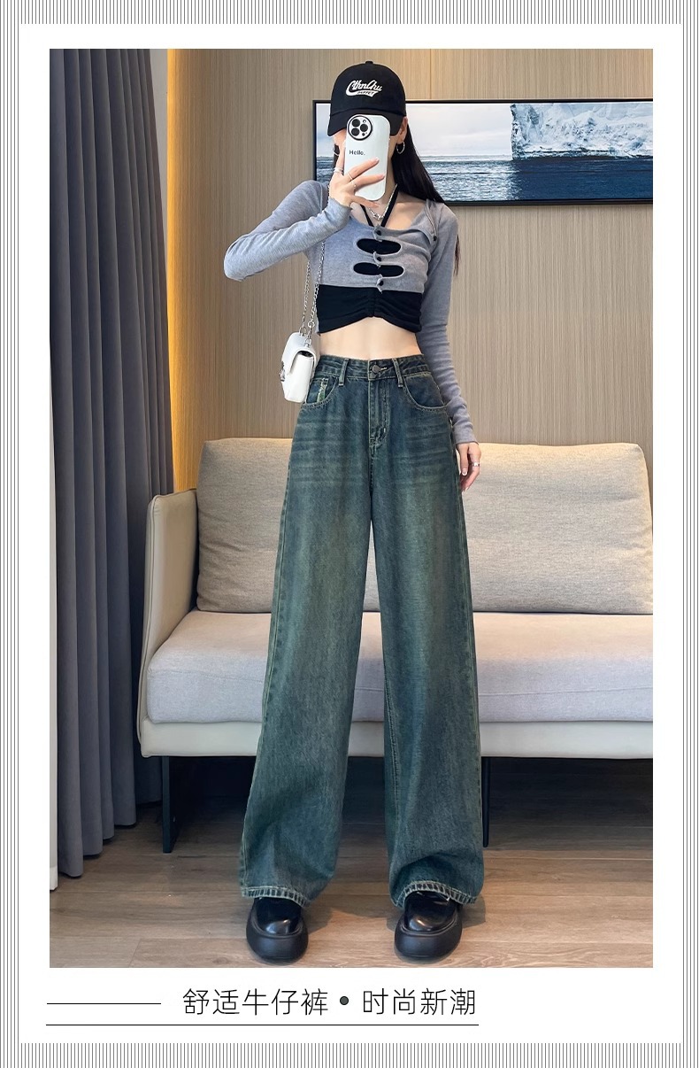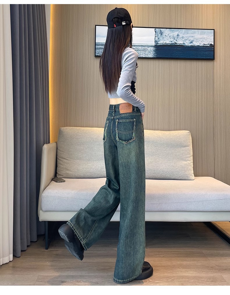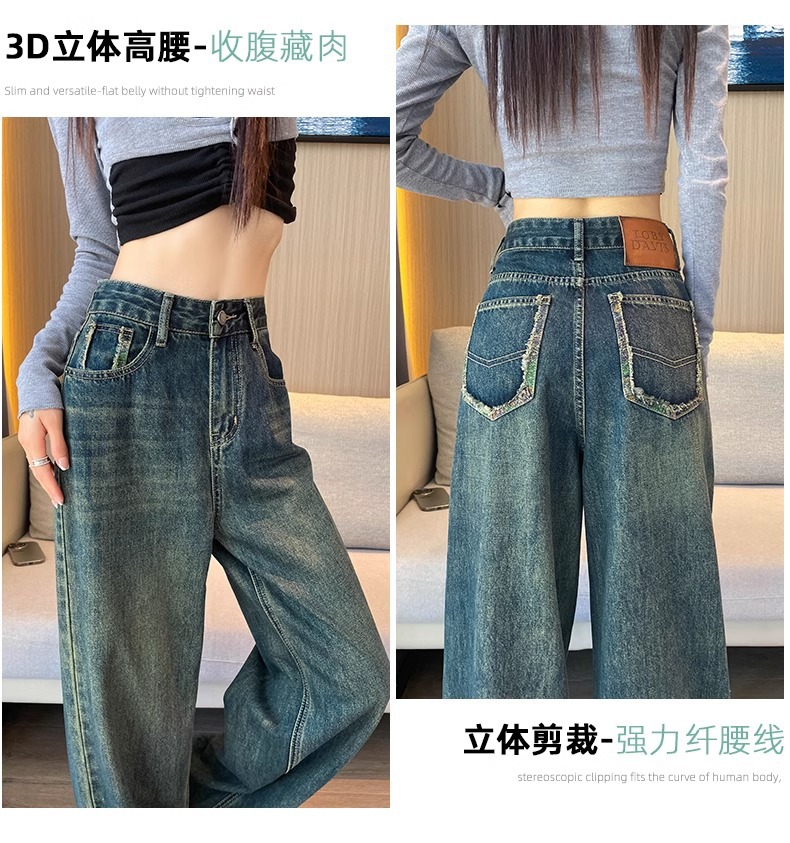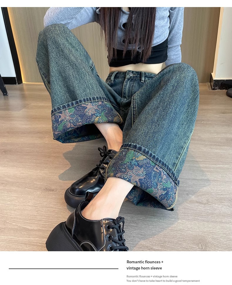 높은 허리 넓은 다리 청바지 여성의 가을 2024 새로운 빈티지 인쇄 느슨한 직선 튜브 덤핑 긴 바지스토어 가기