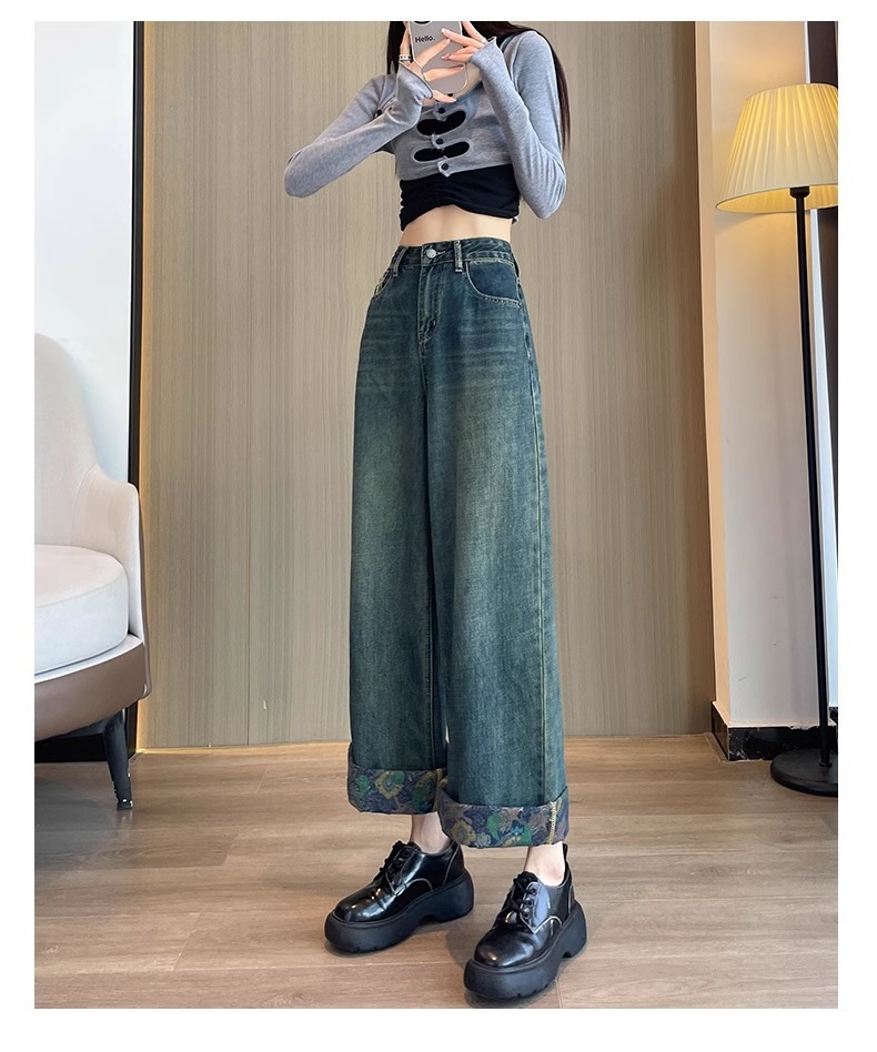 높은 허리 넓은 다리 청바지 여성의 가을 2024 새로운 빈티지 인쇄 느슨한 직선 튜브 덤핑 긴 바지