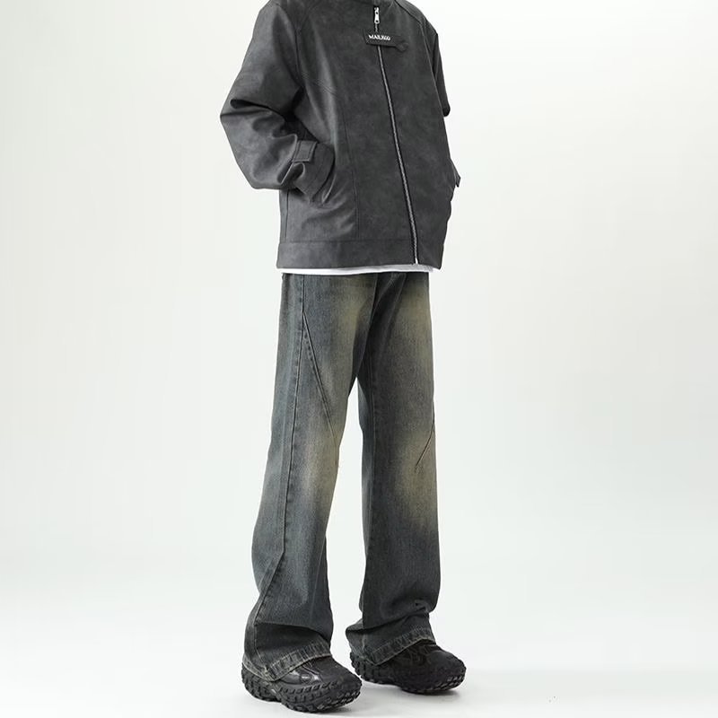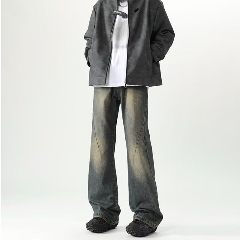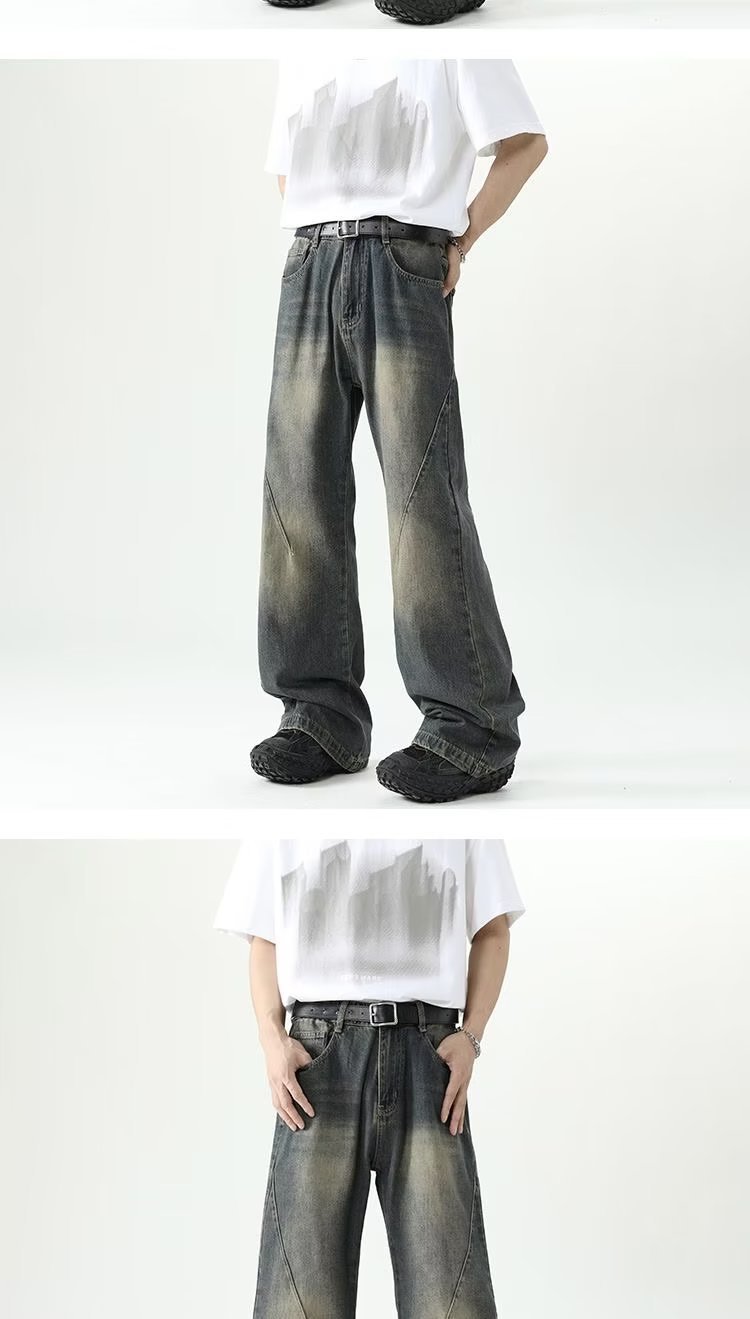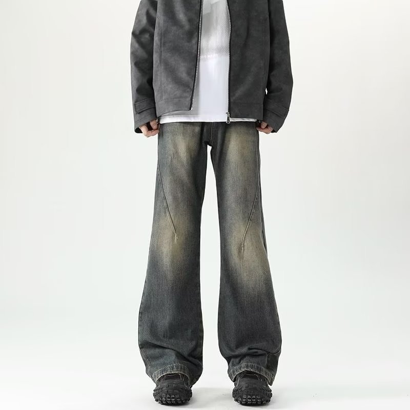 국경 간 가을 패션 브랜드 하이 스트리트 루즈 옐로우 머드 염색 스트레이트 바지 미국 스타일 레트로 마이크로 라르 청바지 남성용스토어 가기