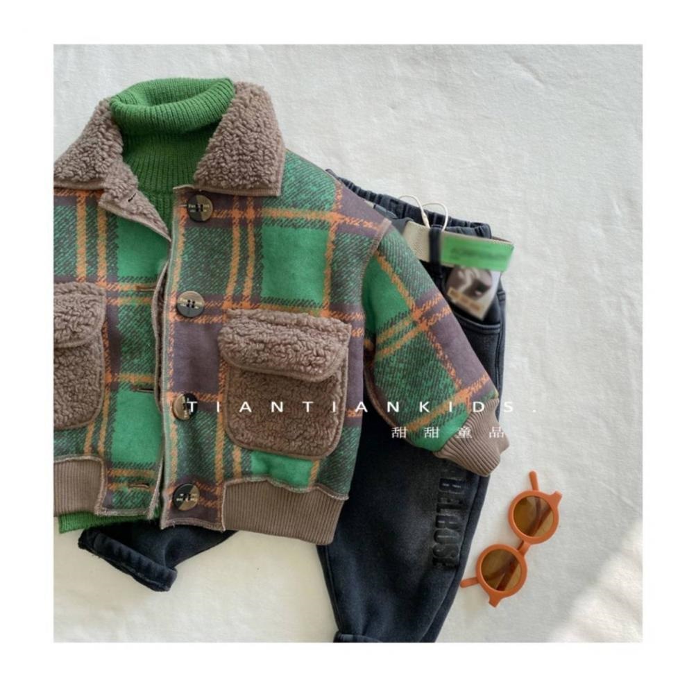 소년 한국 스타일 옷깃 녹색 격자 모피 코트 어린이 2025 가을, 겨울 새 스타일 아기 소녀 싱글 브레스트 벨벳 재킷스토어 가기