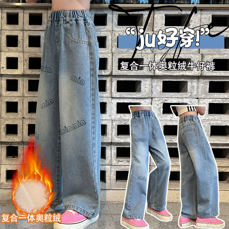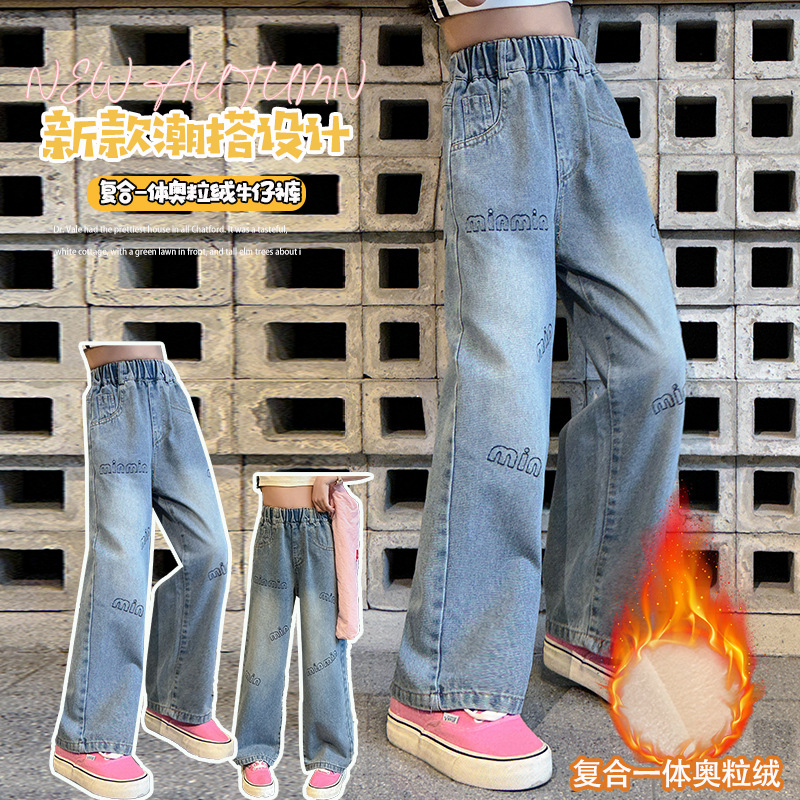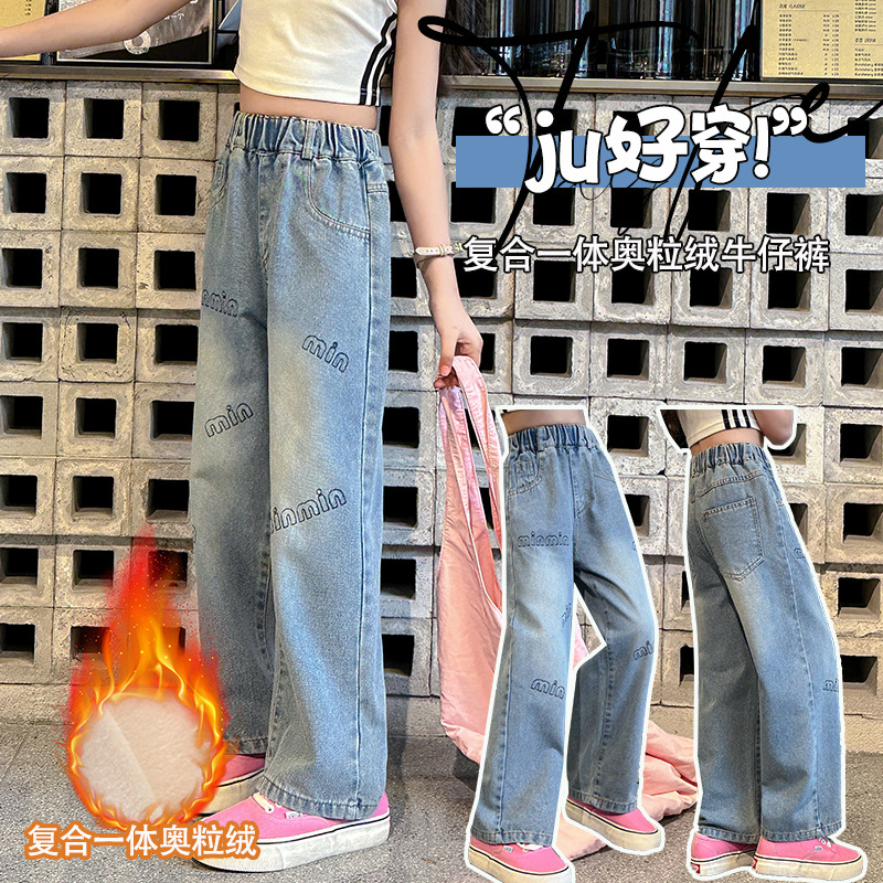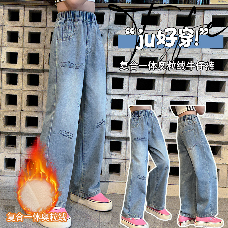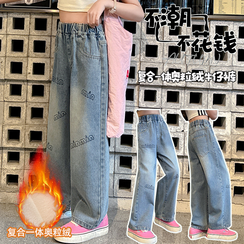 소녀 기모 청바지 가을과 겨울 새로운 유행 인쇄 스트레이트 두꺼운 따뜻한 외부 착용 긴 바지 큰 어린이 착용