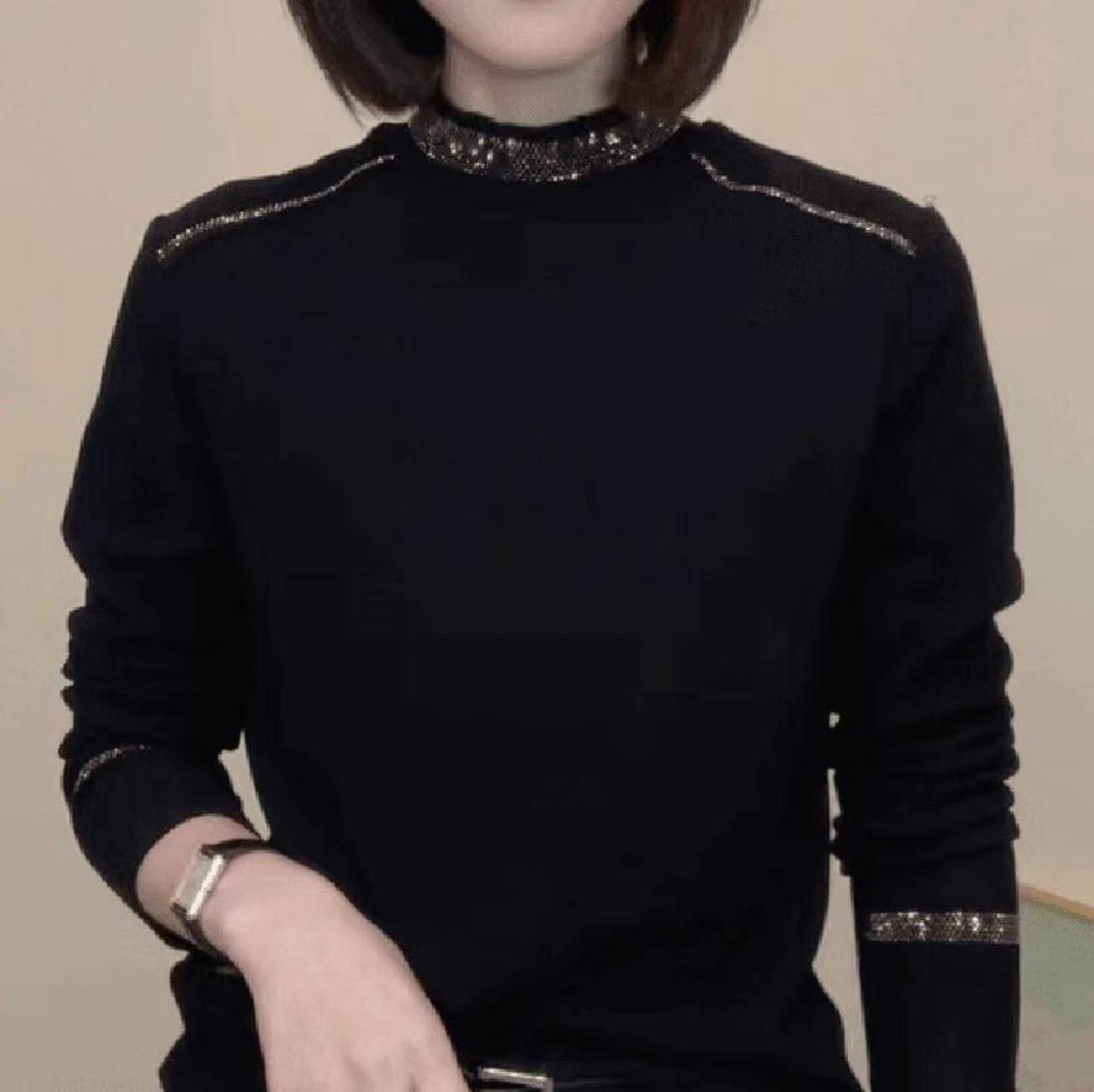 가을과 겨울 새로운 단색 라인석 드 벨벳 패션 기질 디자인 여성 티셔츠 캐주얼 긴 소매 기본 셔츠