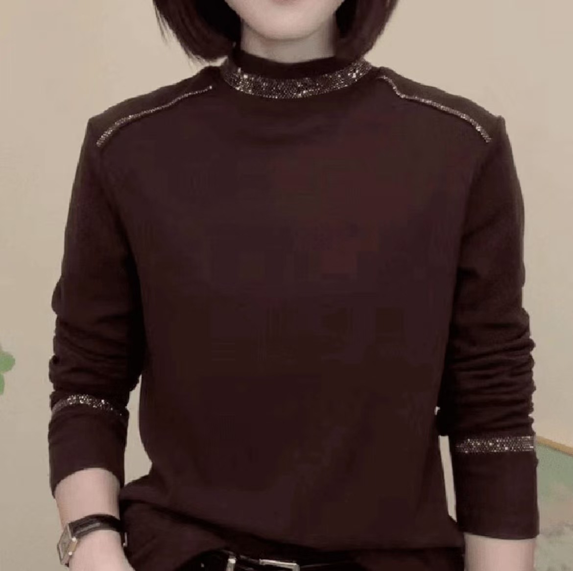가을과 겨울 새로운 단색 라인석 드 벨벳 패션 기질 디자인 여성 티셔츠 캐주얼 긴 소매 기본 셔츠스토어 가기