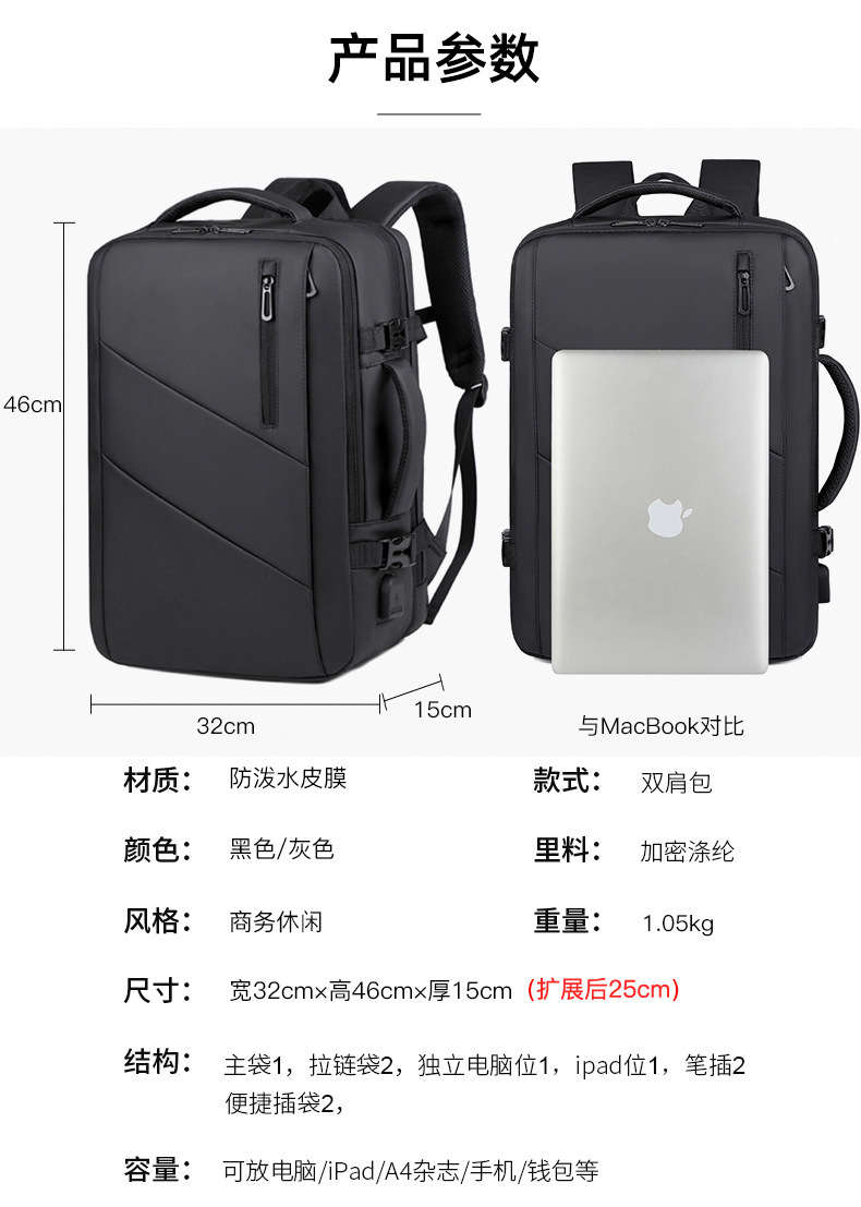 국경 간 배낭 남성 고급 감각 비즈니스 배낭 확장 대용량 여행 가방 16 인치 컴퓨터 가방