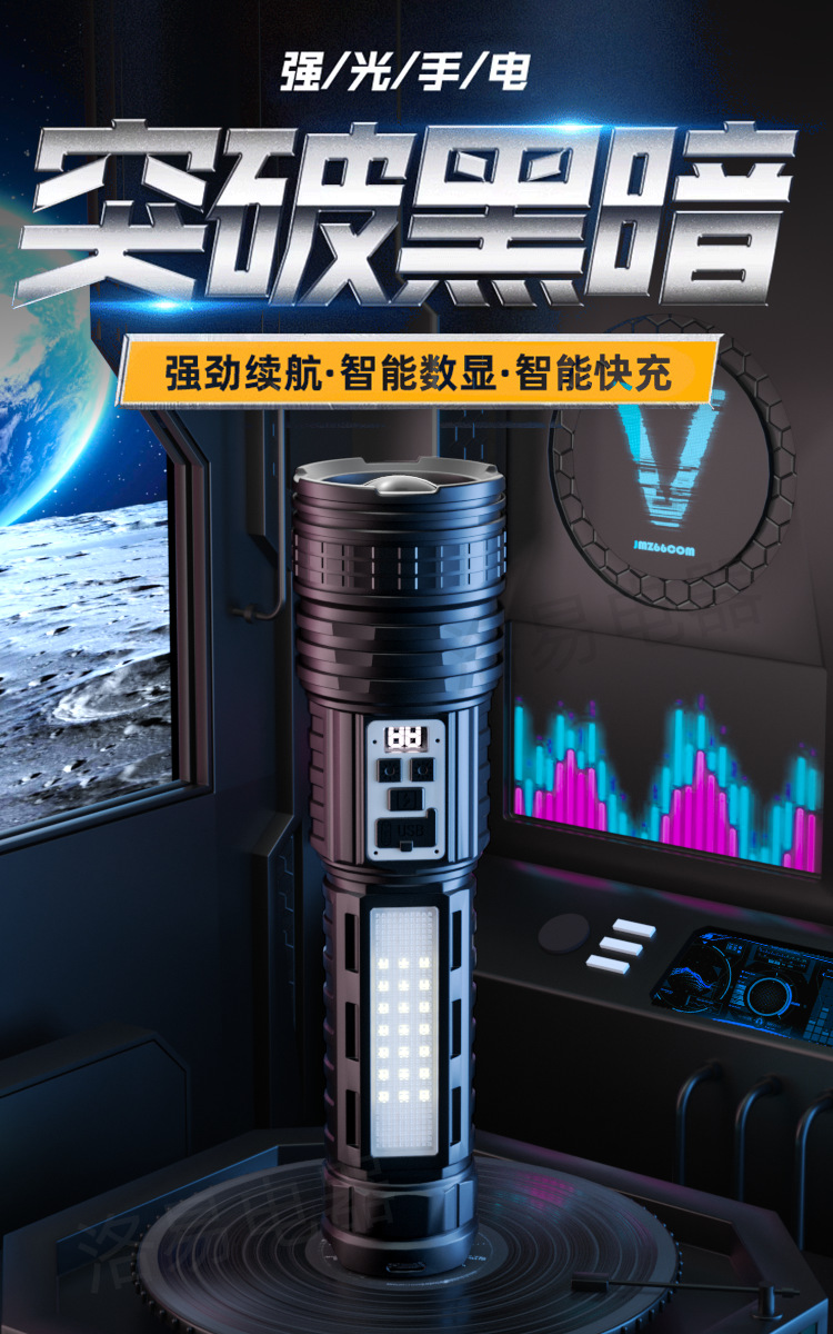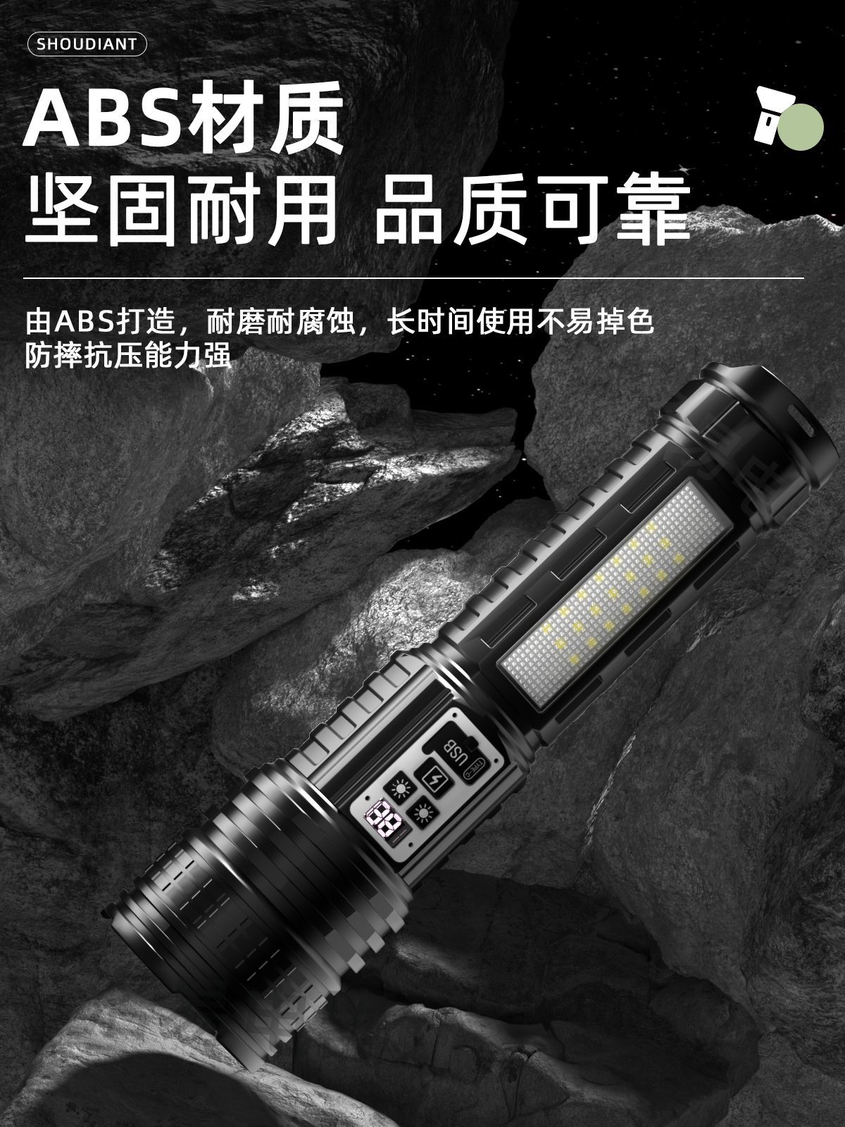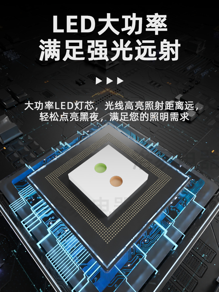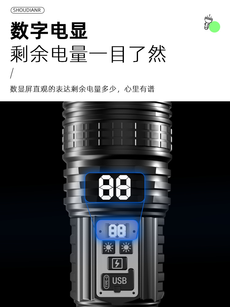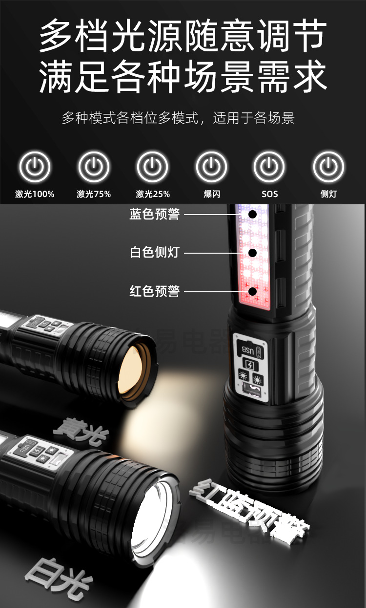 功能:1.白光开关高-中-低-爆闪-SOS