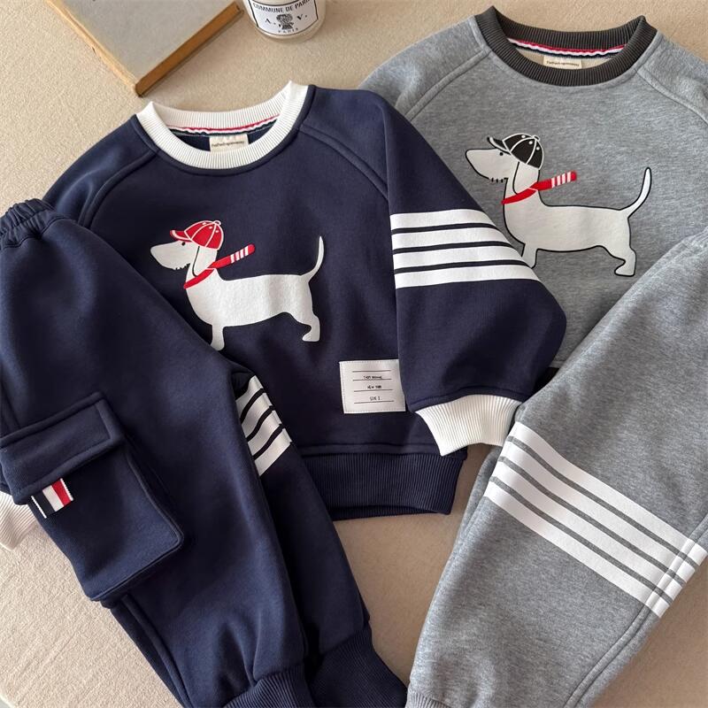 재고 있음, 즉시 배송! 아동용 양털 양복 2024 겨울 소년 운동복 아기 귀여운 강아지 투피스 트렌디 세트