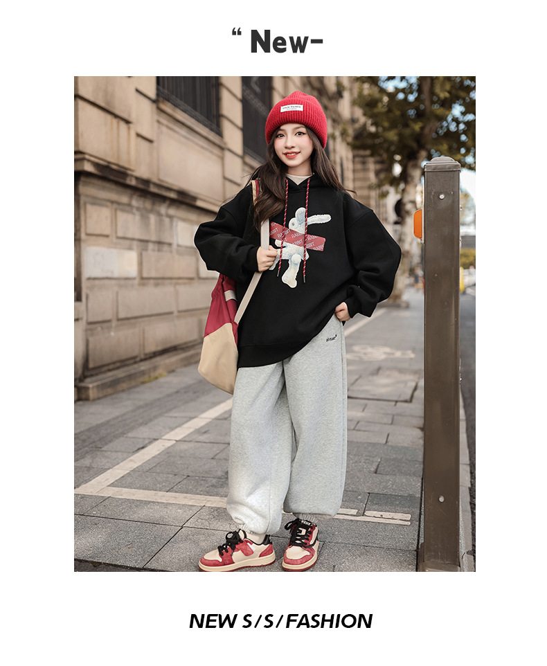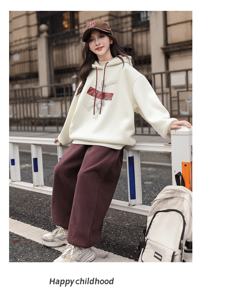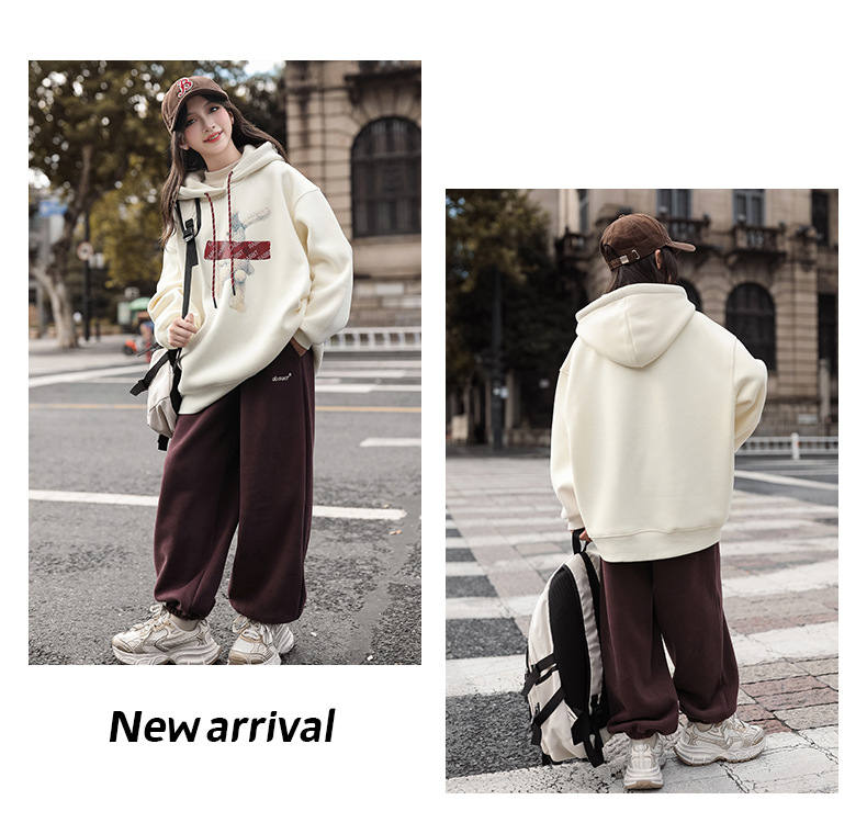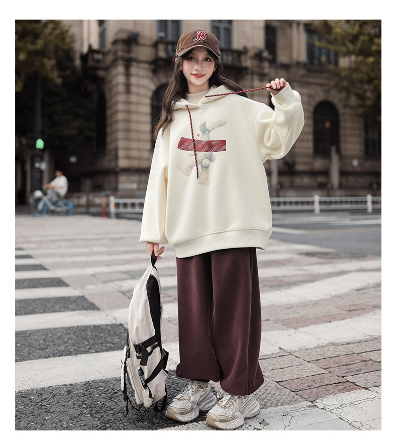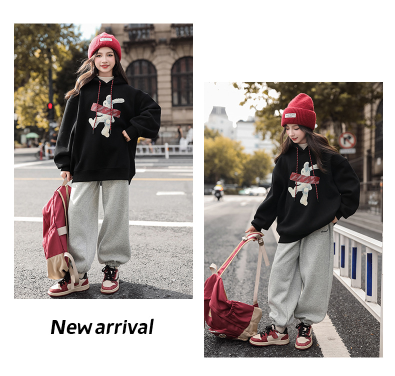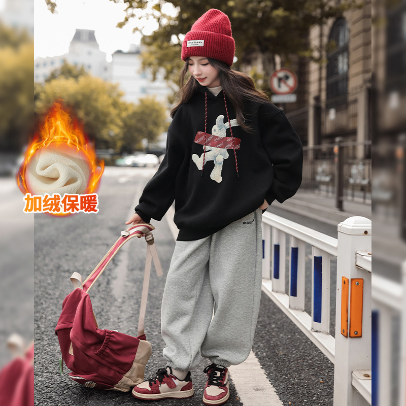 여자 기모 땀 2024 가을/겨울 새로운 스타일 큰 아이들 후드 탑 겨울 두꺼운 캐주얼 스웨트 세트스토어 가기