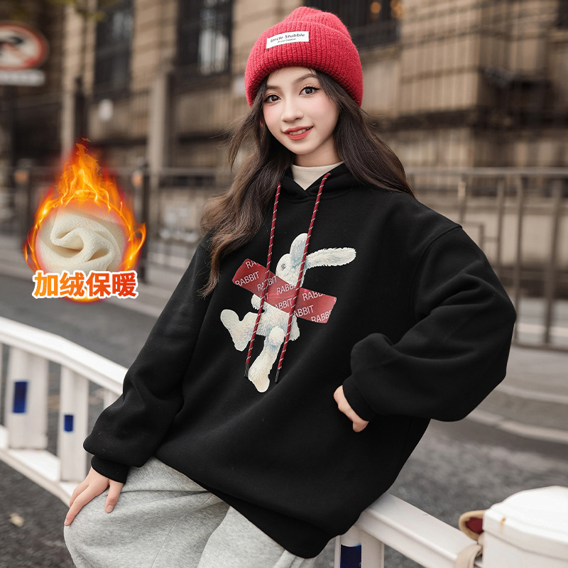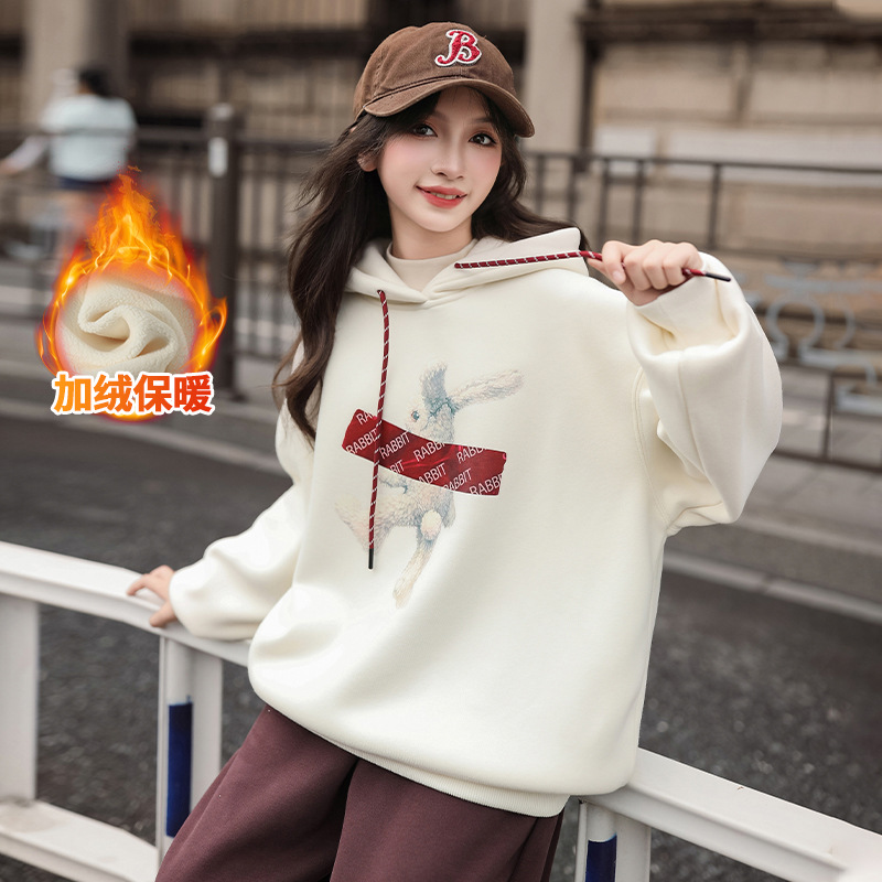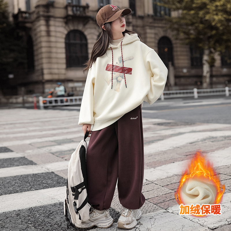 여자 기모 땀 2024 가을/겨울 새로운 스타일 큰 아이들 후드 탑 겨울 두꺼운 캐주얼 스웨트 세트