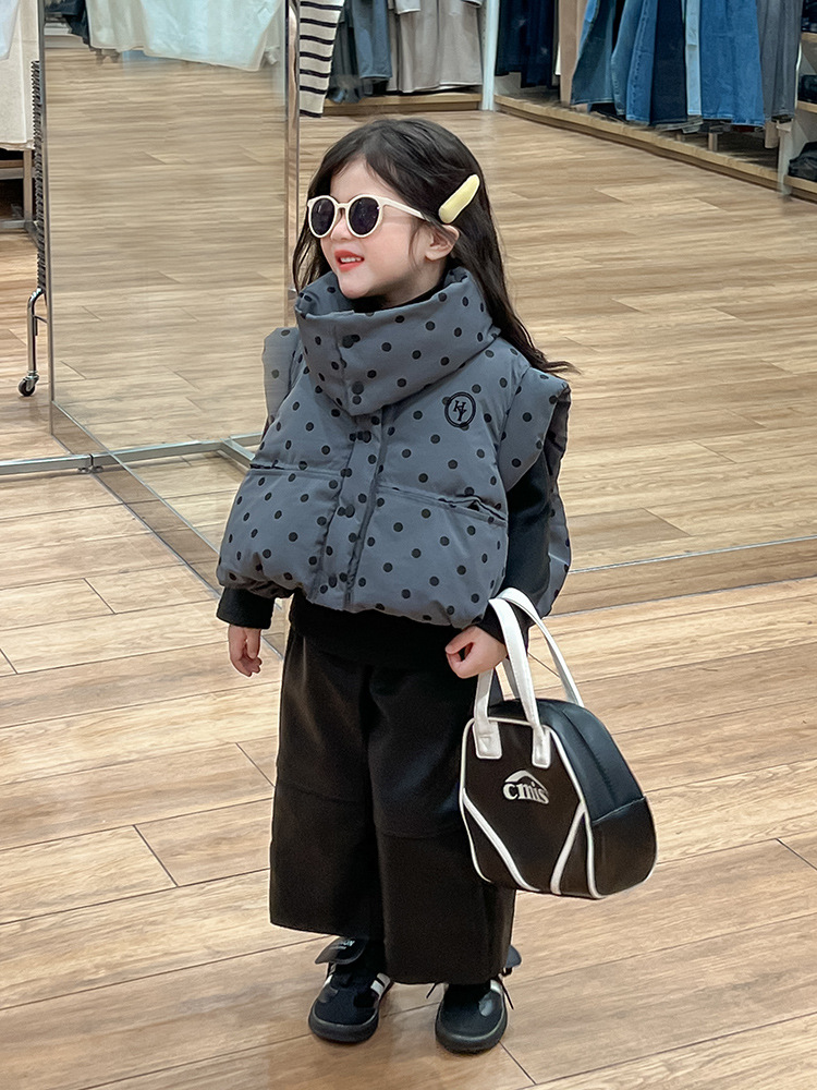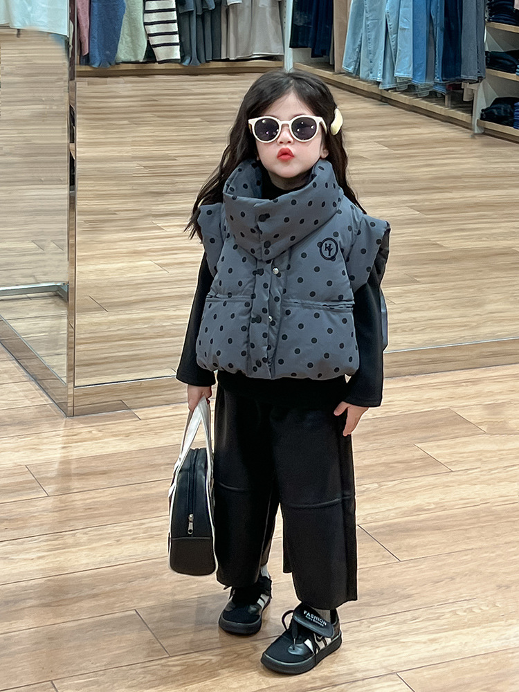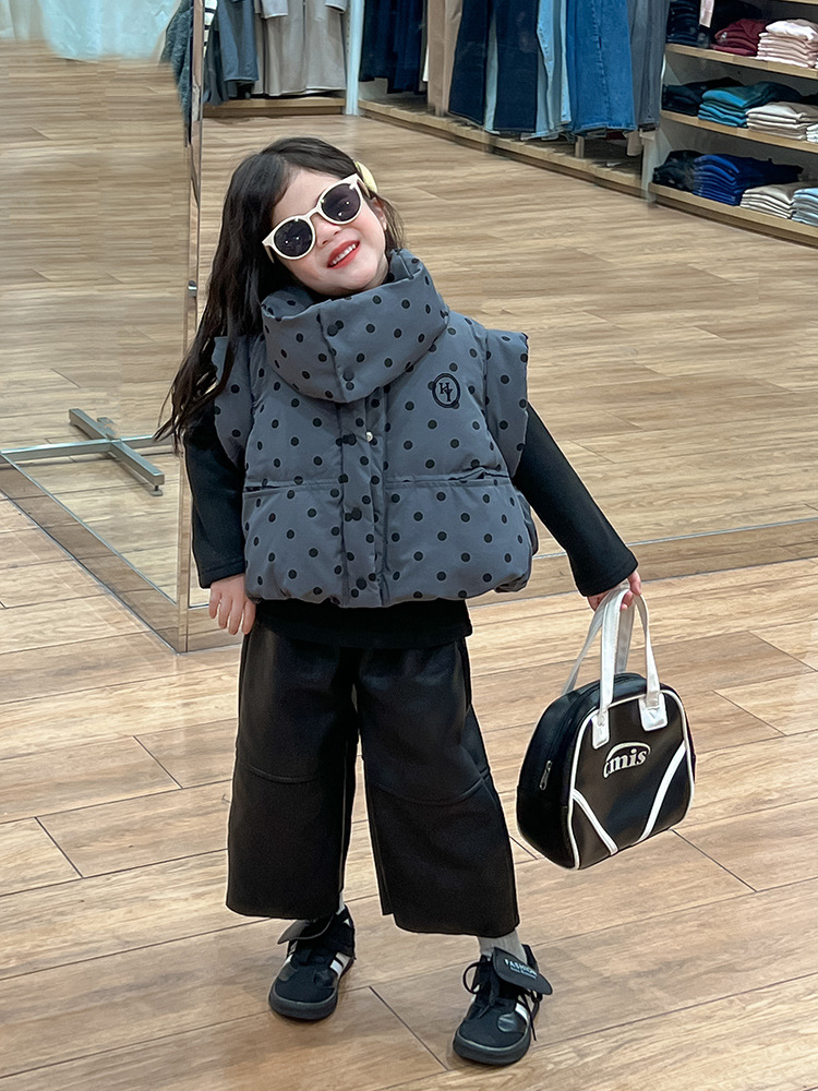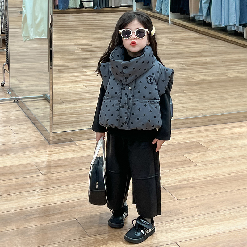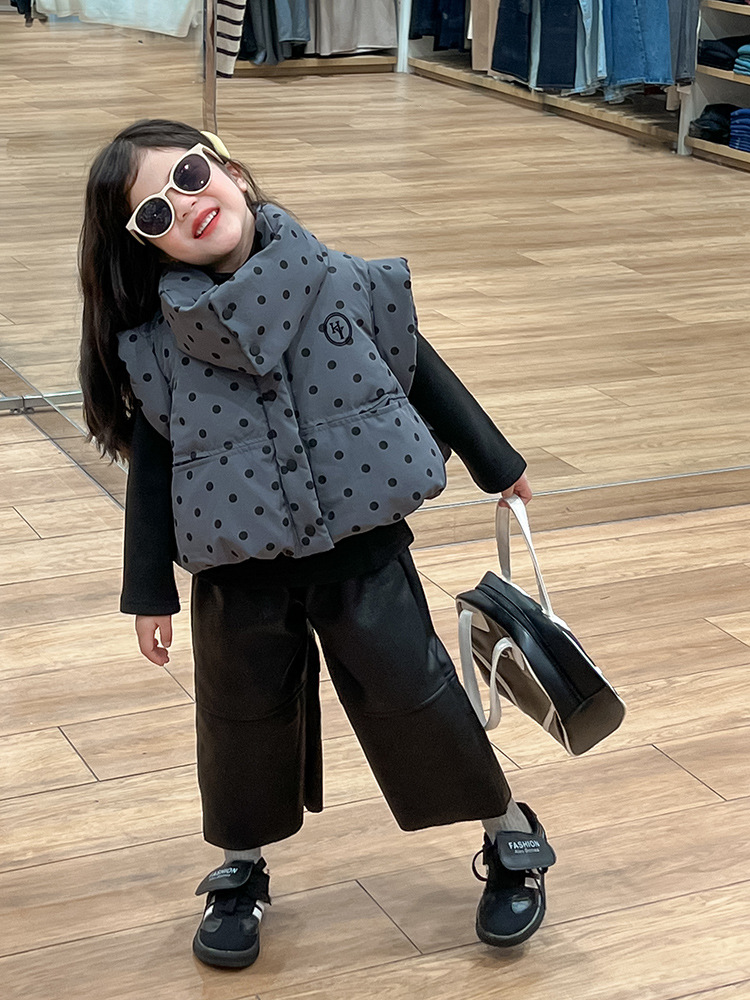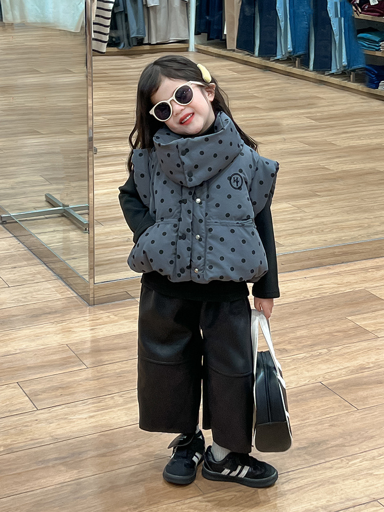 한국 스타일 가을과 겨울 새로운 도착 세트 기모 가죽 바지 분리 가능한 칼라 폴로 도트 패딩 재킷 조끼 기모 기본 셔츠 아동복스토어 가기