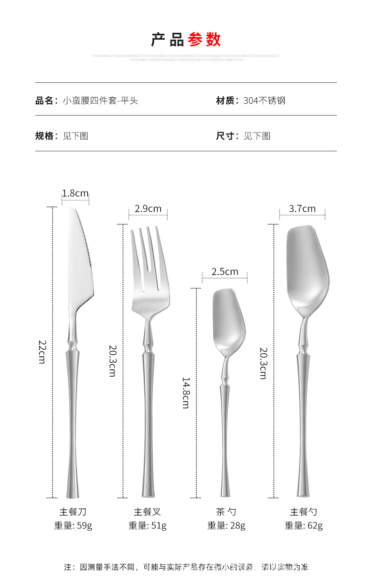 고급 가벼운 매트 304 스테인레스 스틸 식기 평면 허리 작은 남자 허리 4 피스 세트 스테인레스 스틸 나이프 포크 스푼 세트