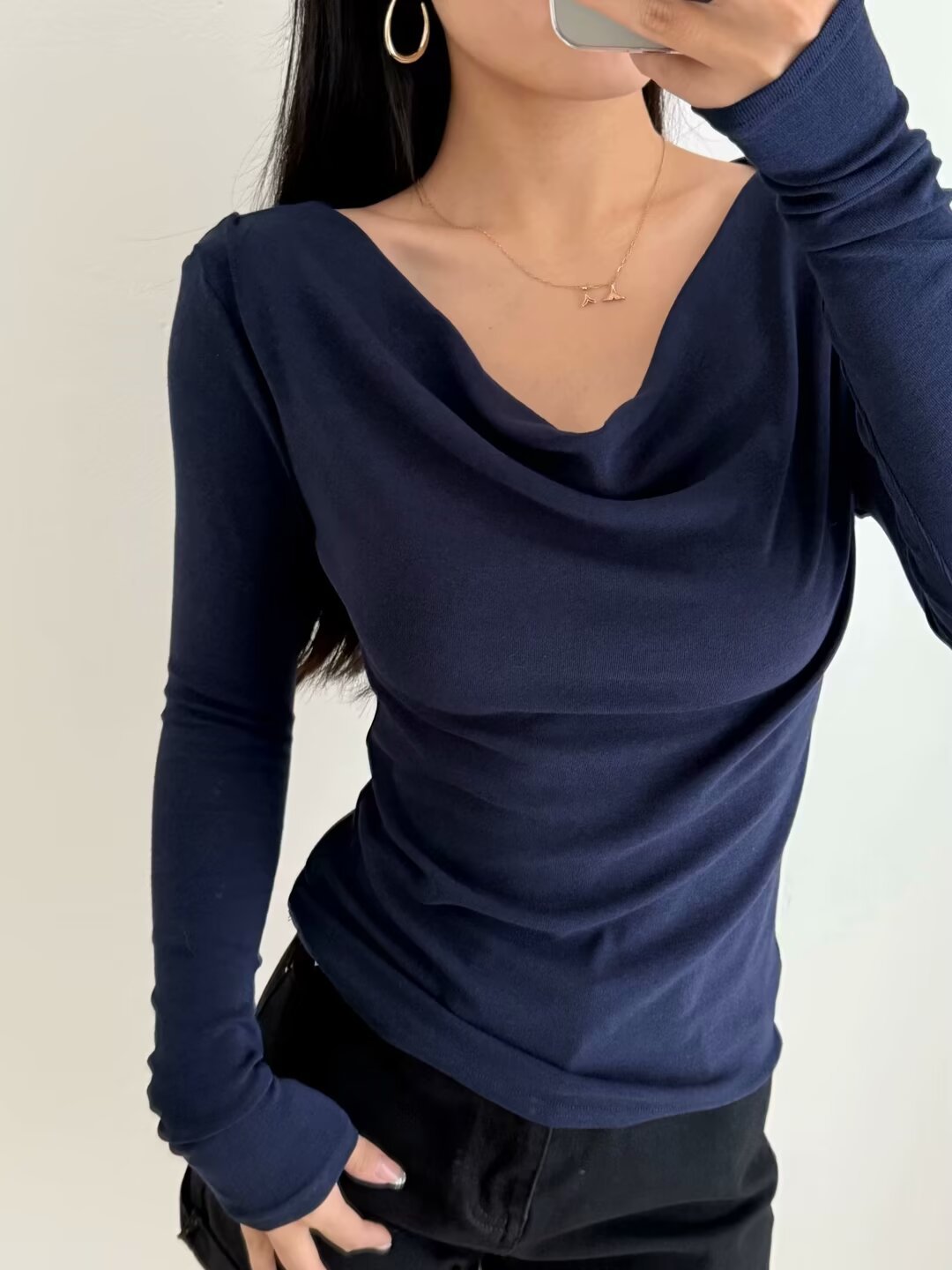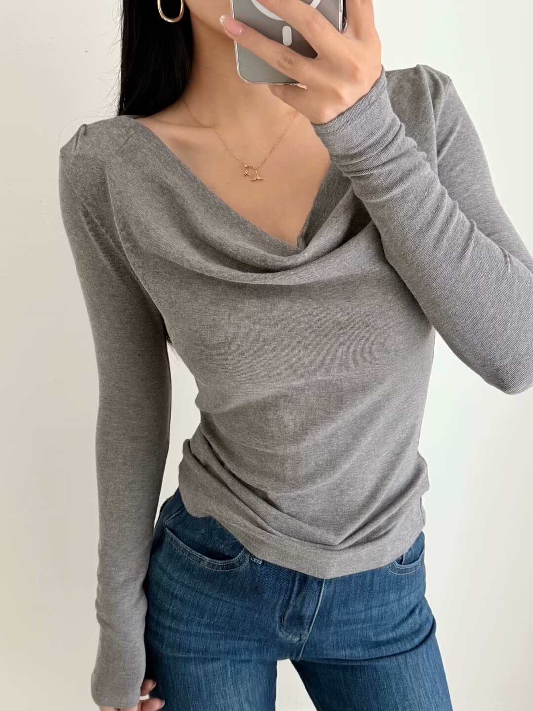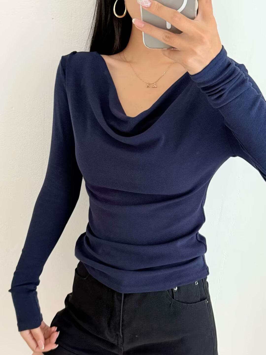 유럽과 미국의 스파이스 소녀 스타일 가을과 겨울 새로운 스타일 슬림 적합 슬리밍 주름 기본 티셔츠스토어 가기