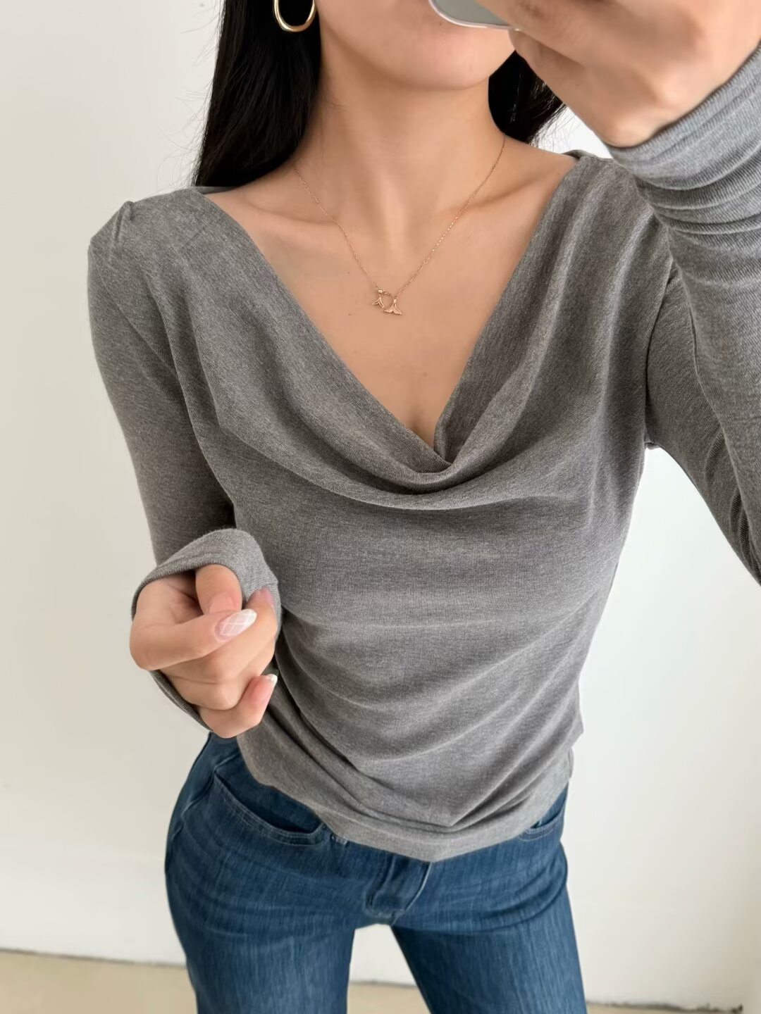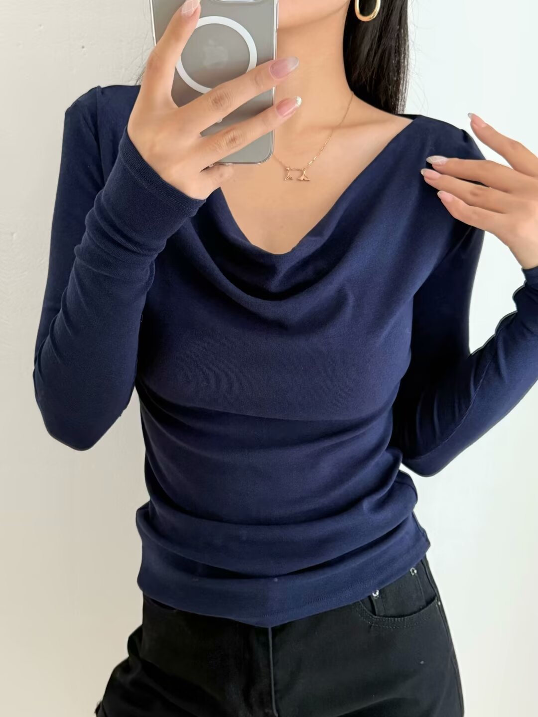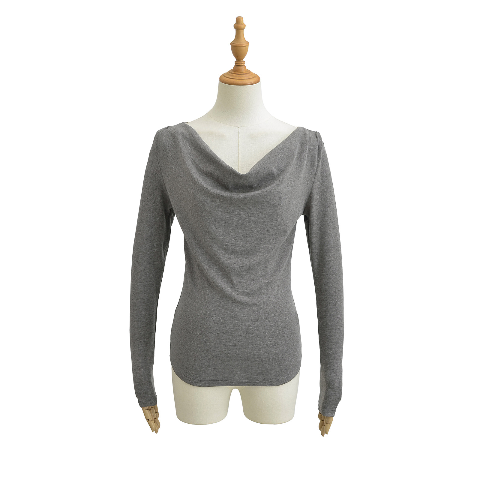유럽과 미국의 스파이스 소녀 스타일 가을과 겨울 새로운 스타일 슬림 적합 슬리밍 주름 기본 티셔츠스토어 가기