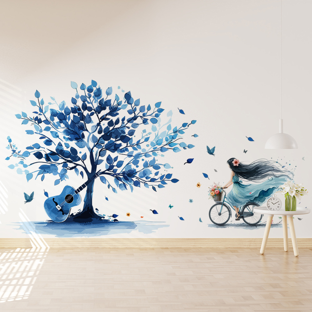 Yiyao DD3920 신선한 라이트 블루 자전거 소녀 인쇄 벽 스티커 거실 미화 장식 배경 벽 스티커스토어 가기