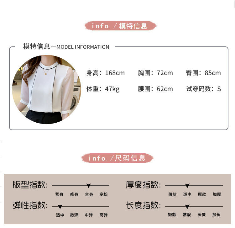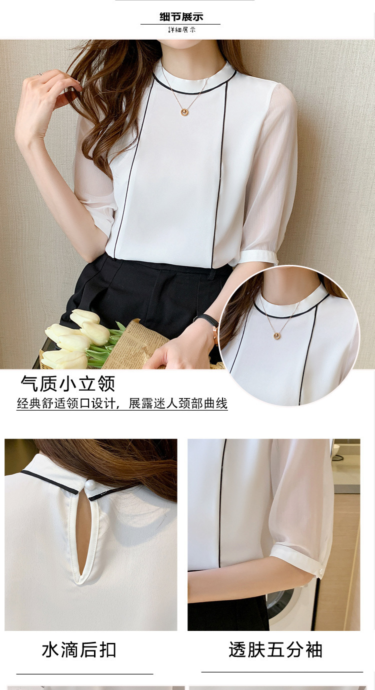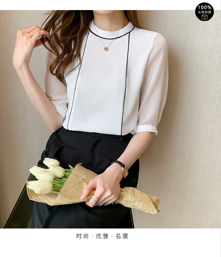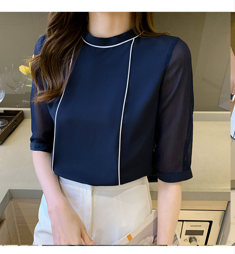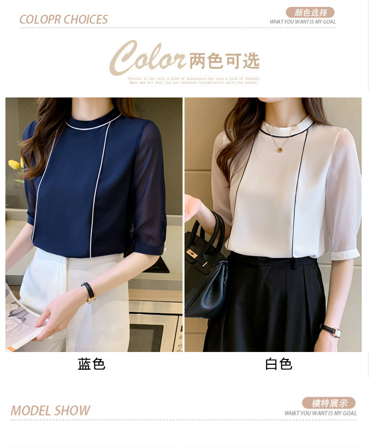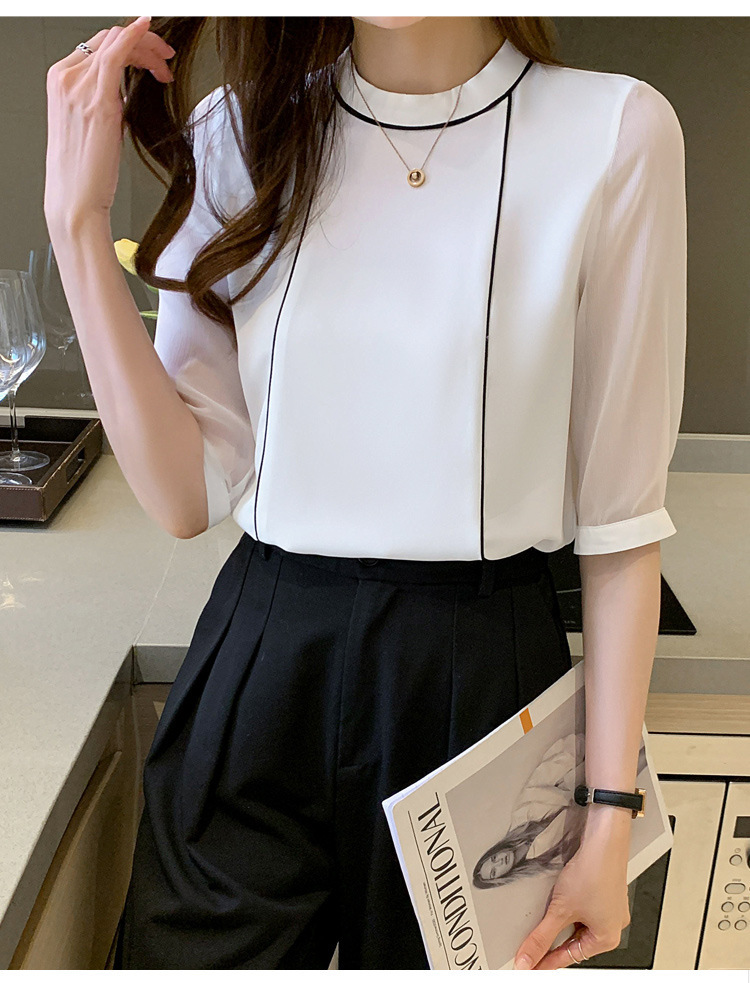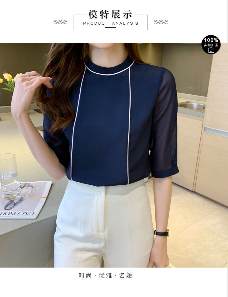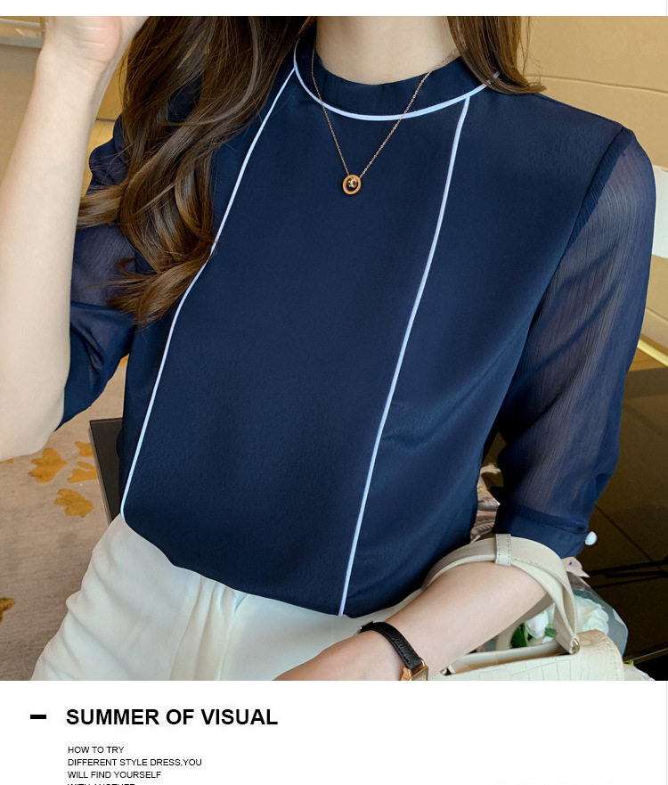 2023 년 여름 새로운 한국 스타일 바느질 통근 여성을위한 느슨한 V 넥 쉬폰 탑
