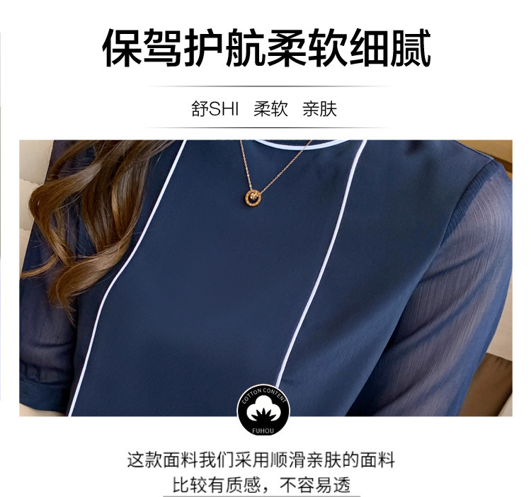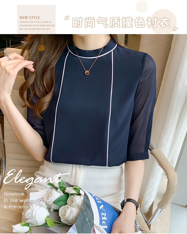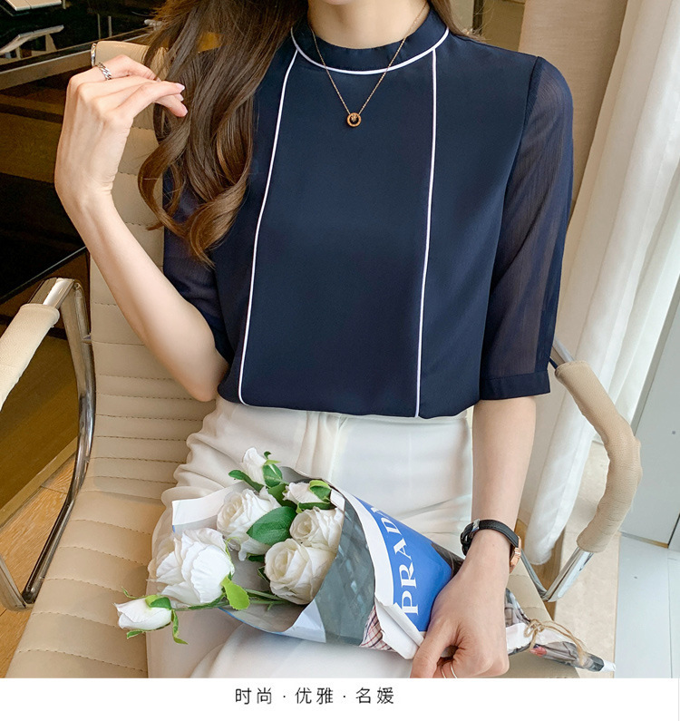 2023 년 여름 새로운 한국 스타일 바느질 통근 여성을위한 느슨한 V 넥 쉬폰 탑스토어 가기
