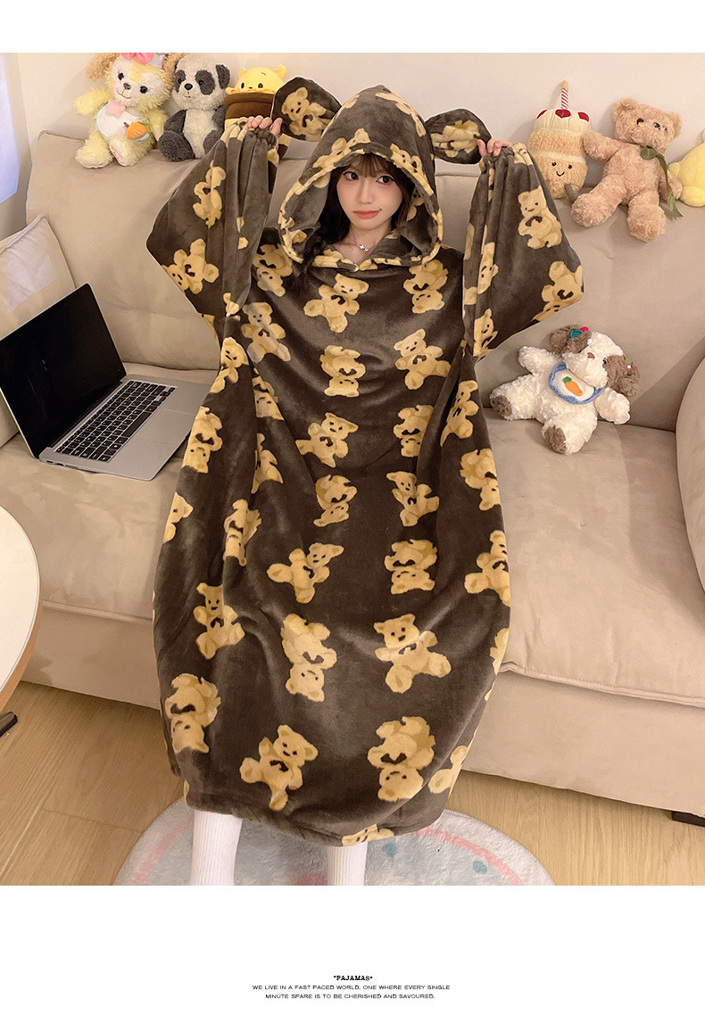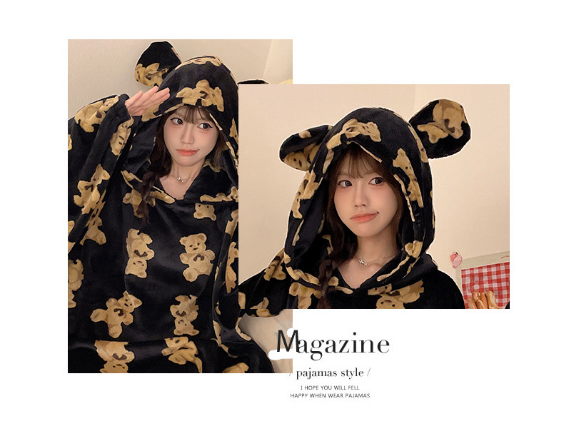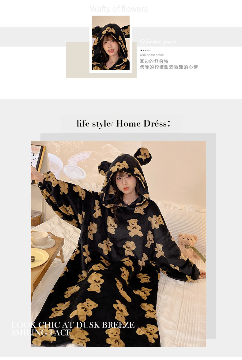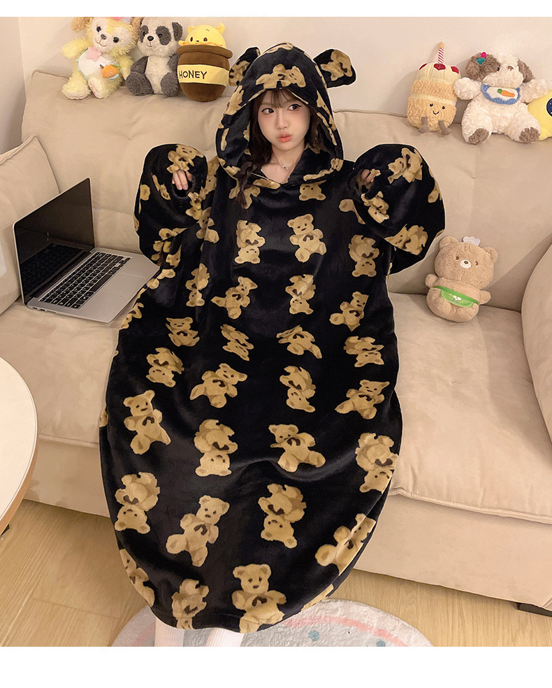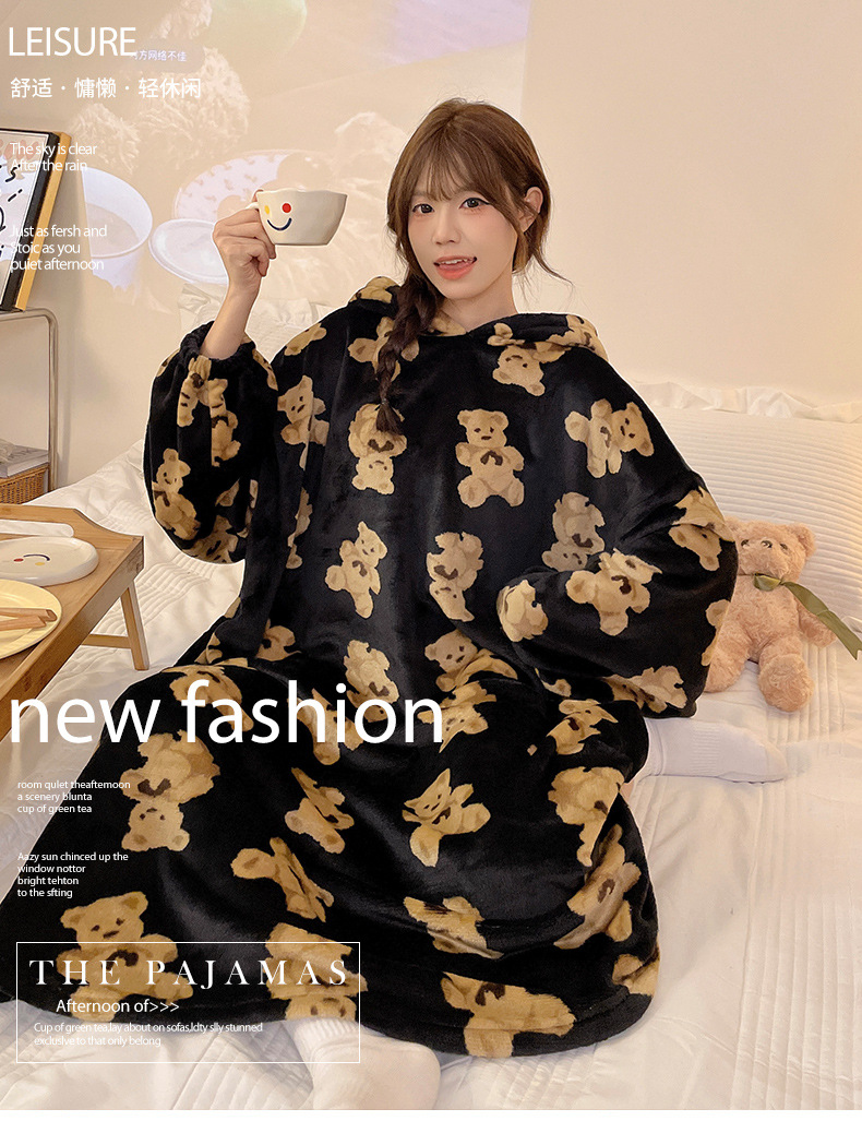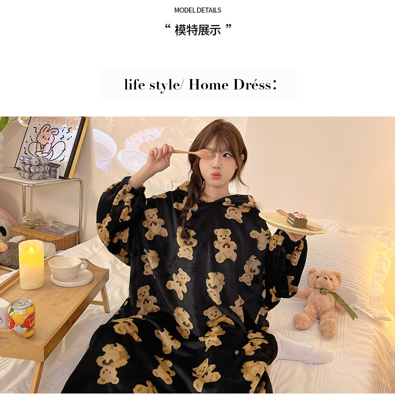 플란넬 파자마 여성의 가을과 겨울 달콤한 만화 후드 긴 소매 느슨한 잠옷 플러스 사이즈 300kg 가정용 옷스토어 가기