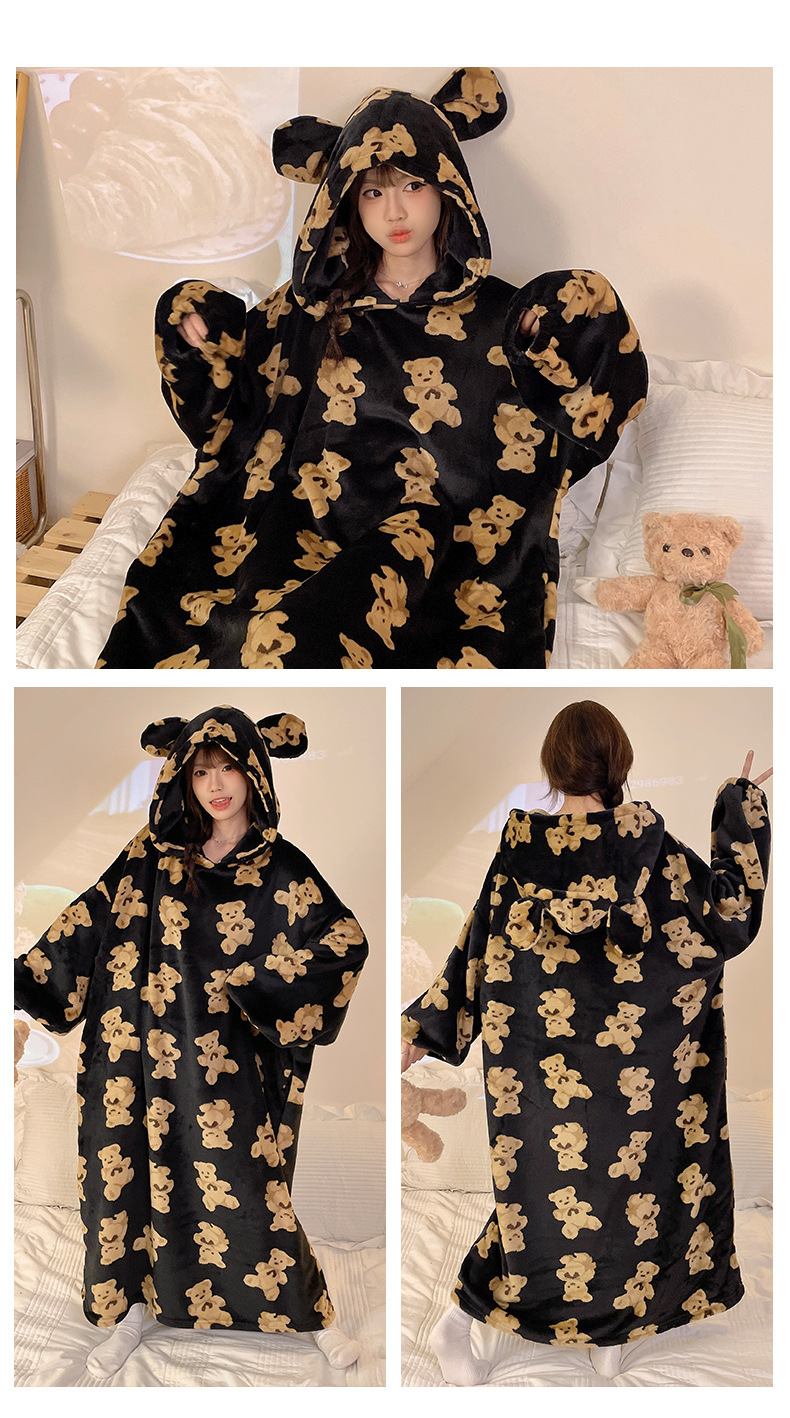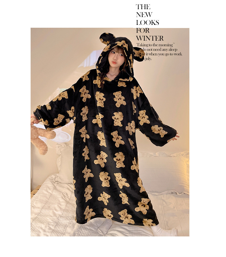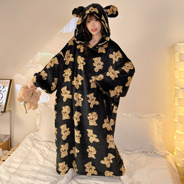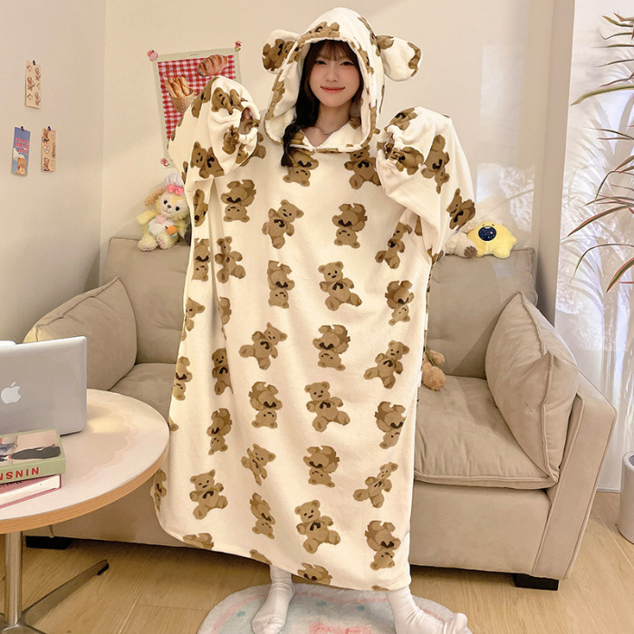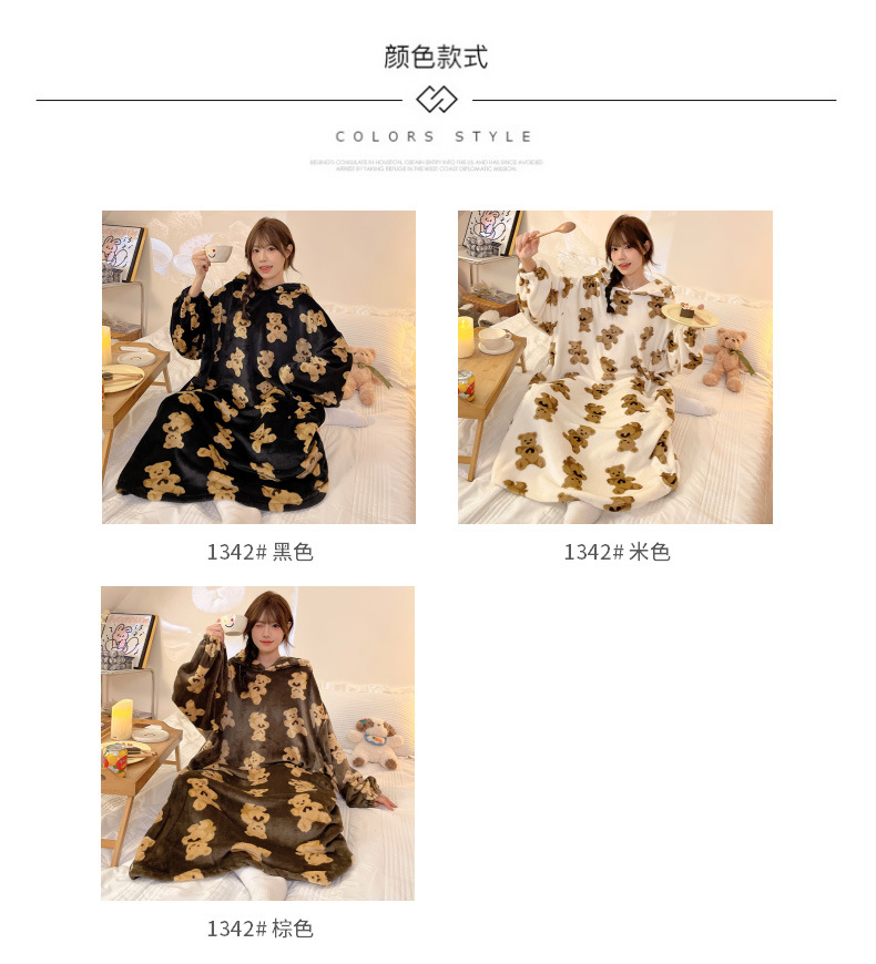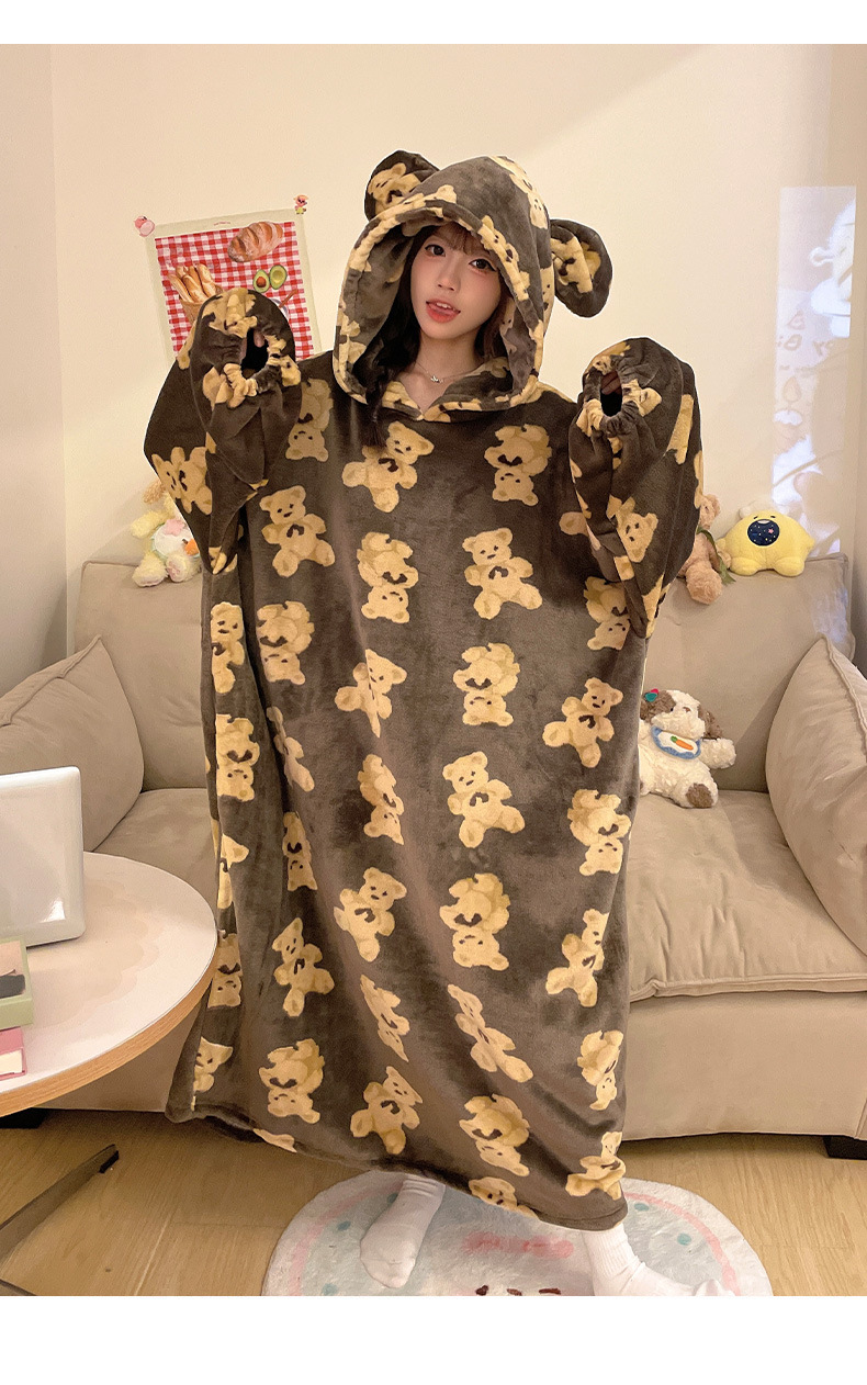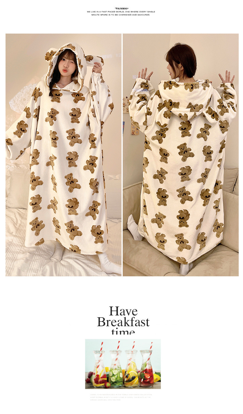 플란넬 파자마 여성의 가을과 겨울 달콤한 만화 후드 긴 소매 느슨한 잠옷 플러스 사이즈 300kg 가정용 옷스토어 가기