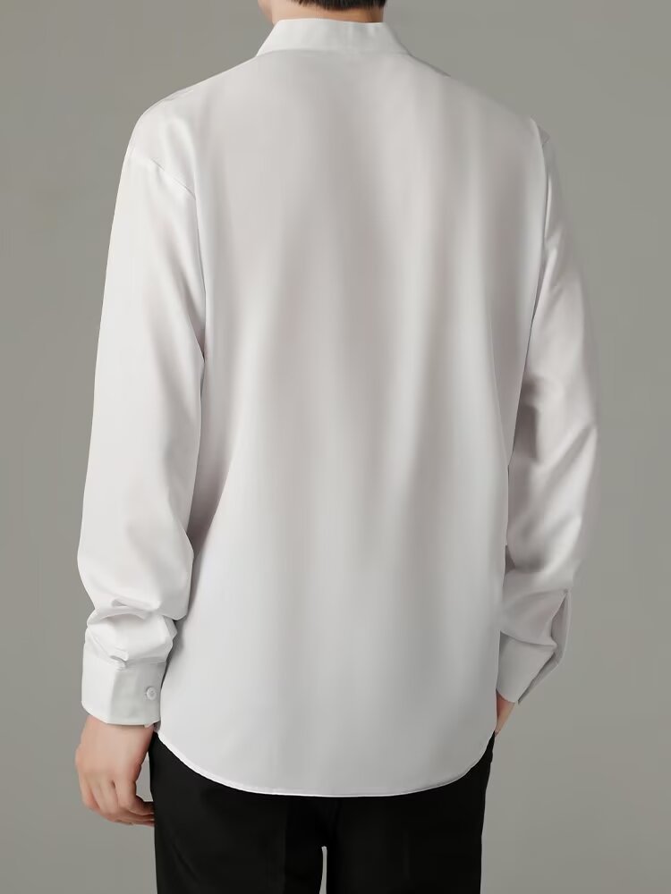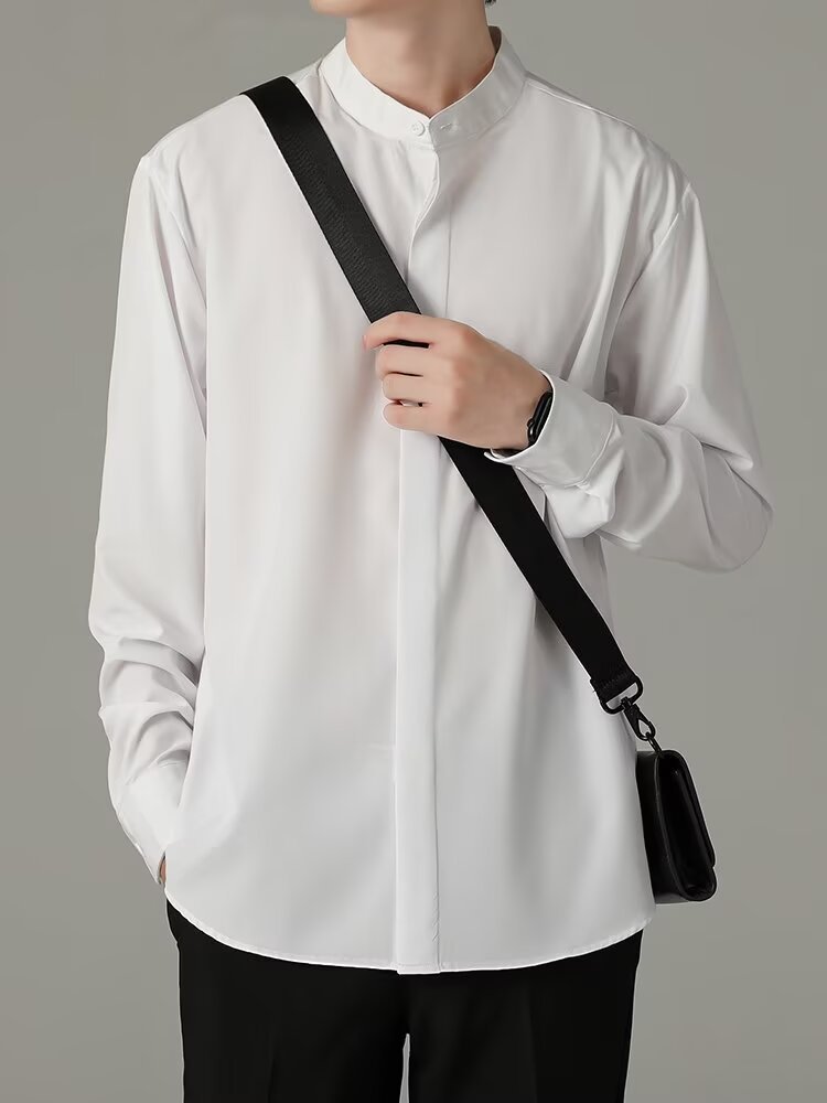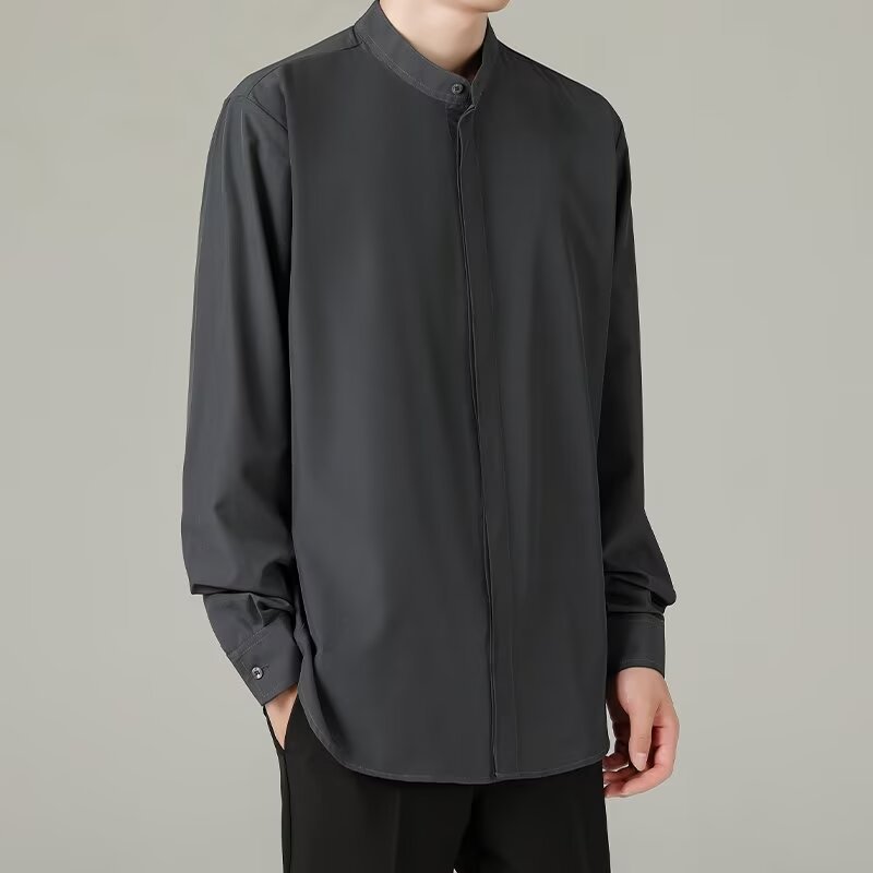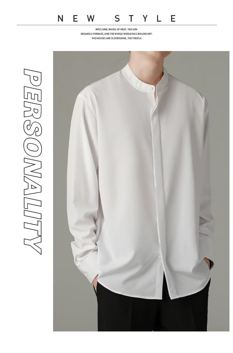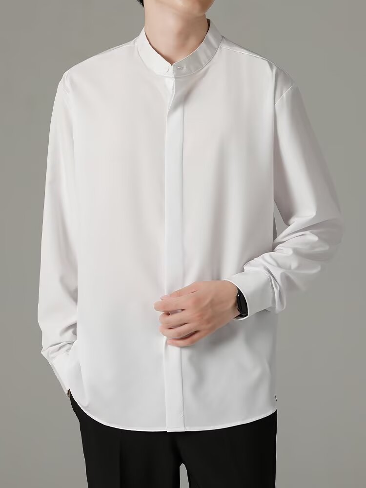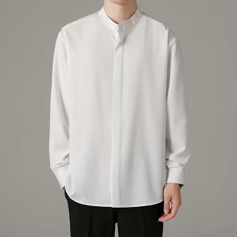 홍콩 스타일의 이너 스탠드 칼라 긴팔 셔츠 남자의 이른 봄 새로운 틈새 셔츠 고급 아이스 실크 드레이프 화이트 셔츠