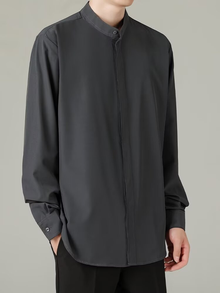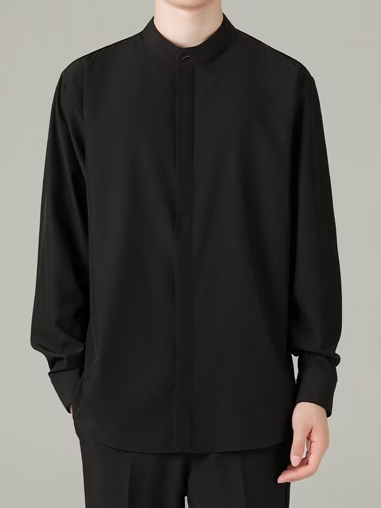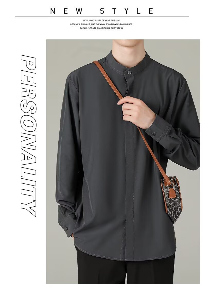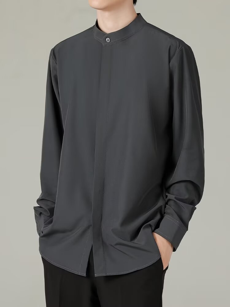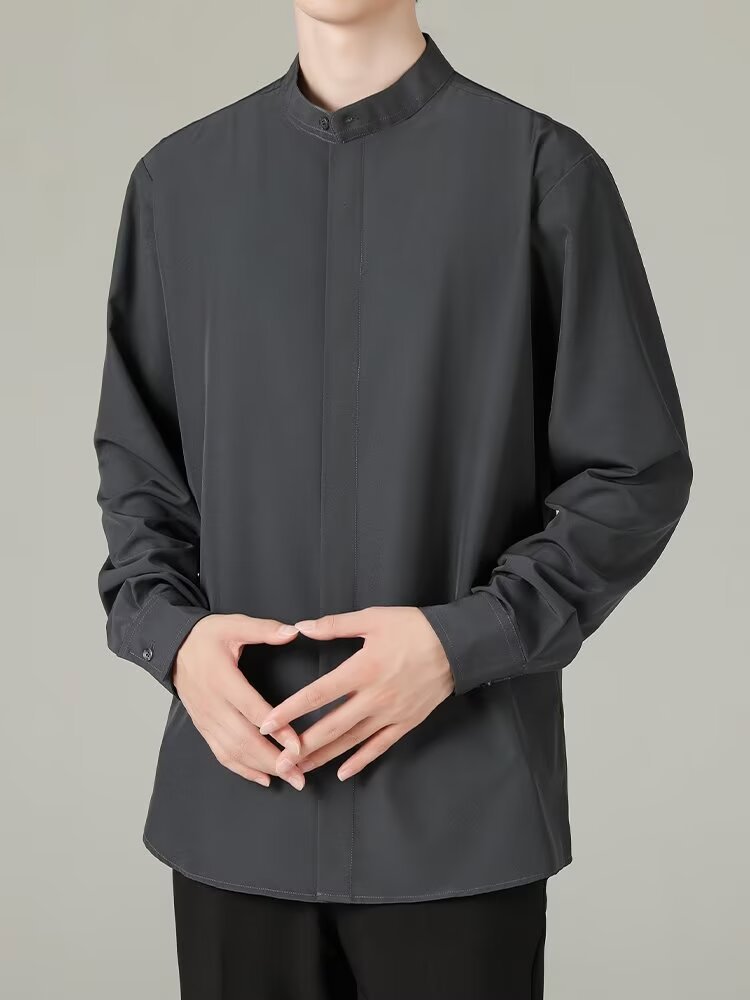 홍콩 스타일의 이너 스탠드 칼라 긴팔 셔츠 남자의 이른 봄 새로운 틈새 셔츠 고급 아이스 실크 드레이프 화이트 셔츠