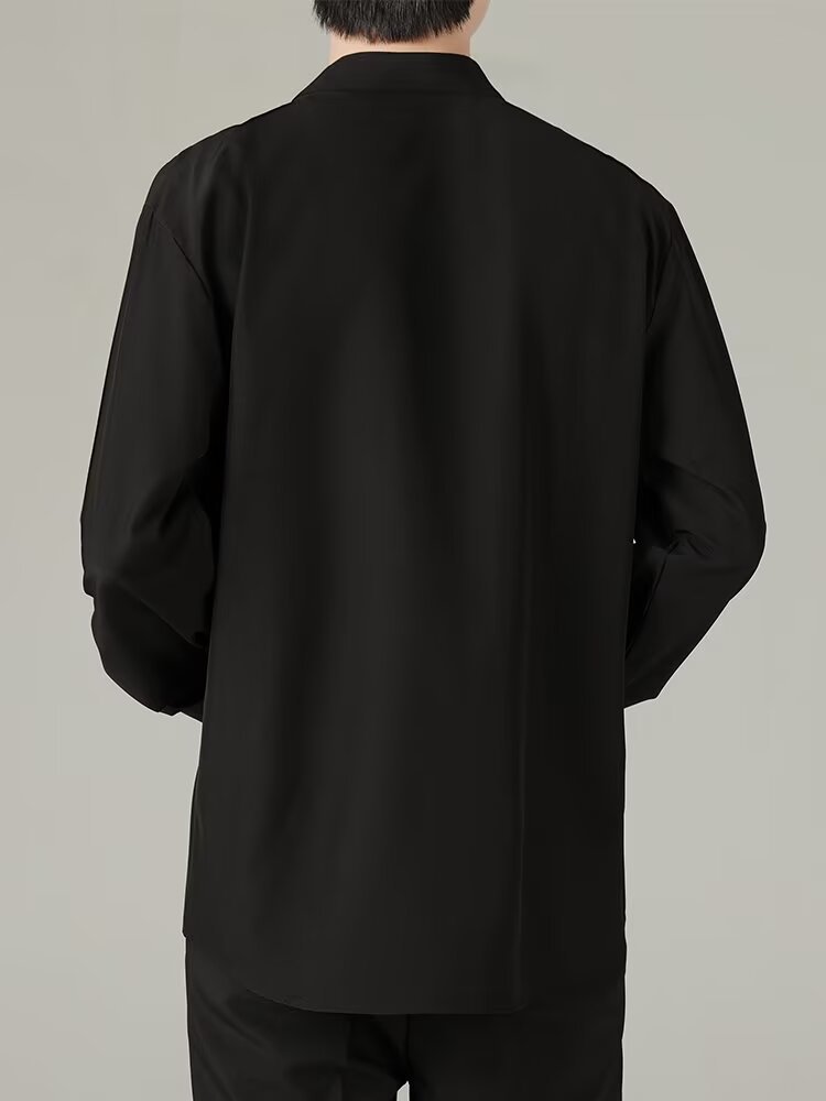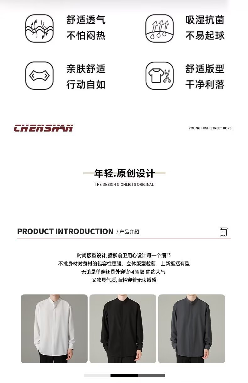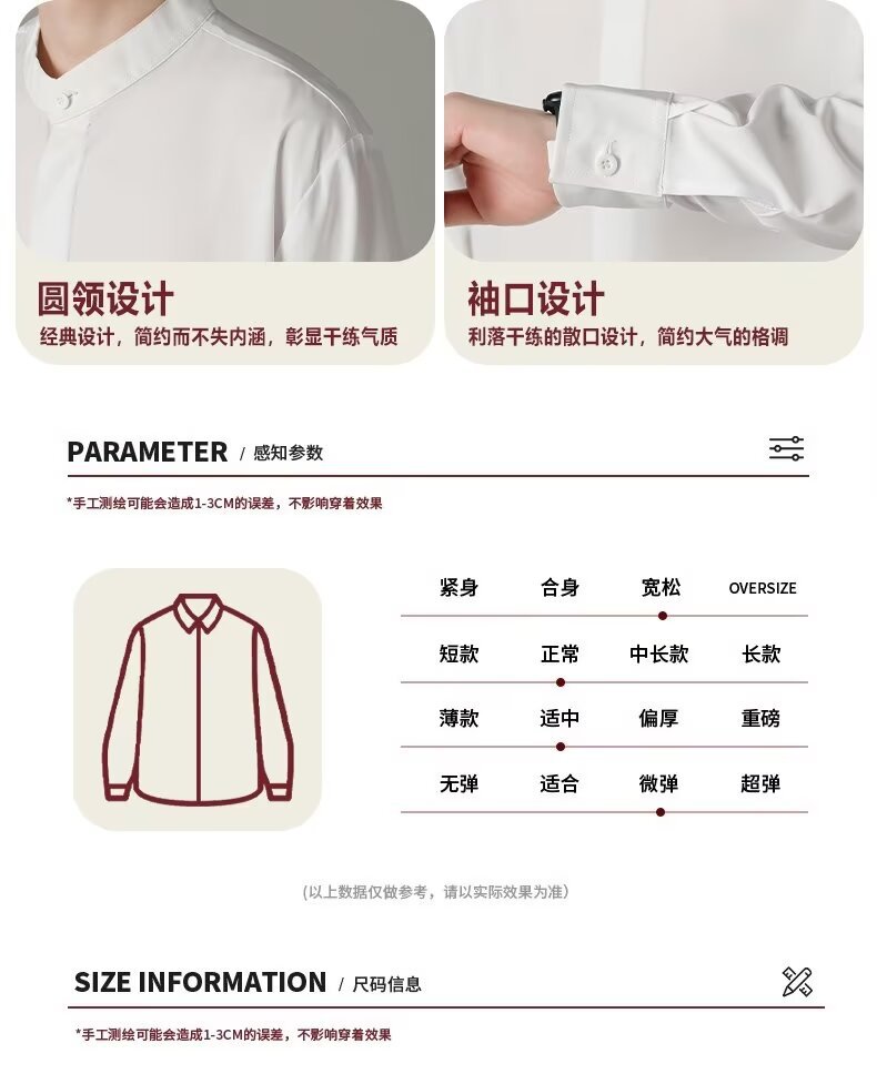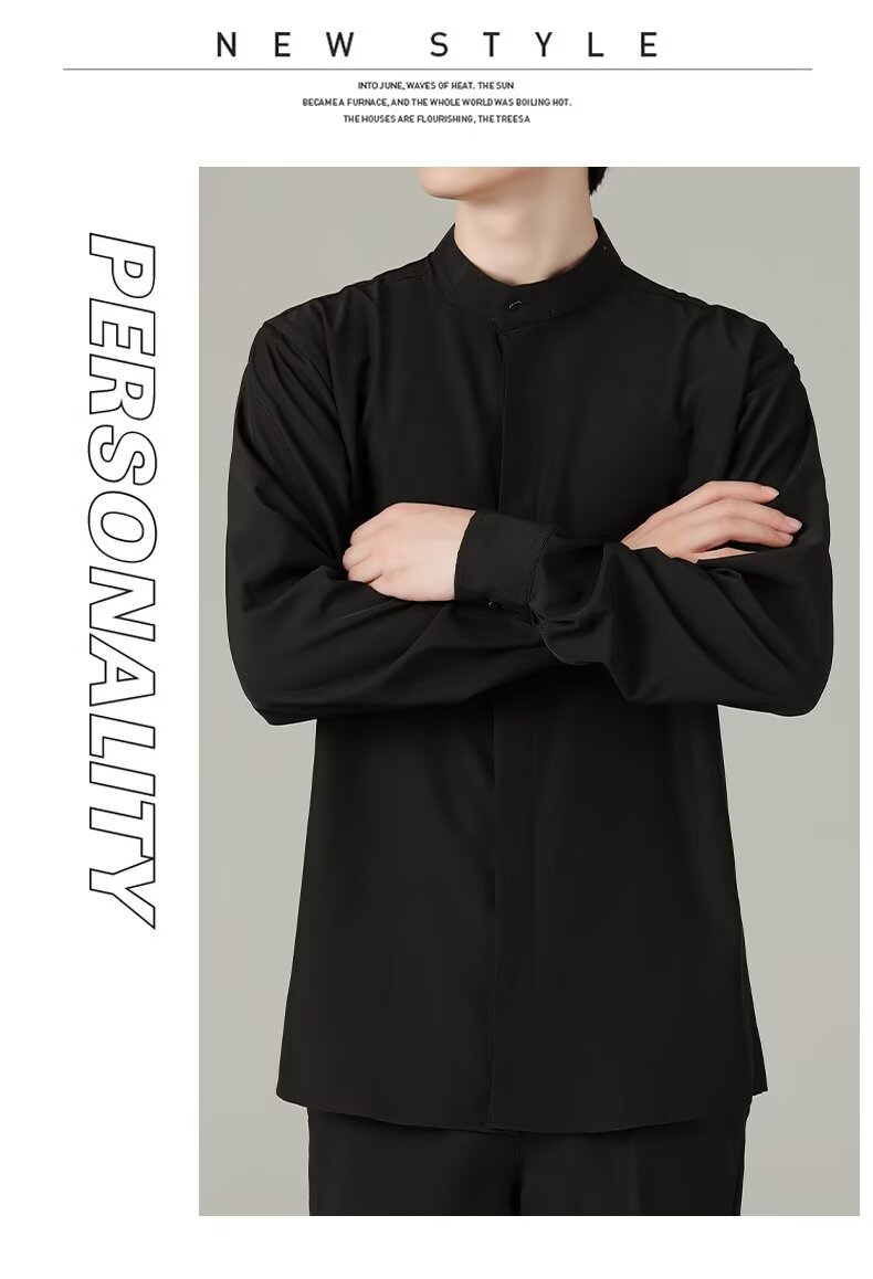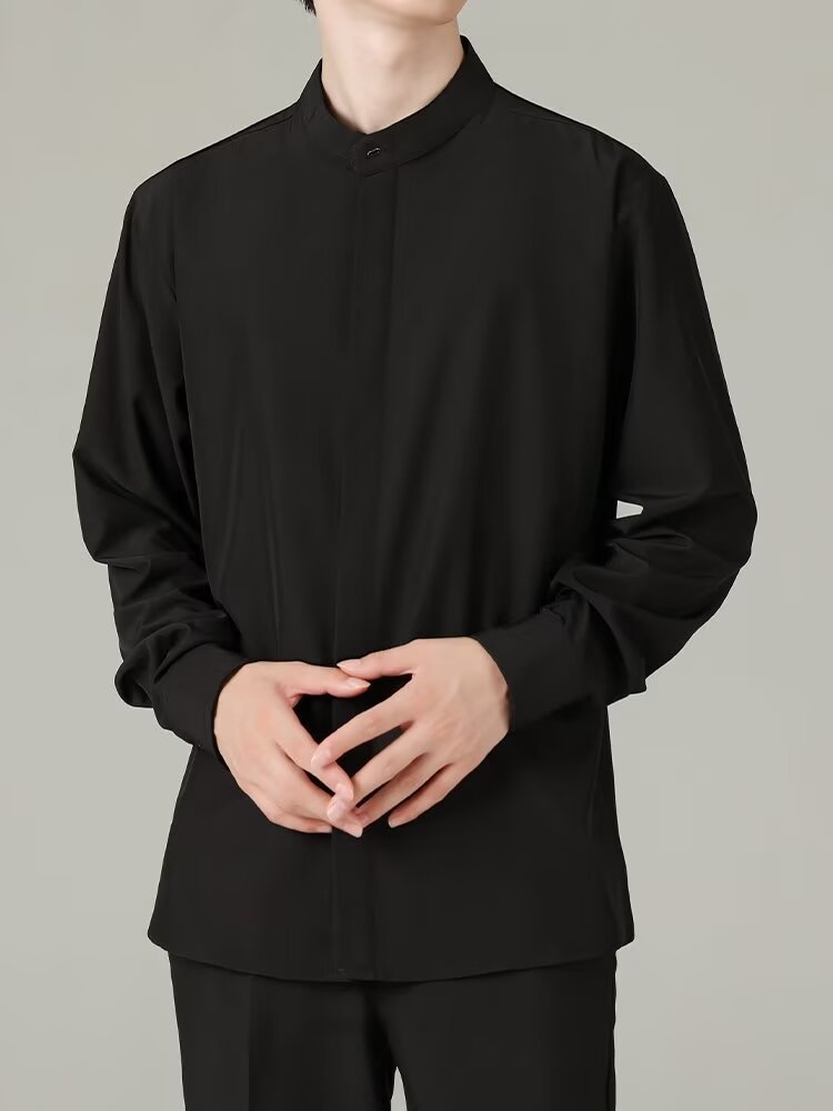 홍콩 스타일의 이너 스탠드 칼라 긴팔 셔츠 남자의 이른 봄 새로운 틈새 셔츠 고급 아이스 실크 드레이프 화이트 셔츠