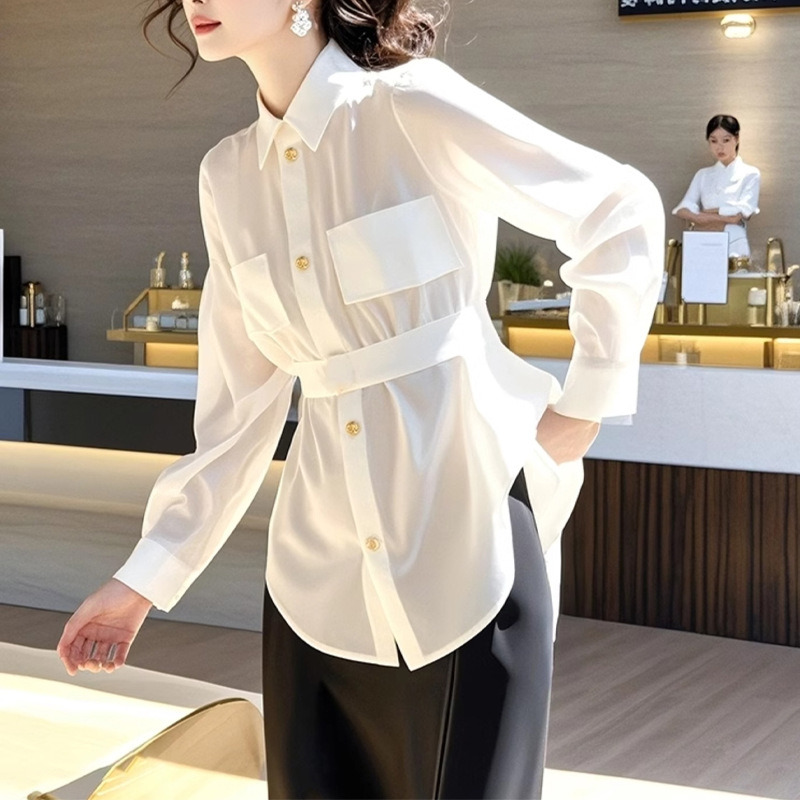 가을 2024 서양식 고급 세련된 흰색 긴팔 셔츠 여성용 라이트 성숙한 프랑스 틈새 전문 타이트 허리 탑스토어 가기