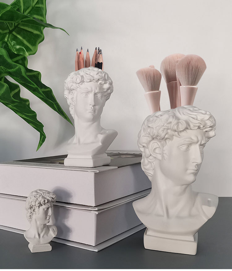 大号大卫:是单独包装,pp袋+保利龙(泡沫)+纸盒,中间是空心的可以插花,插笔,插化妆刷等,画画可以做教具。