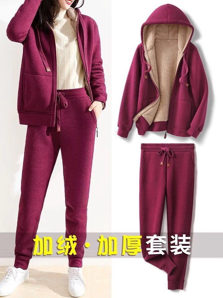 스포츠 캐주얼 세트 여성의 겨울 기모 두꺼운 간단한 단색 슬리밍 긴 소매 후드 짧은 자켓 트렌디 한 스포츠 바지스토어 가기
