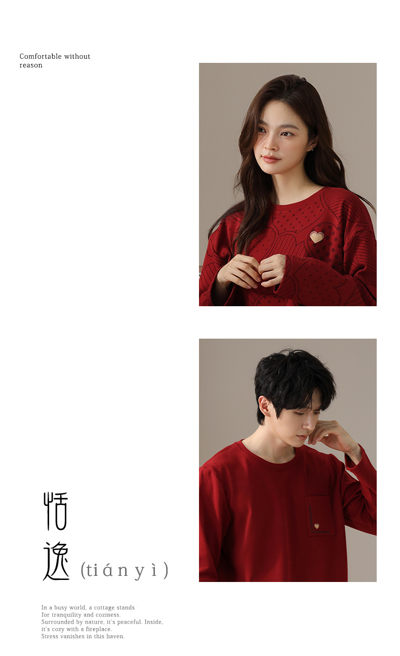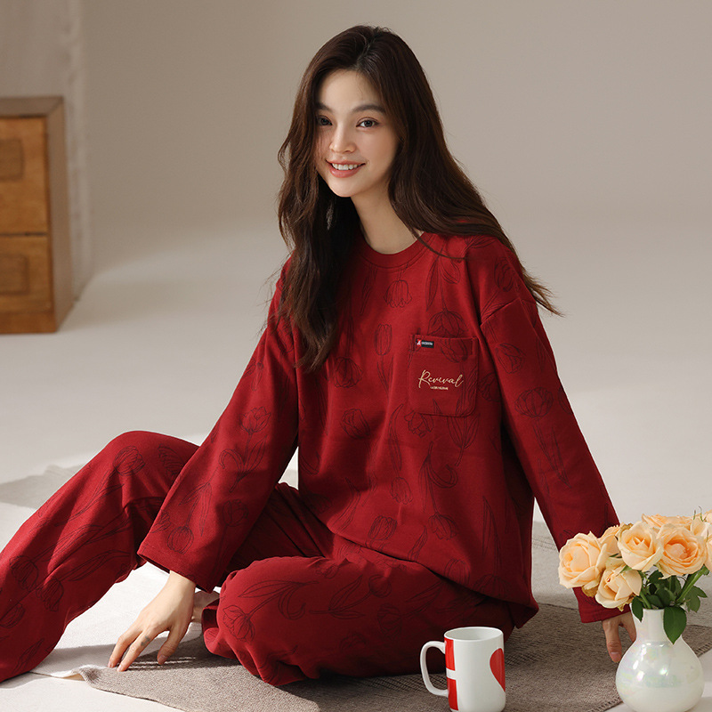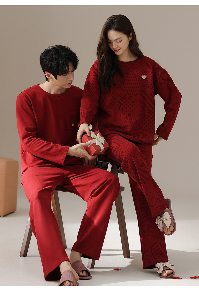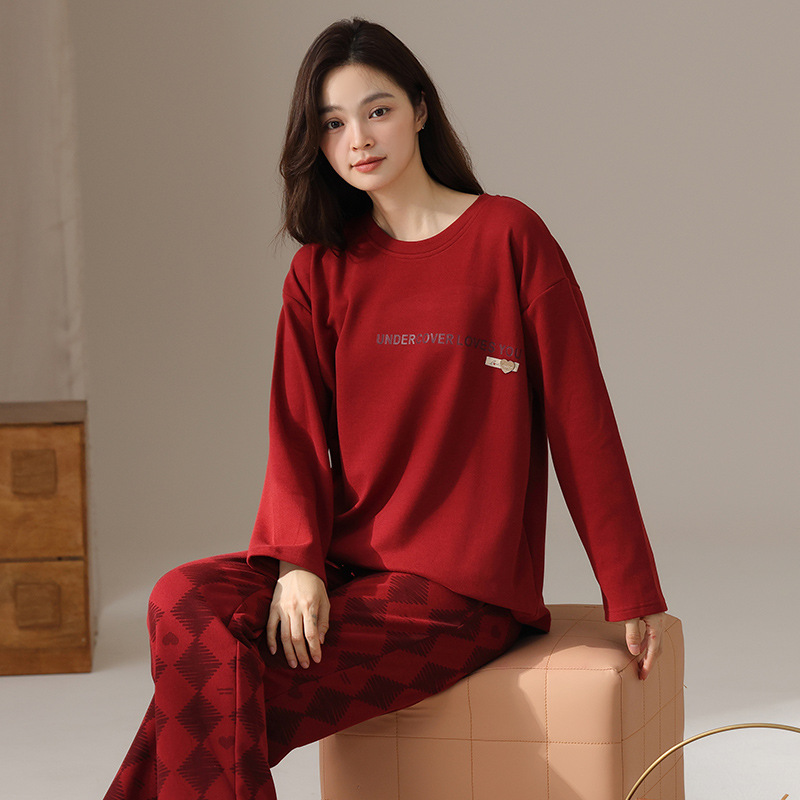 2024 가을/겨울 빨간 독일 벨벳 파자마 크루 넥 풀오버 커플 신혼 따뜻한 집 옷 세트 얇은 벨벳스토어 가기