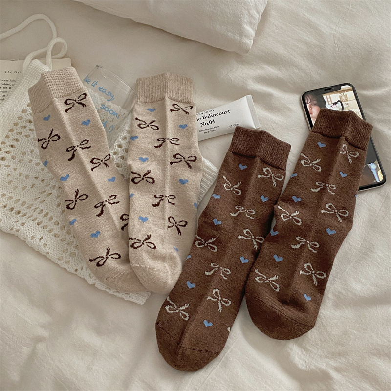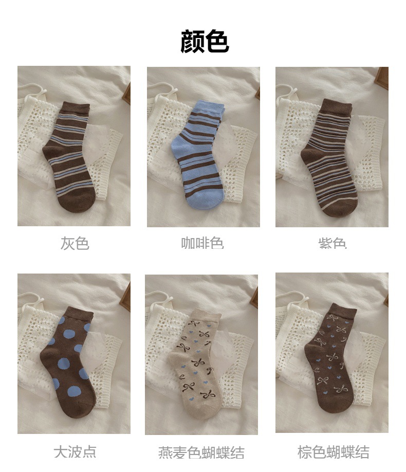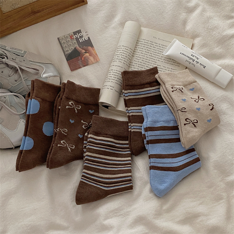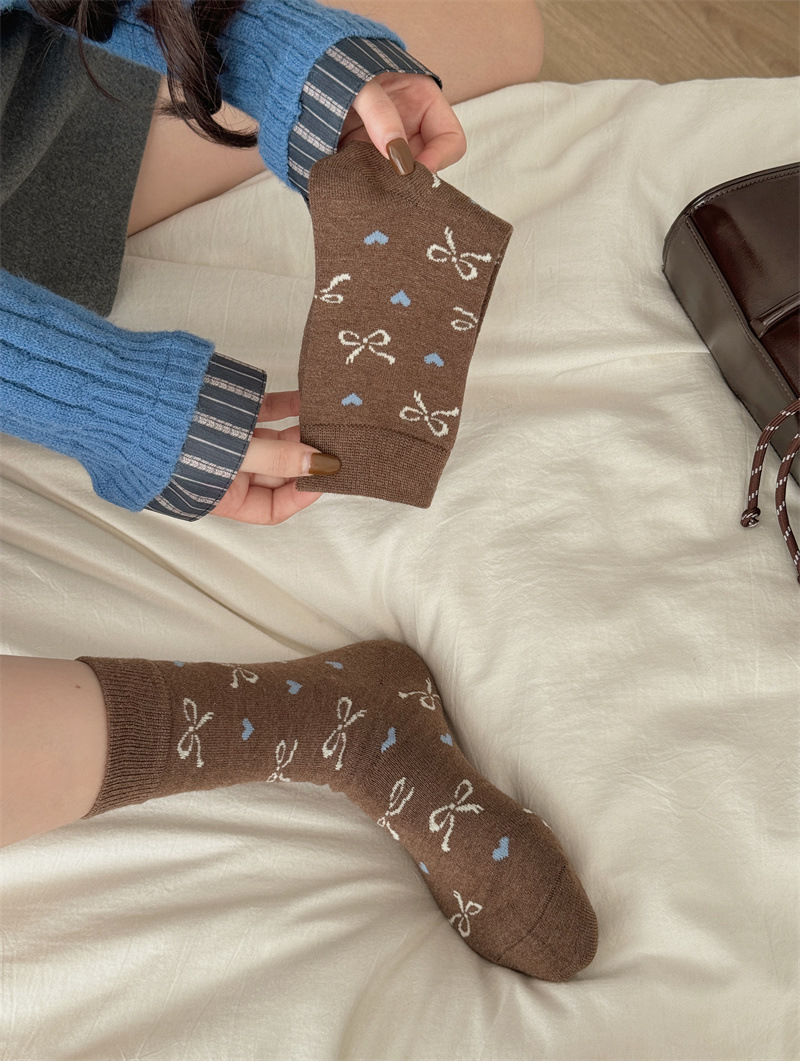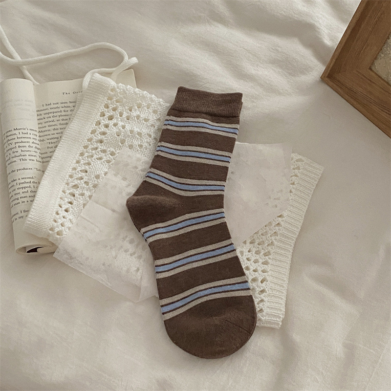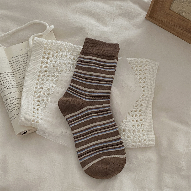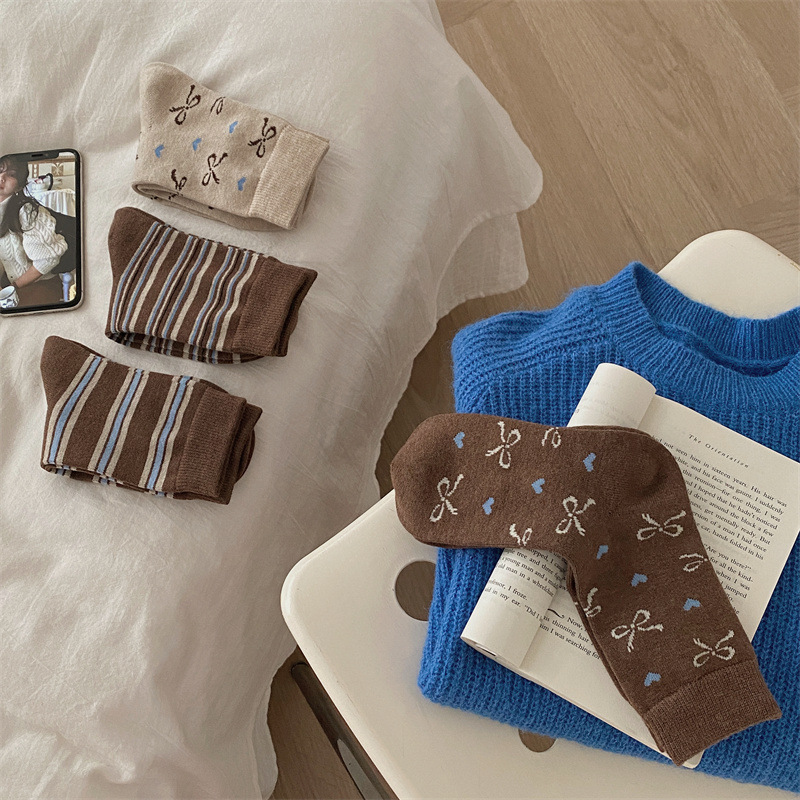 양말은 가을과 겨울 두꺼운 다크 브라운 줄무늬 양모 미드 튜브 양말 활 뼈없는 스타킹 Maillard 여성용 양말스토어 가기