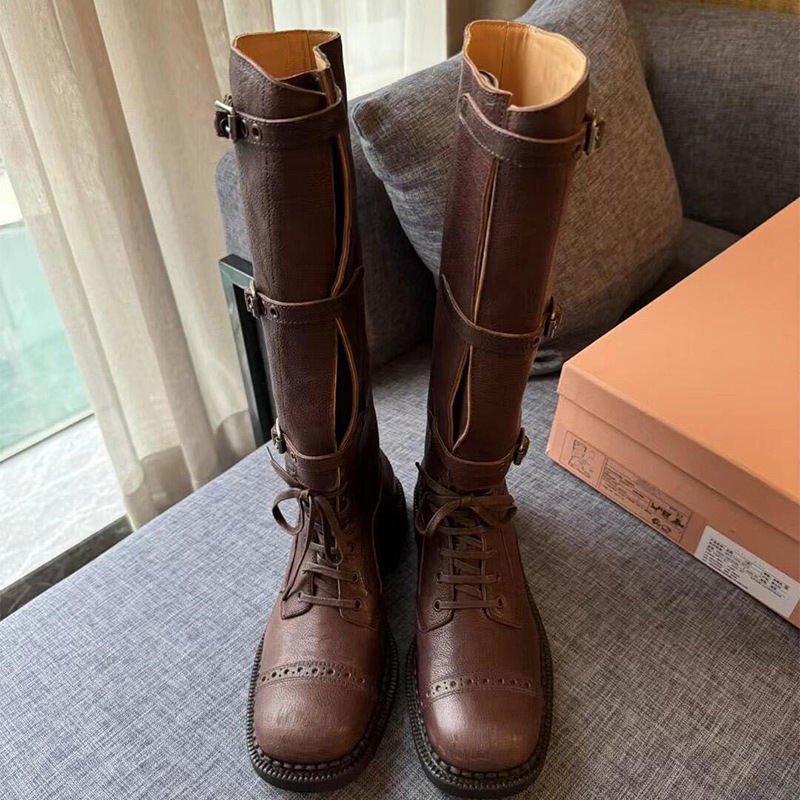Cowhide 버전 Retro miu ~ 홈 강화 패션 부츠 여성용 2024 새로운 스타일 부츠 벨트 버클 올드 나이츠 부츠