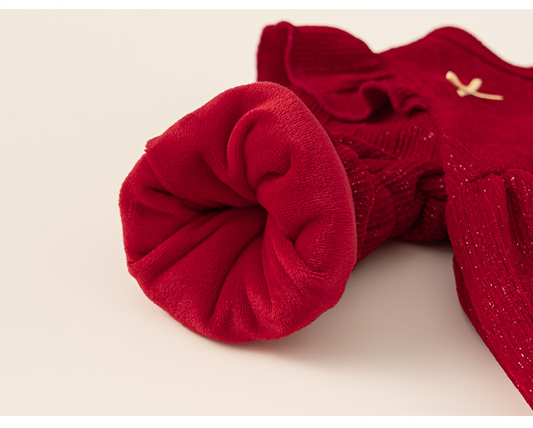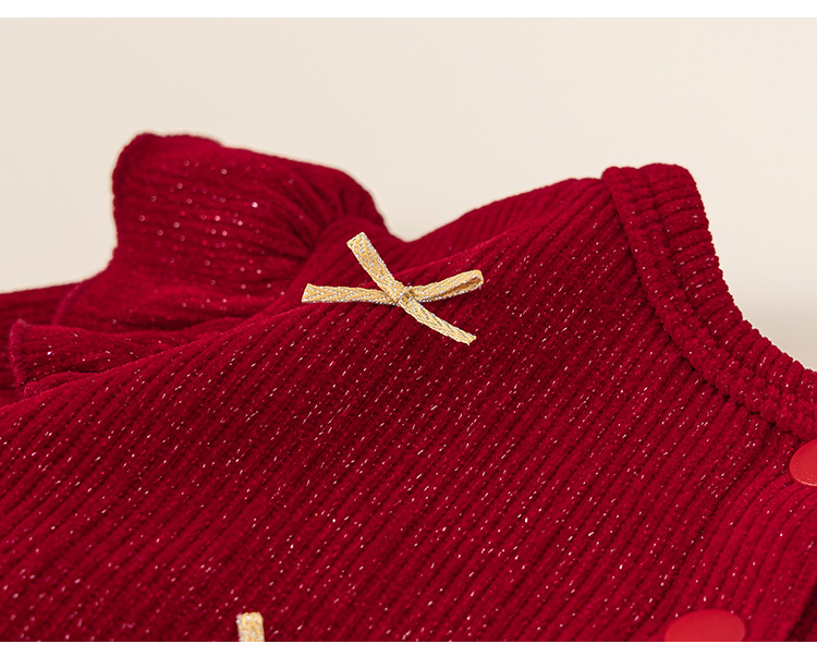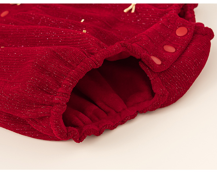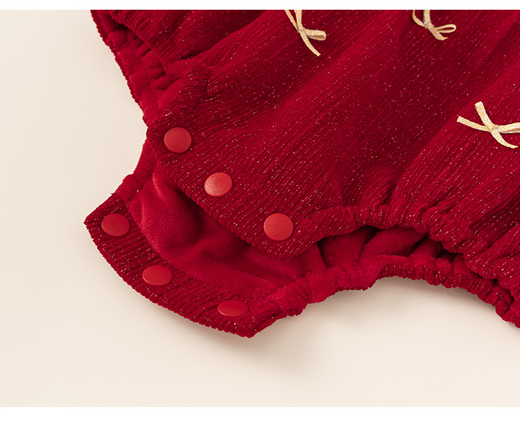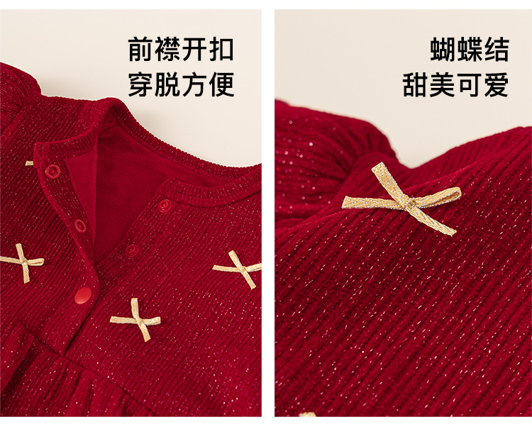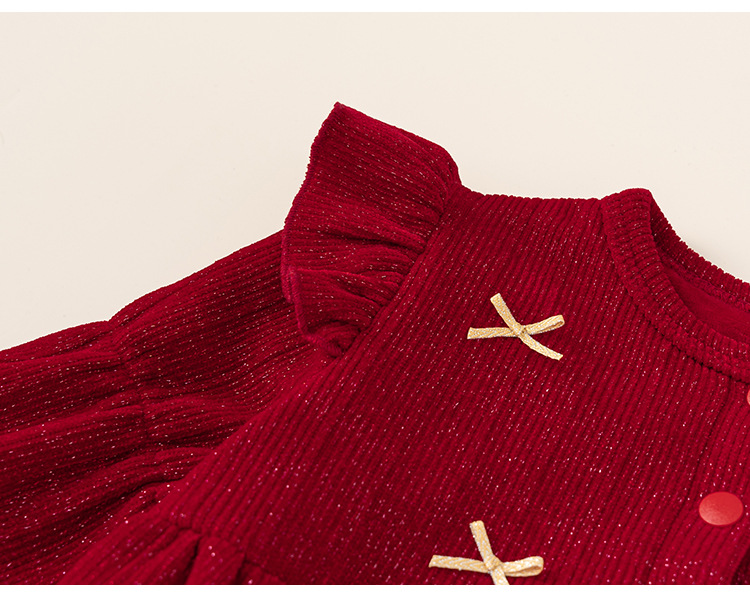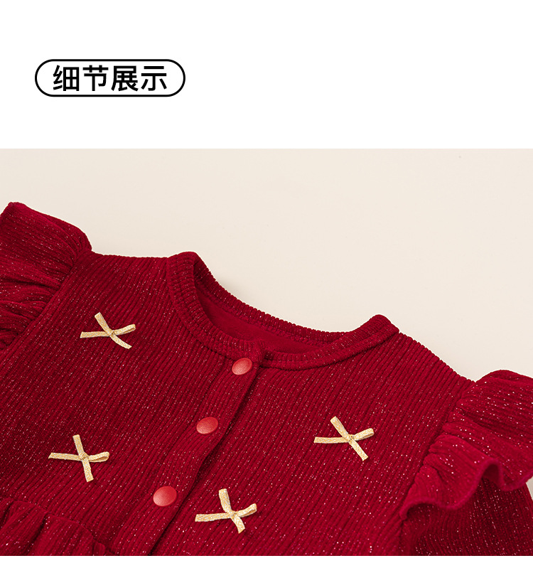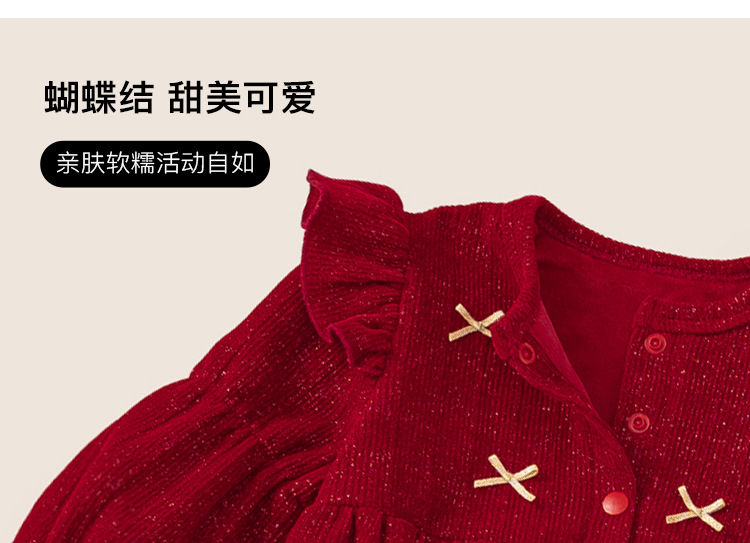 Bang Xuan 2024 겨울 새로운 긴 소매 토끼 빨간 작은 비행 소매 옷 아기 소녀 활 달콤한 좀폰