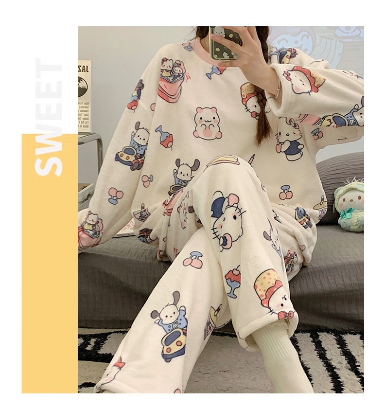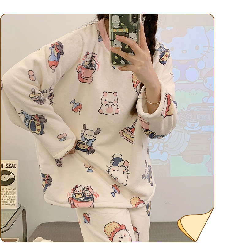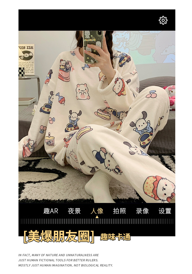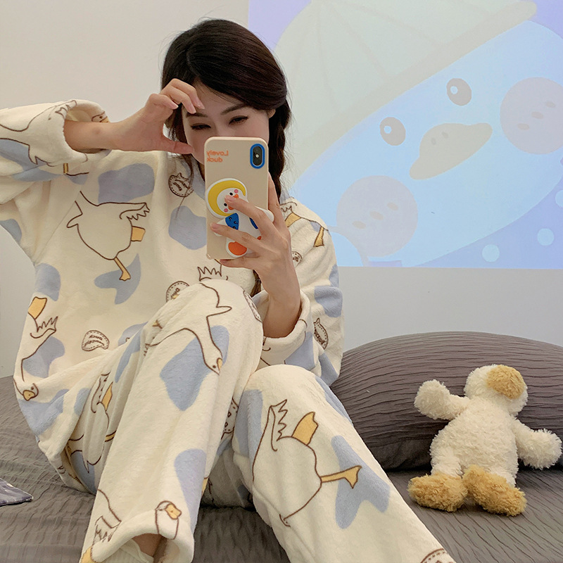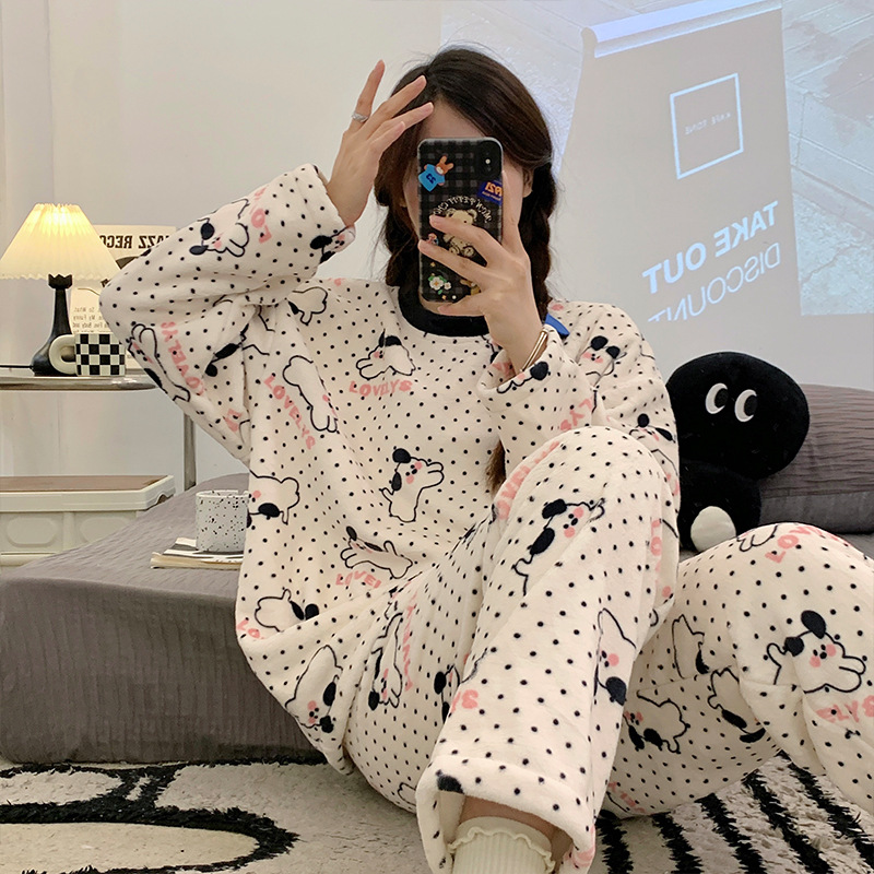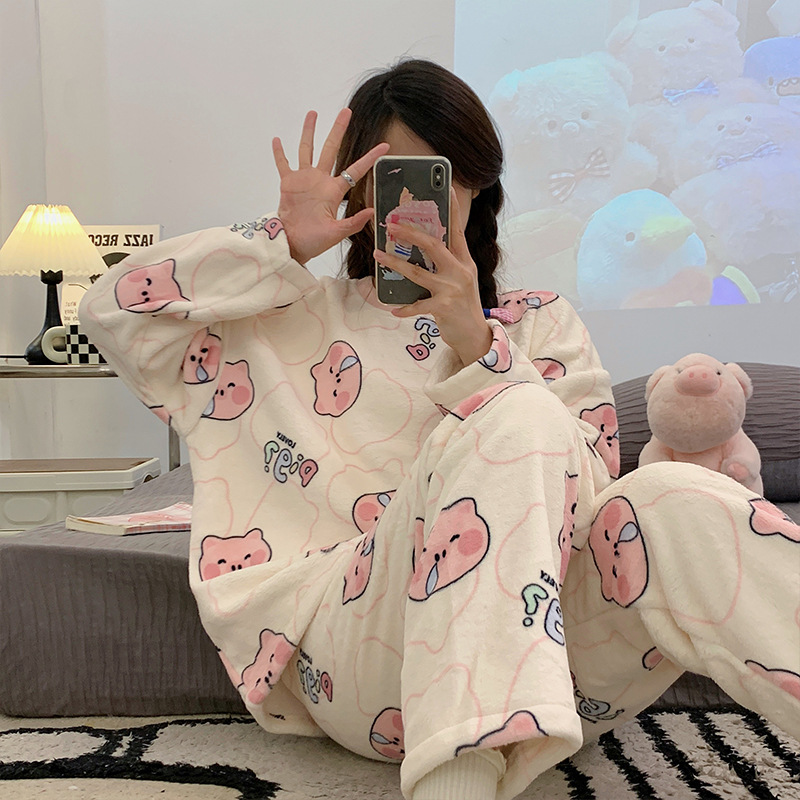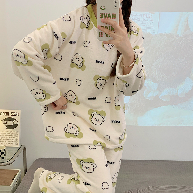 Ins Pajamas 여성의 겨울 산호 양털 기모 따뜻한 가을과 겨울 학생 귀여운 만화 긴 소매 플란넬 홈 옷스토어 가기