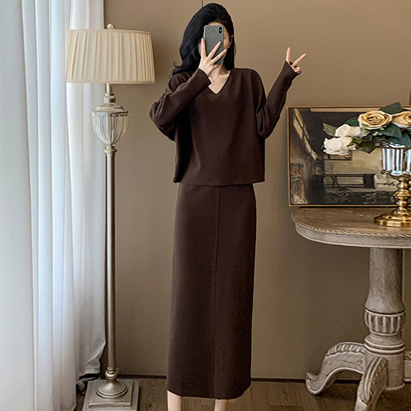 미덕 풀 업 하이 엔드 패션 세트 여성 초가을 V 넥 긴팔 탑 스커트 롱 스커트 투피스 세트스토어 가기