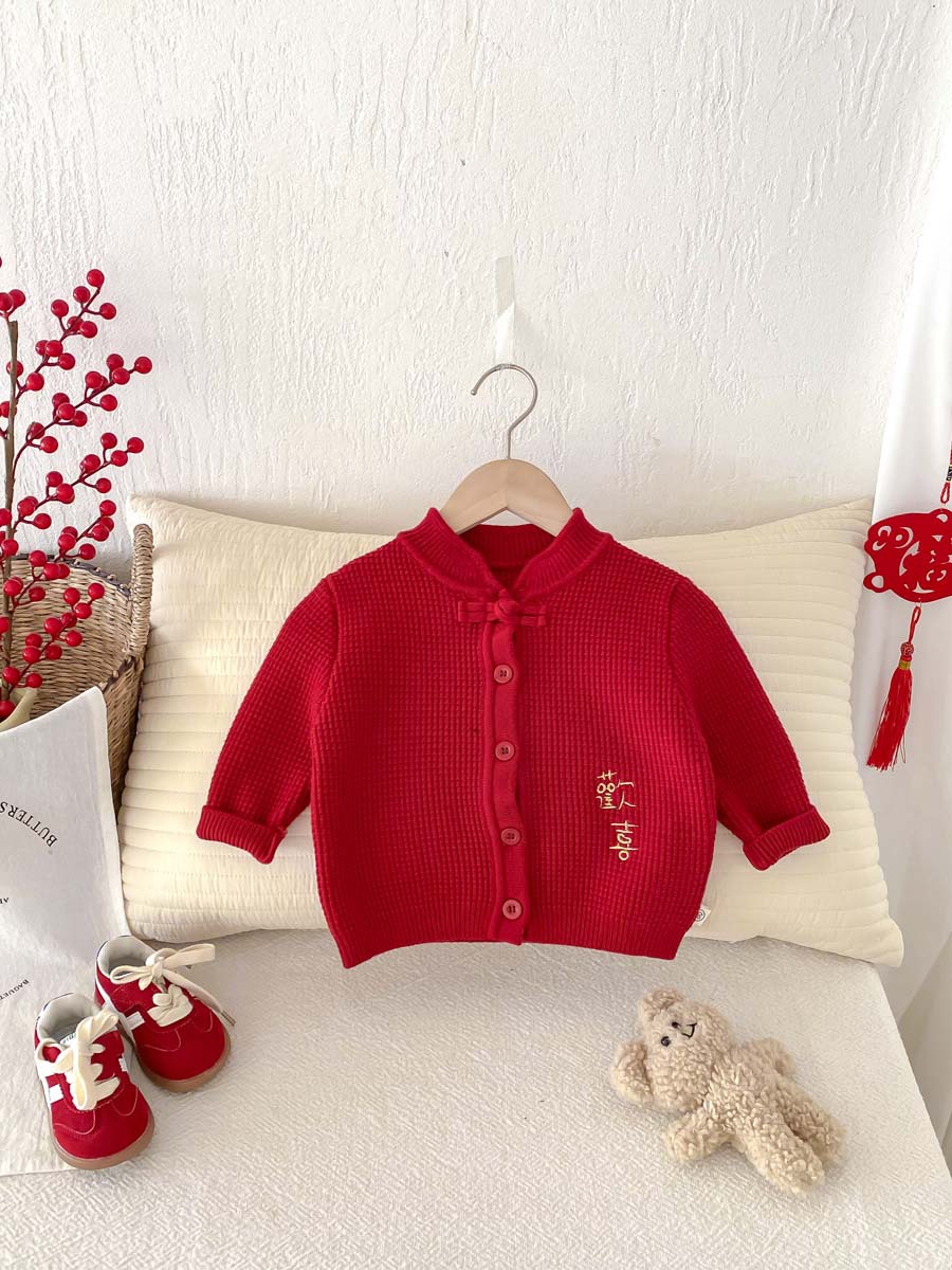 아기 한국 니트 스웨터 코트 어린이 수직 칼라 카디건 소년 소녀를위한 올 매치 빅 레드 신년 옷